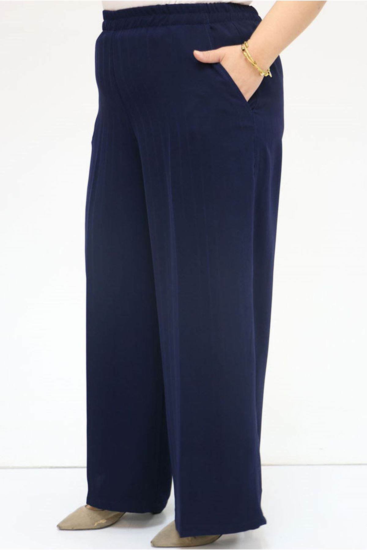 25K49033 - LACİVERT - Büyük Beden Beli Lastikli Çizgili Krep Pantolon