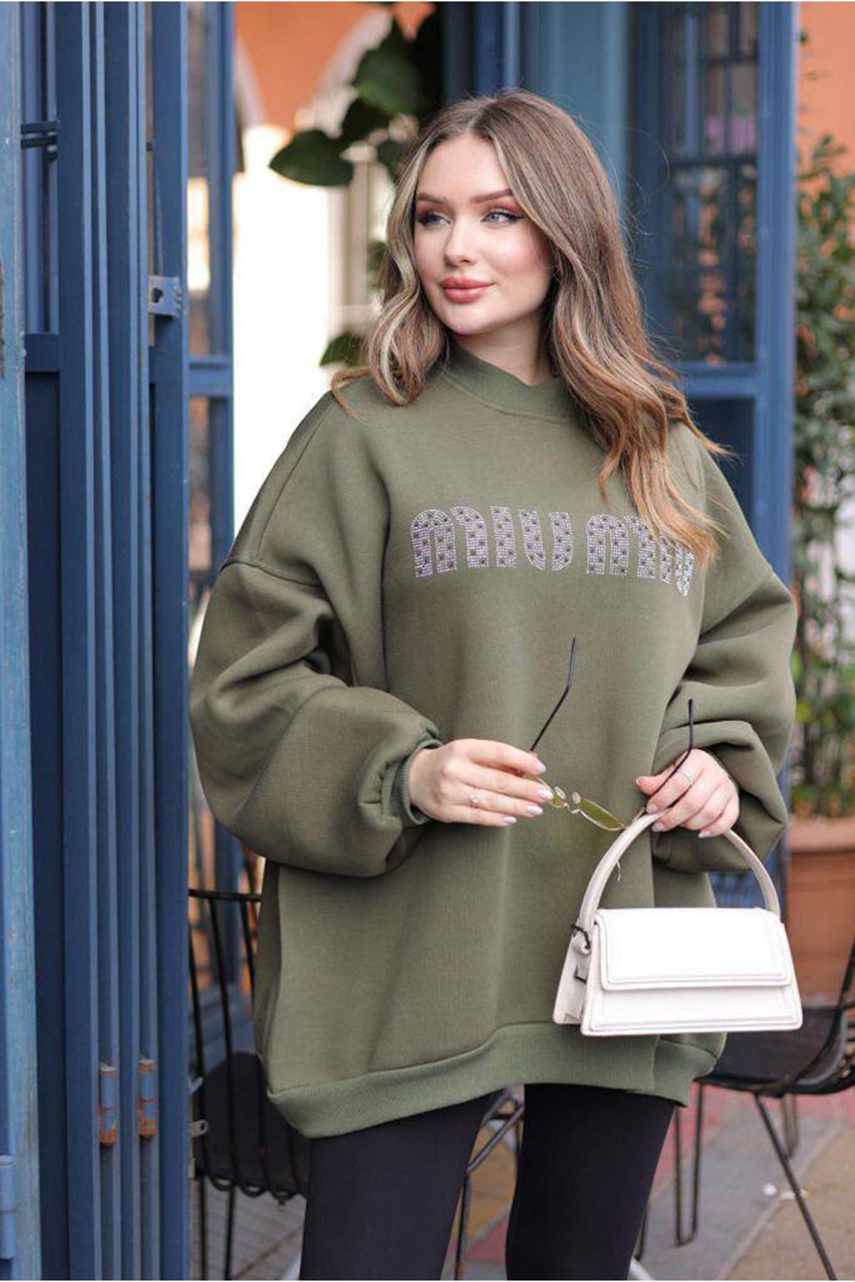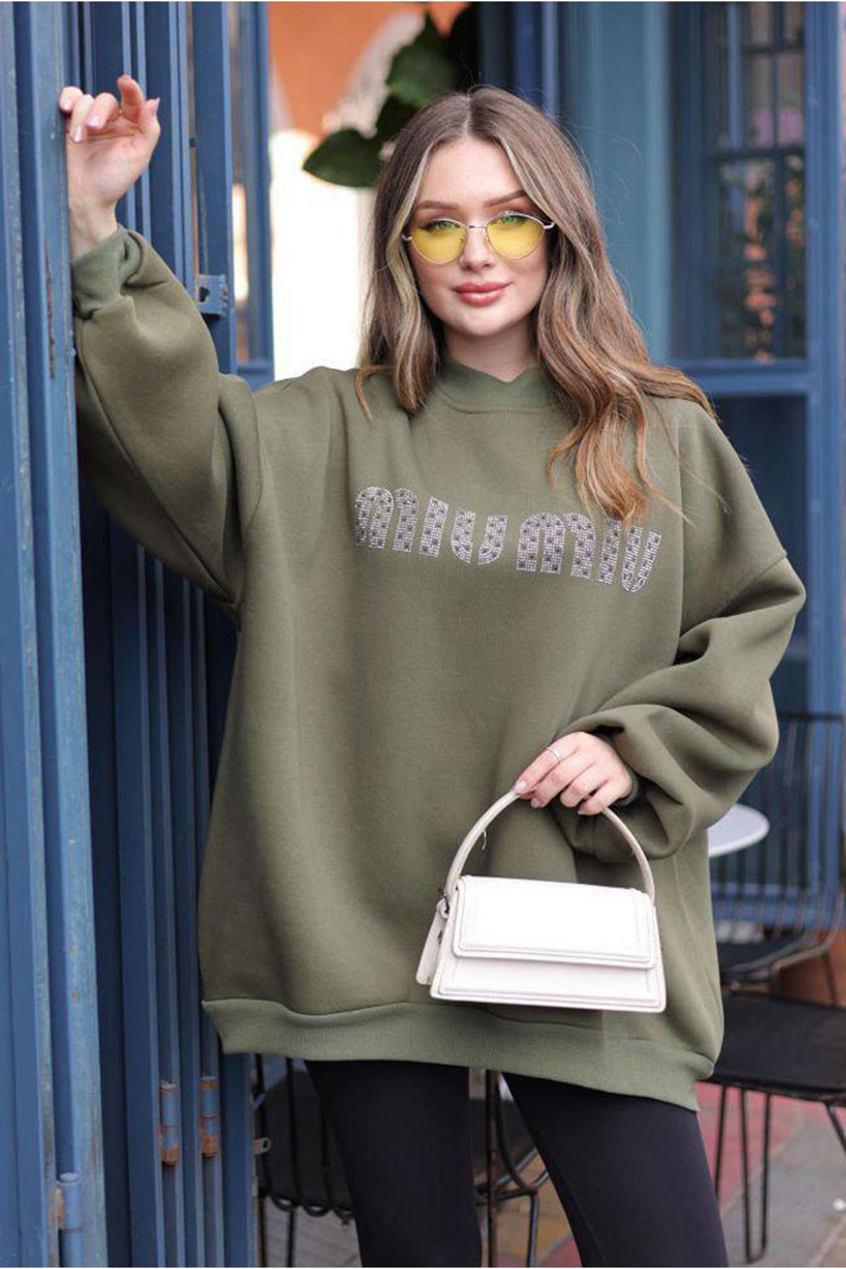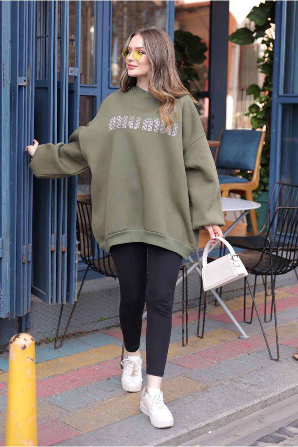 26K4436 - YEŞİL - TAŞ YAZI BASKILI ŞARDONLU SWEAT