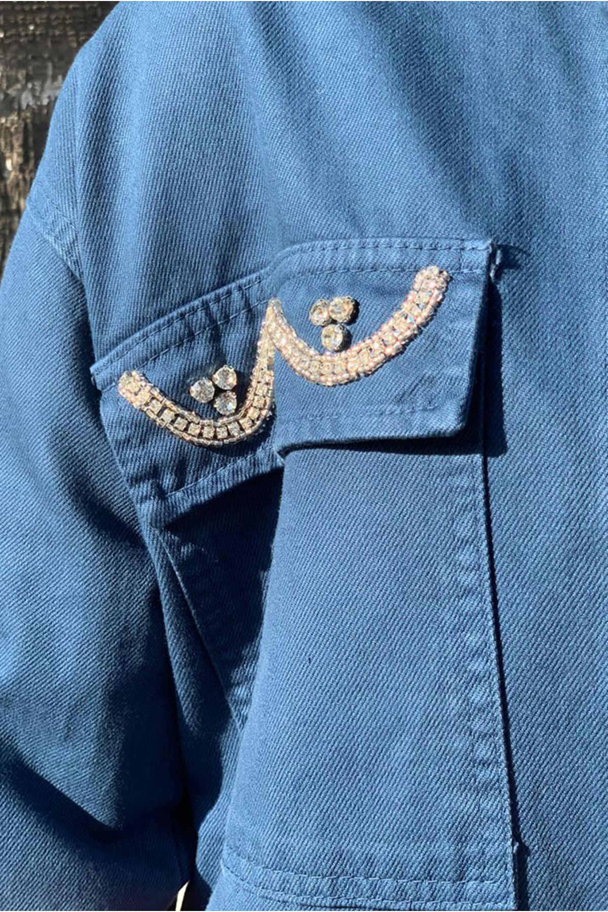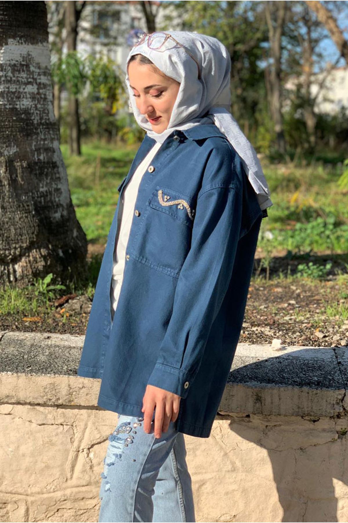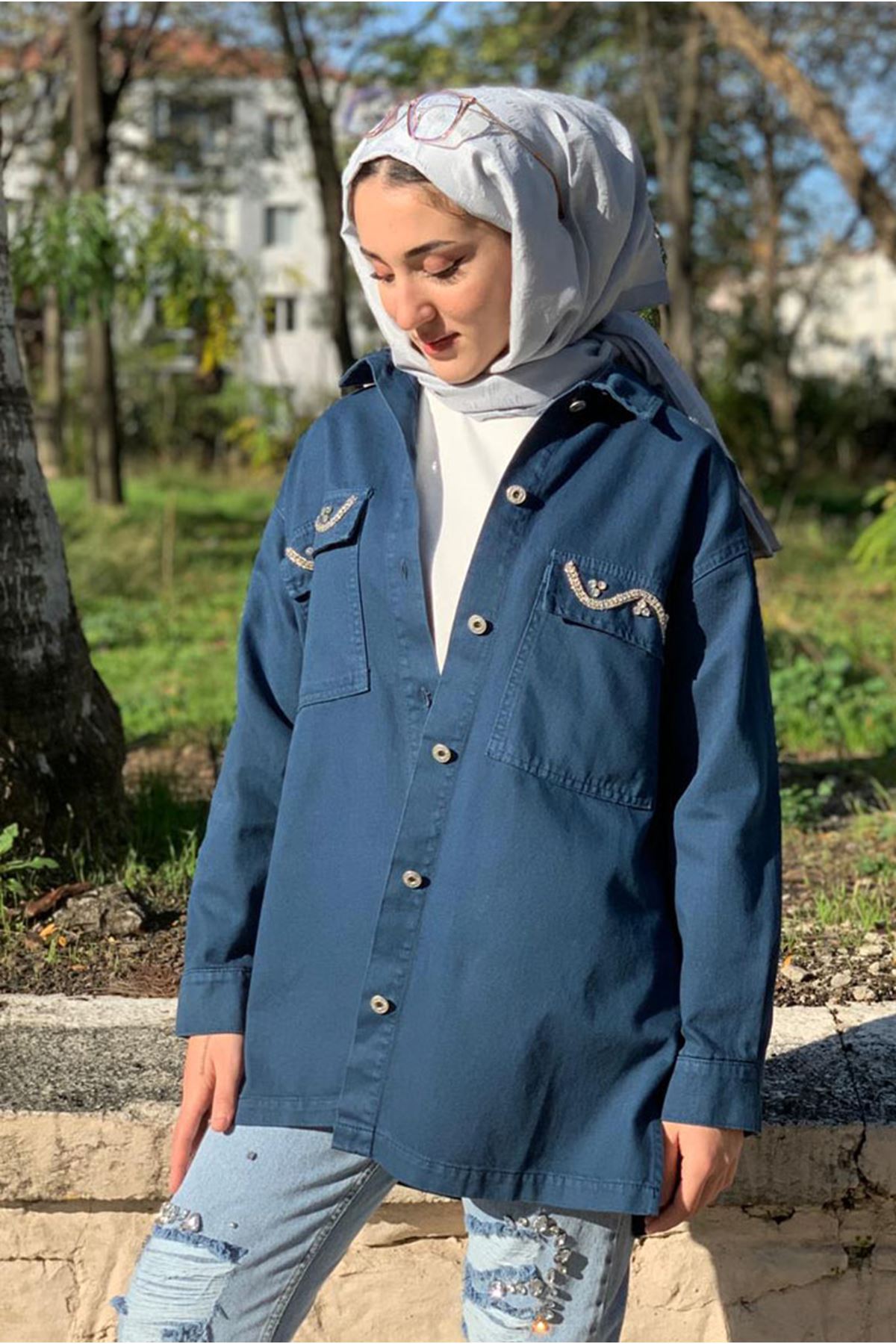 26K5098 - İNDİGO - CEPLERİ DALGA TAŞLI GABARDİN CEKET