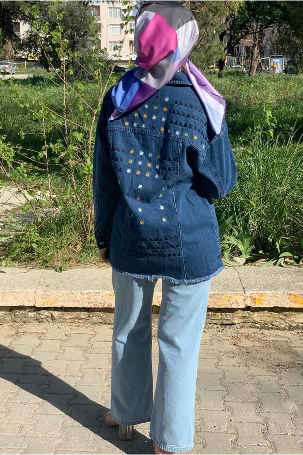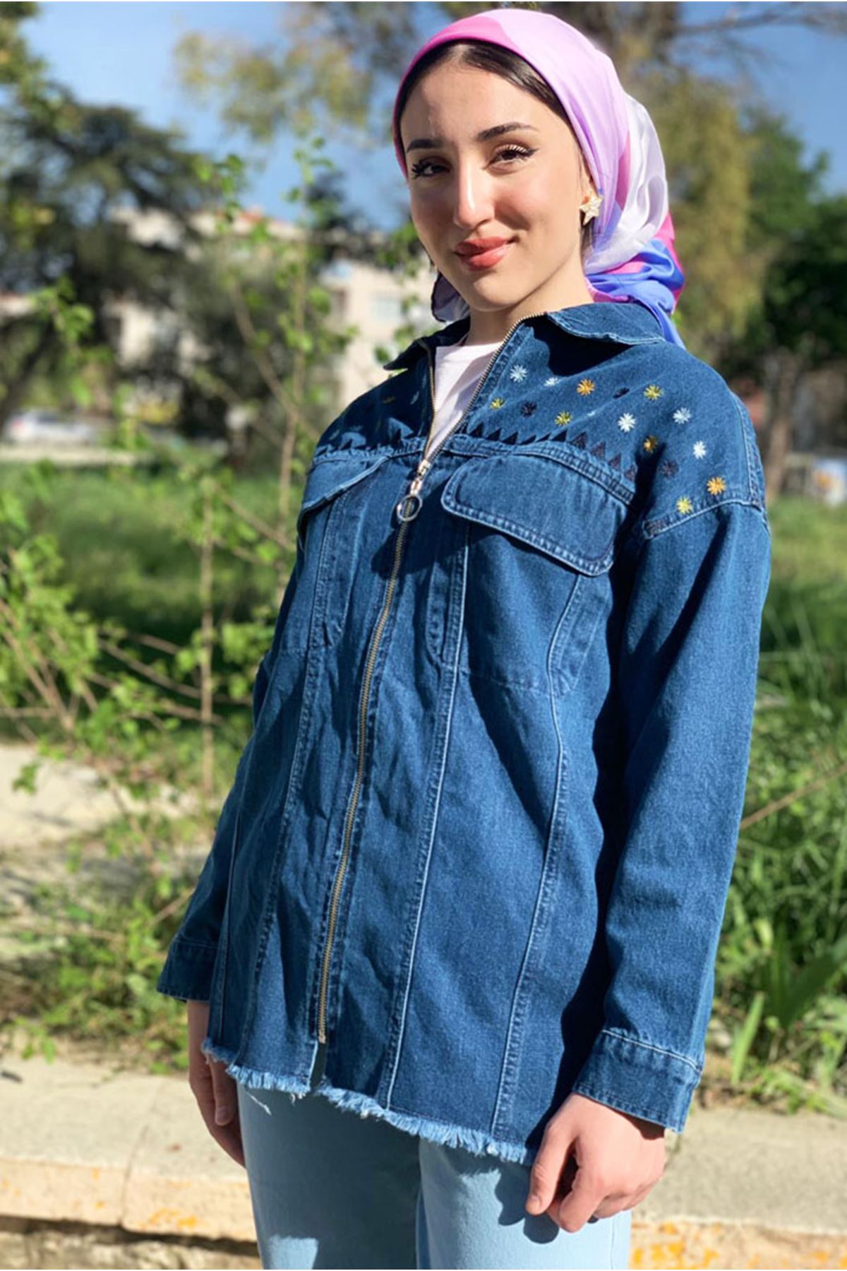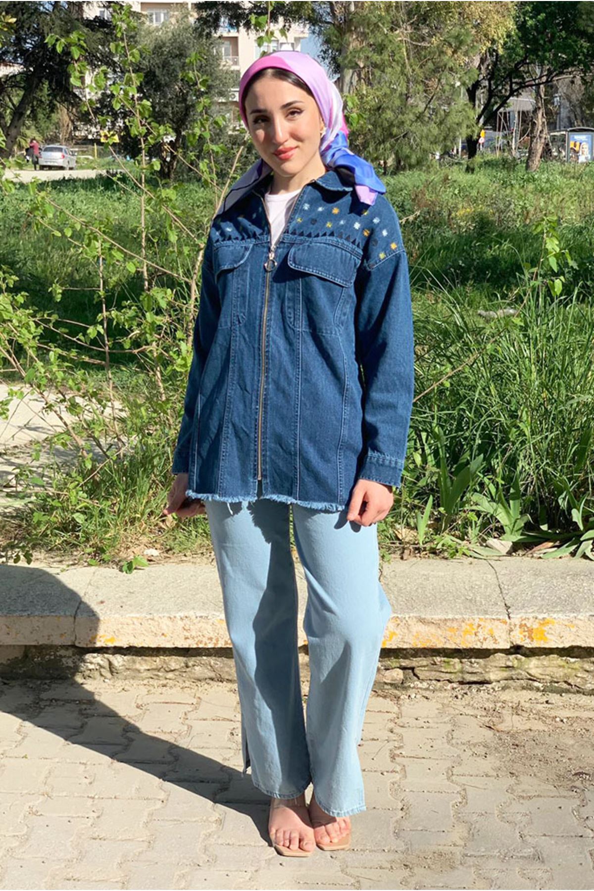 26K5271 - KOYU MAVİ - NAKIŞLI FERMUARLI KOT CEKET