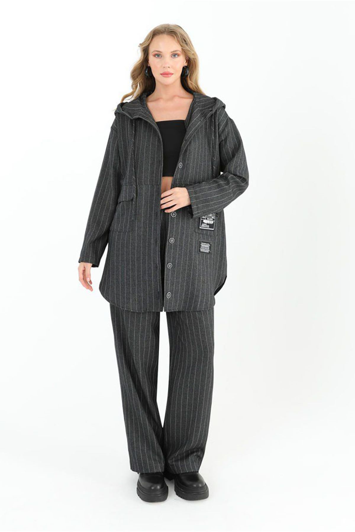 53059 Büyük Beden Kolları Ribanalı Üç İplik Kap - Antrasit