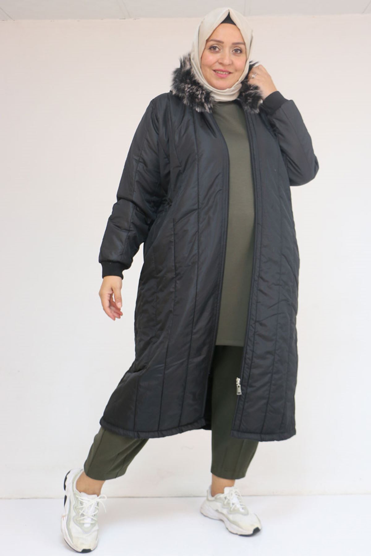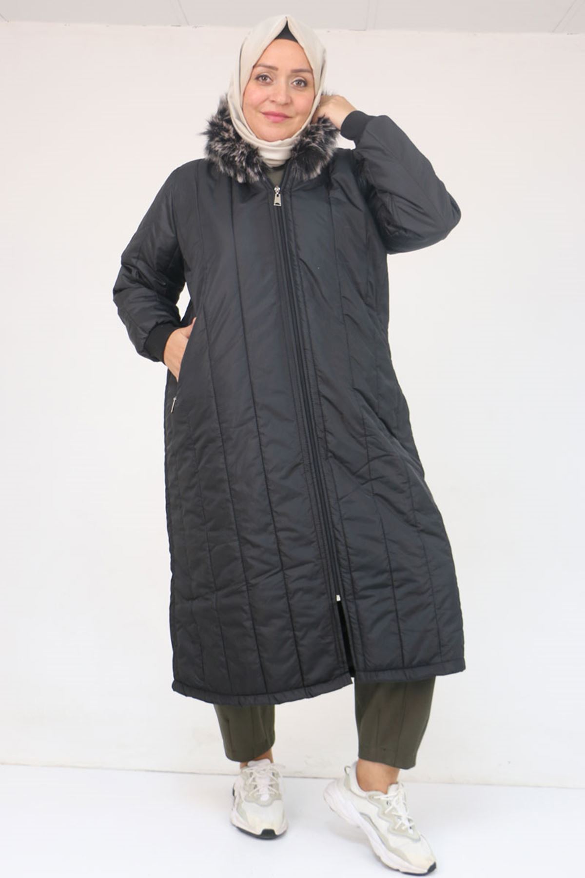 33093 Büyük Beden Kapişonlu Kapitone Ceket-Siyah