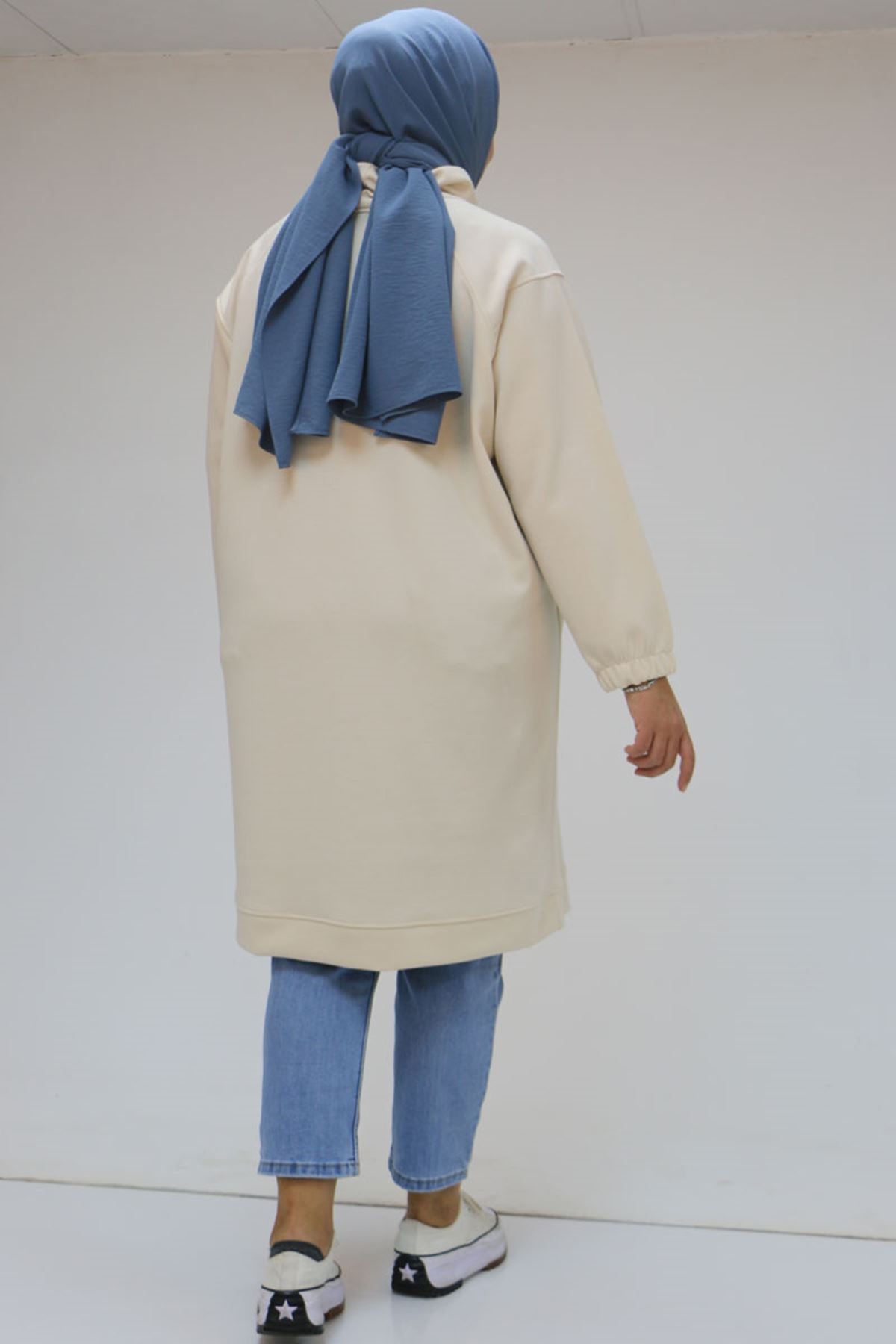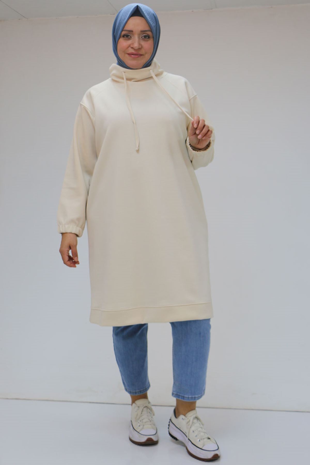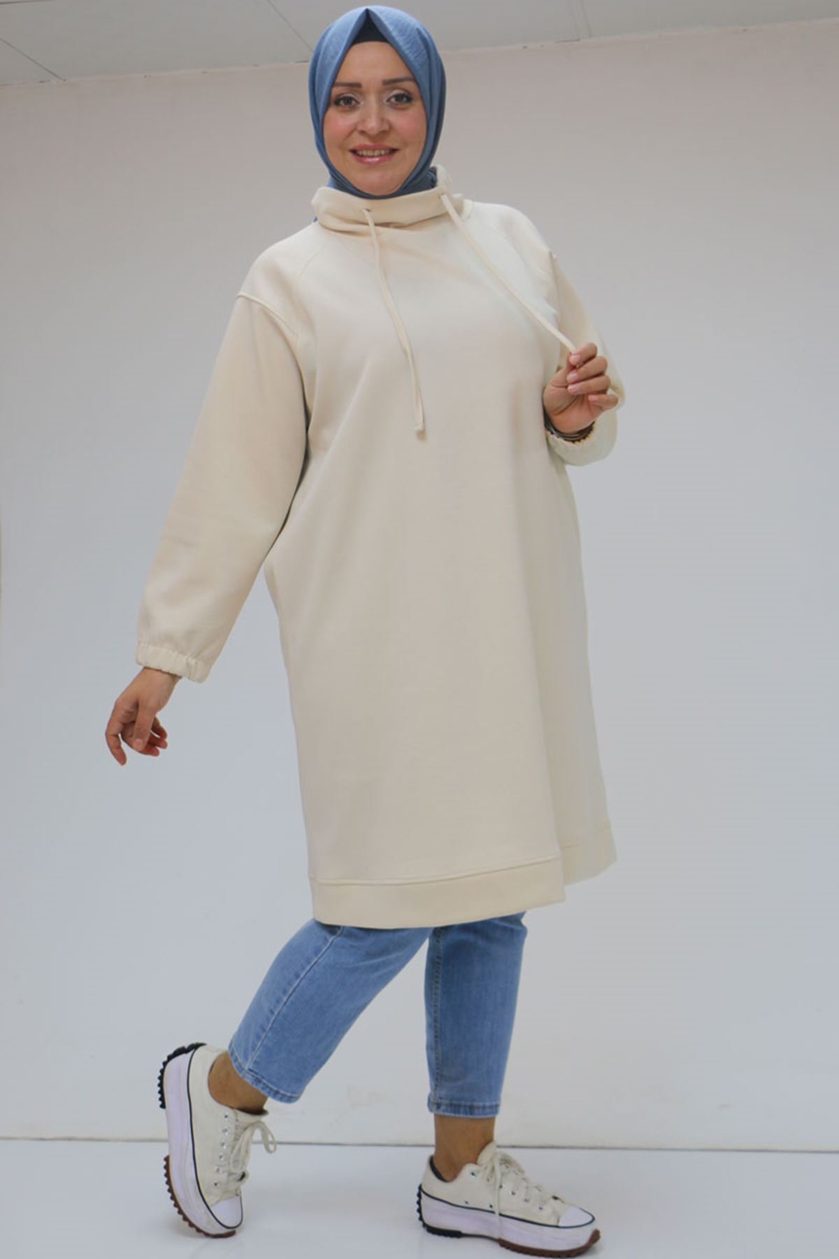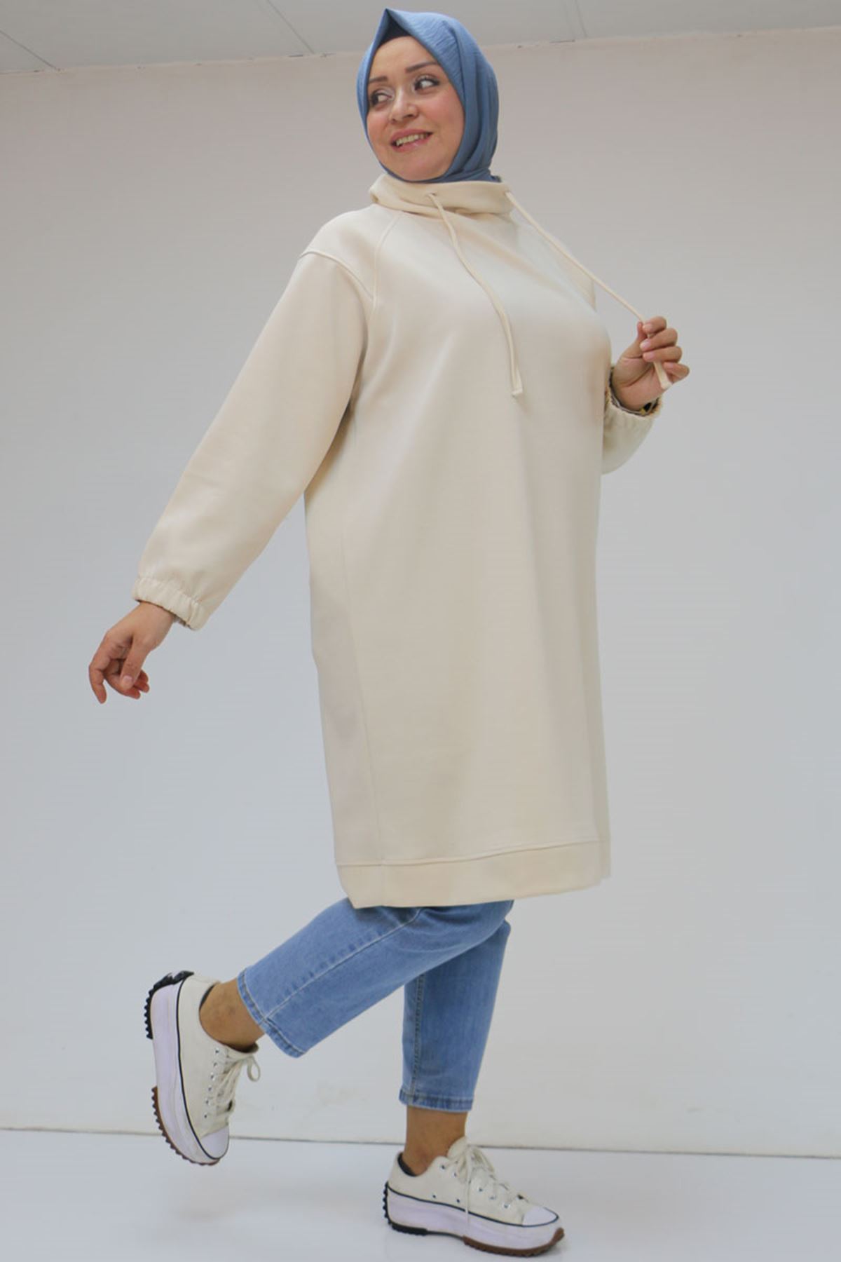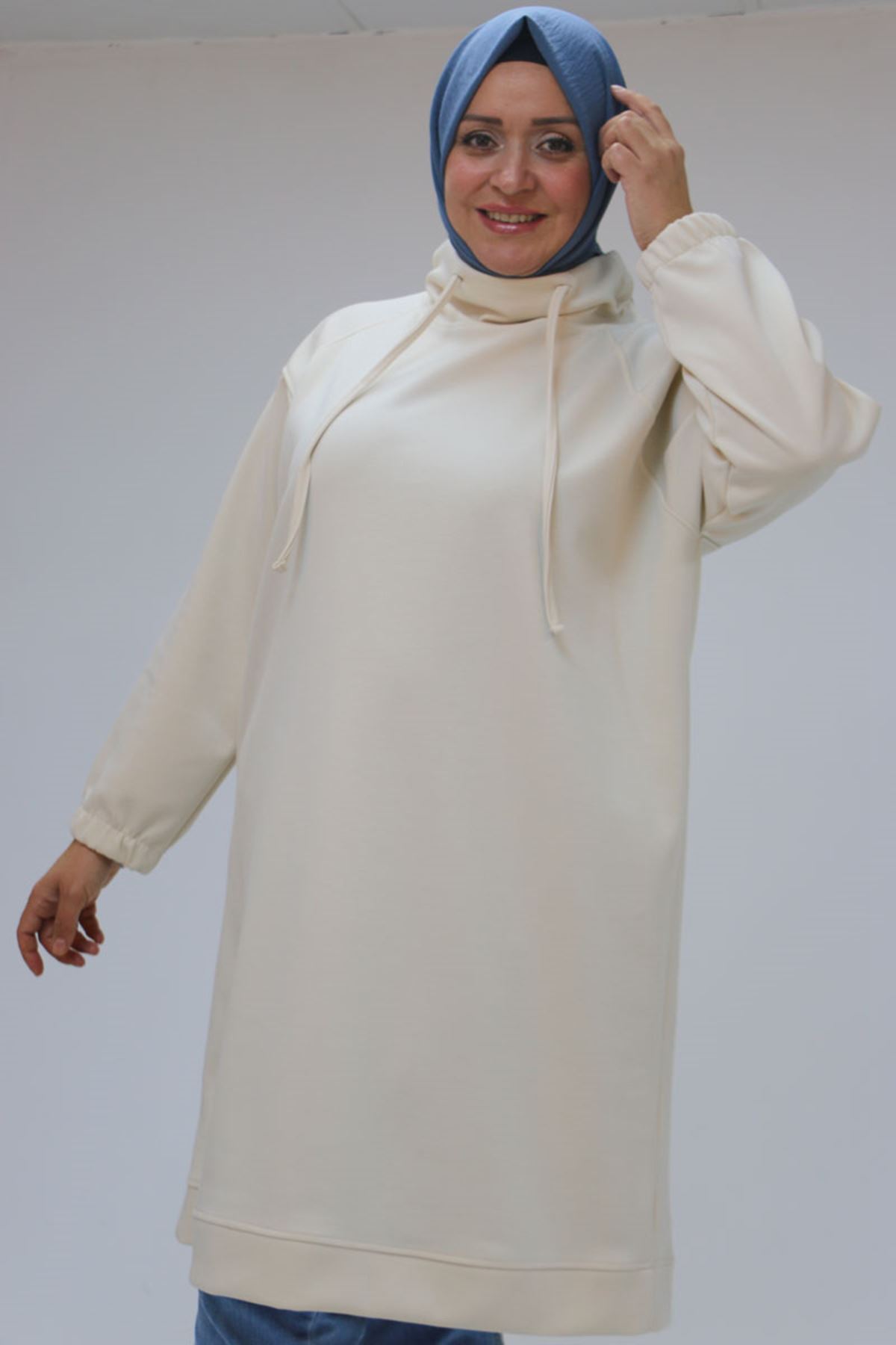 48105 Büyük Beden Boğazlı Yaka Kolu Lastikli Tunik - Bej