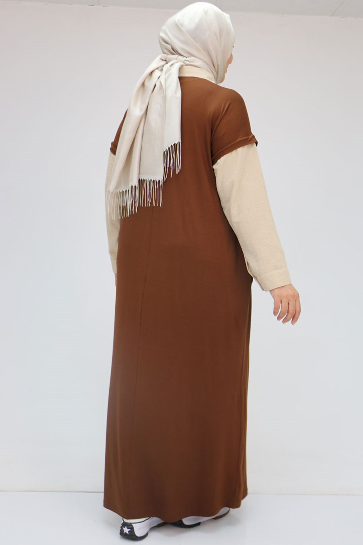 52009 Büyük Beden Kol Ve Yaka Garnili Penye Elbise - Kahve-Bej