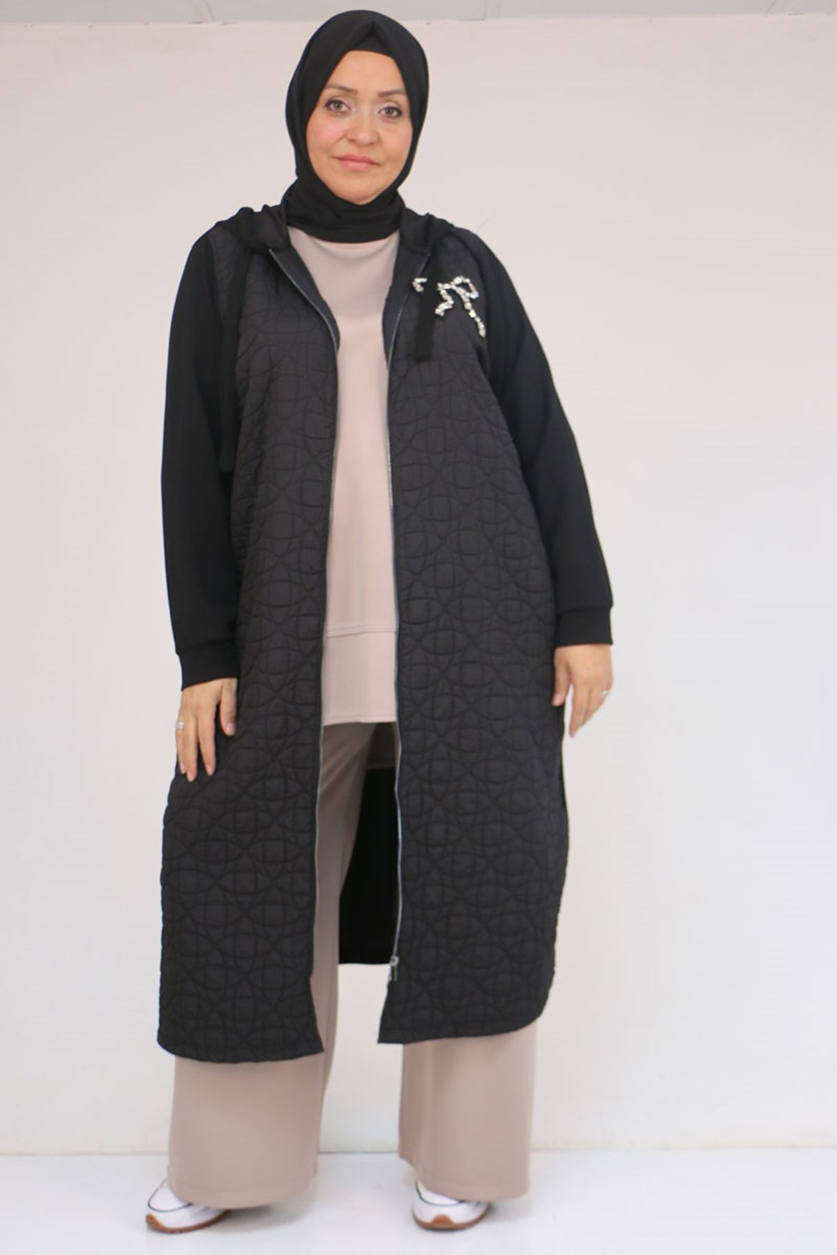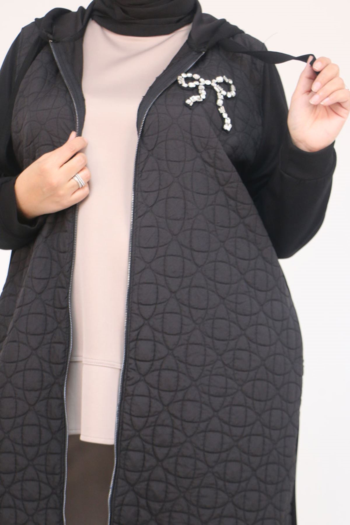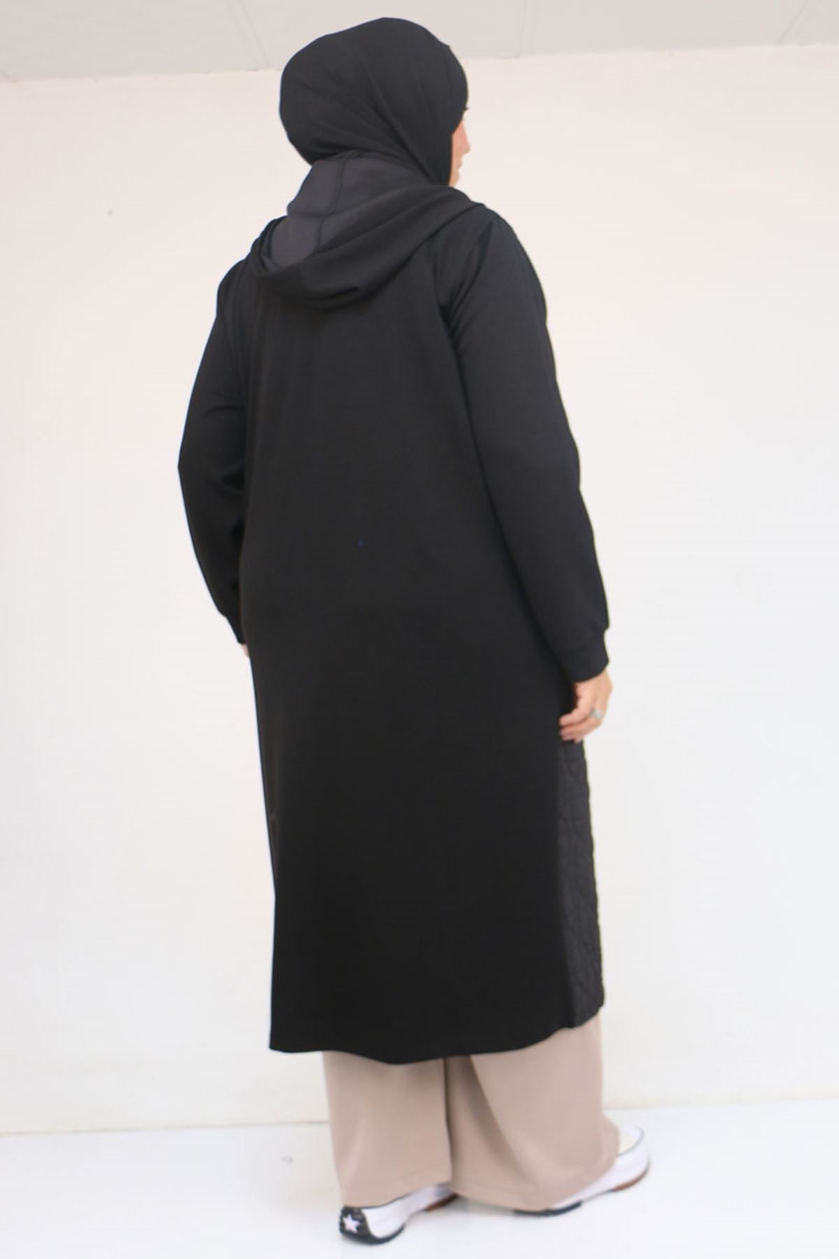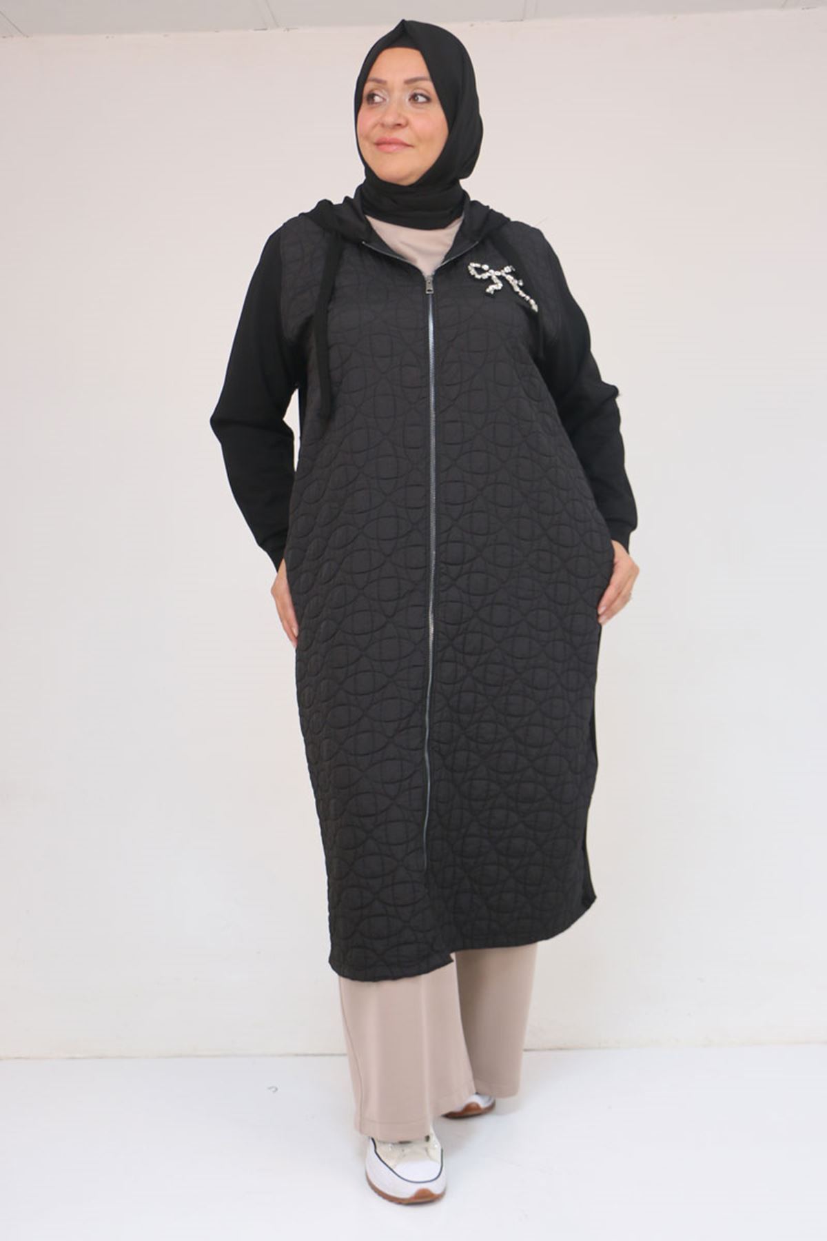 33068 Büyük Beden Kapüşonlu Bondit Kap-Siyah
