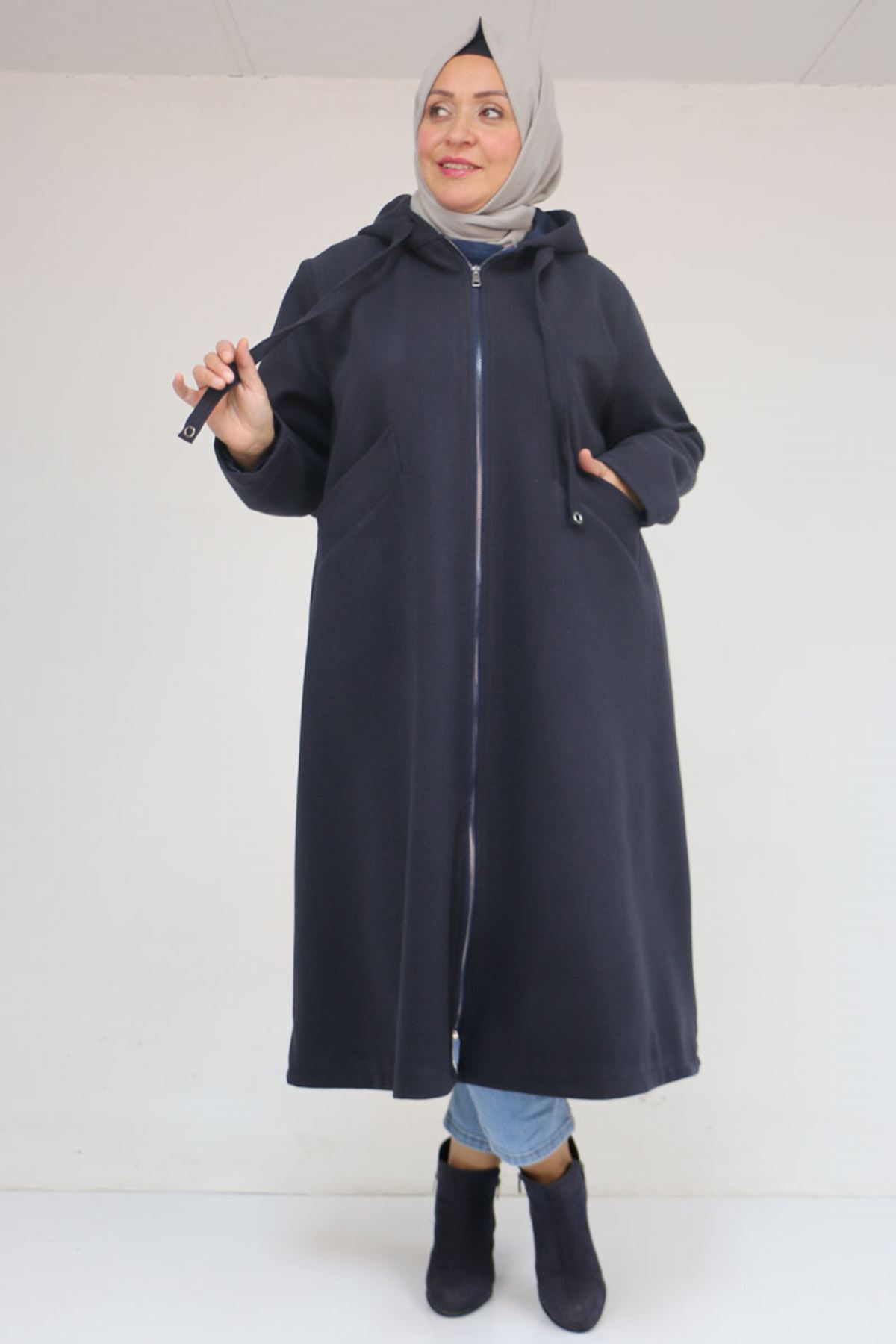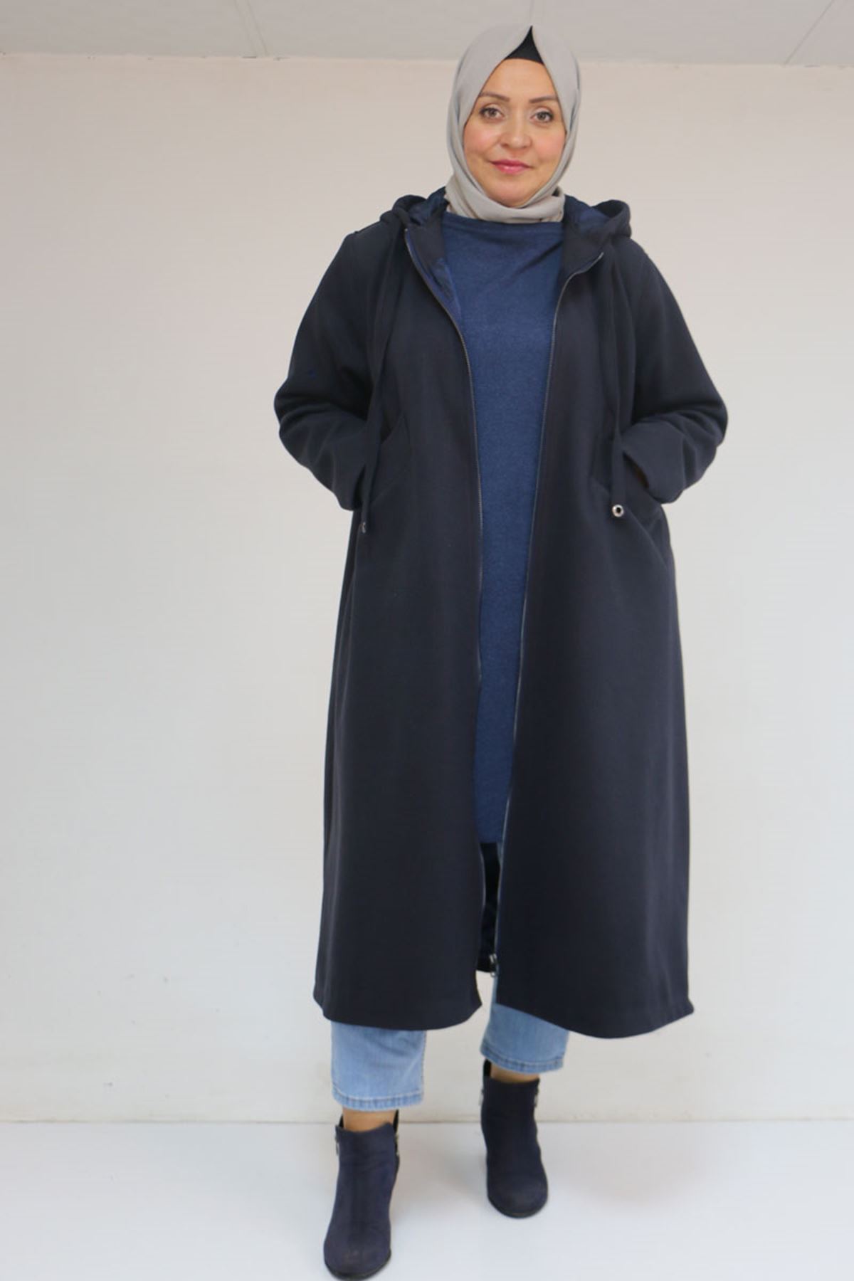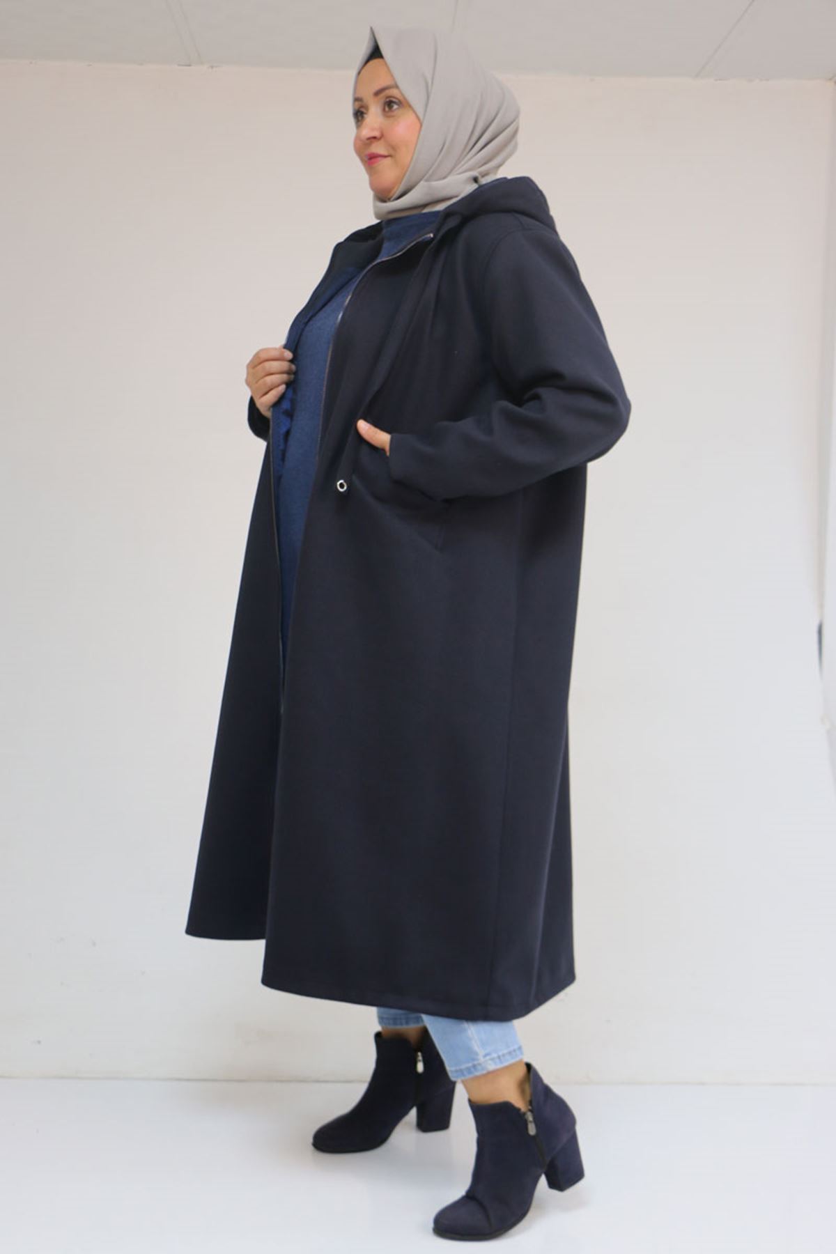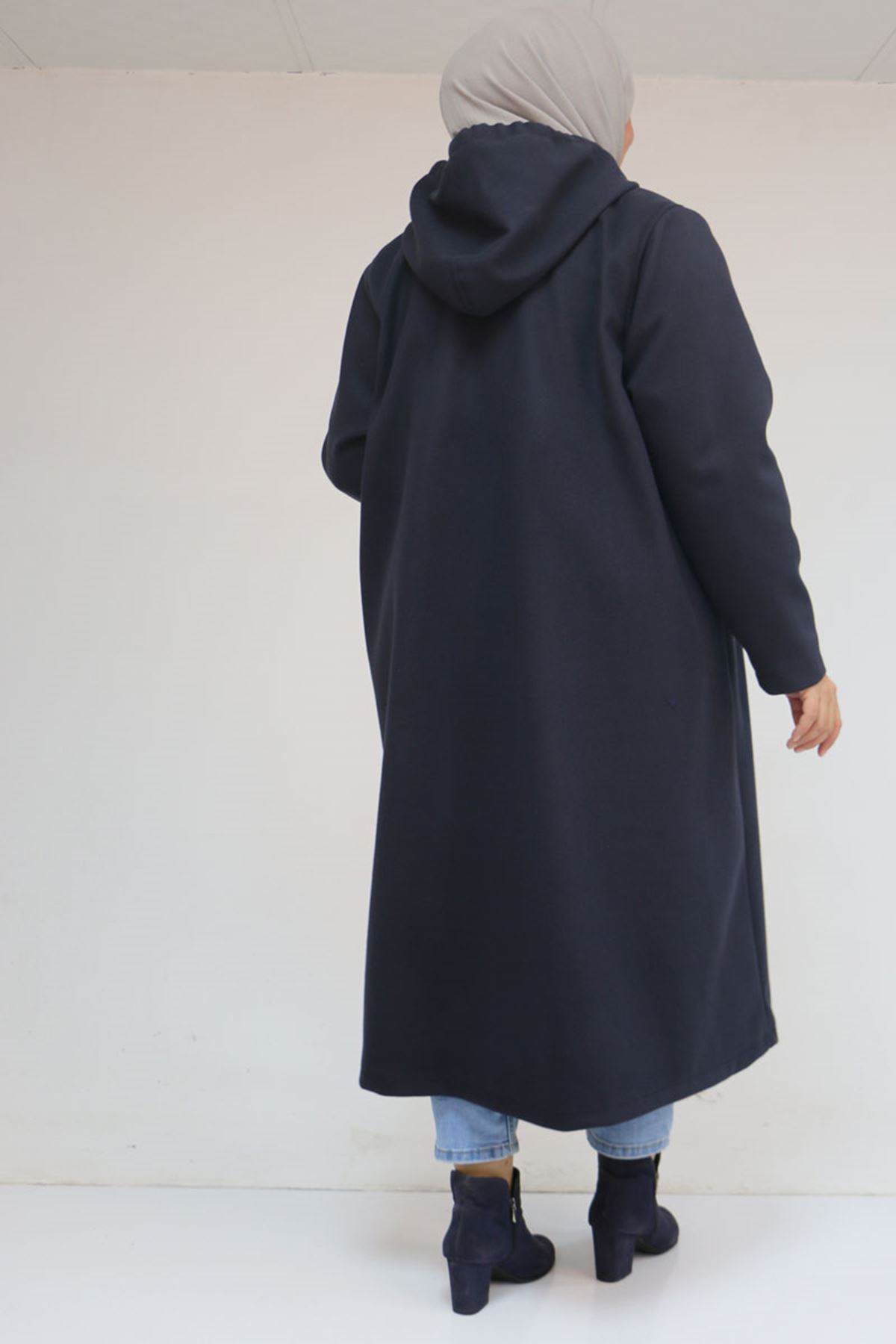 53046 Büyük Beden Kapşonlu İp Kordonlu Kaşe Kaban - Lacivert
