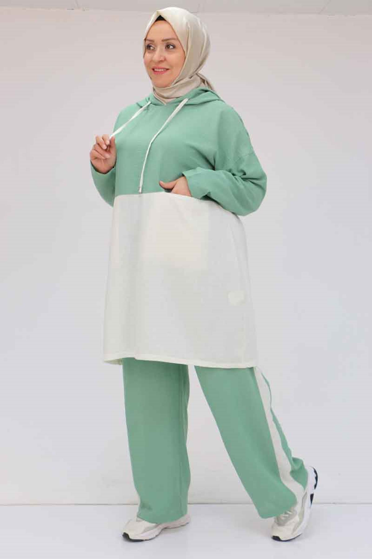 57008 Büyük Beden Kapşonlu Düşükkol Pantolonlu Takım - Nefti