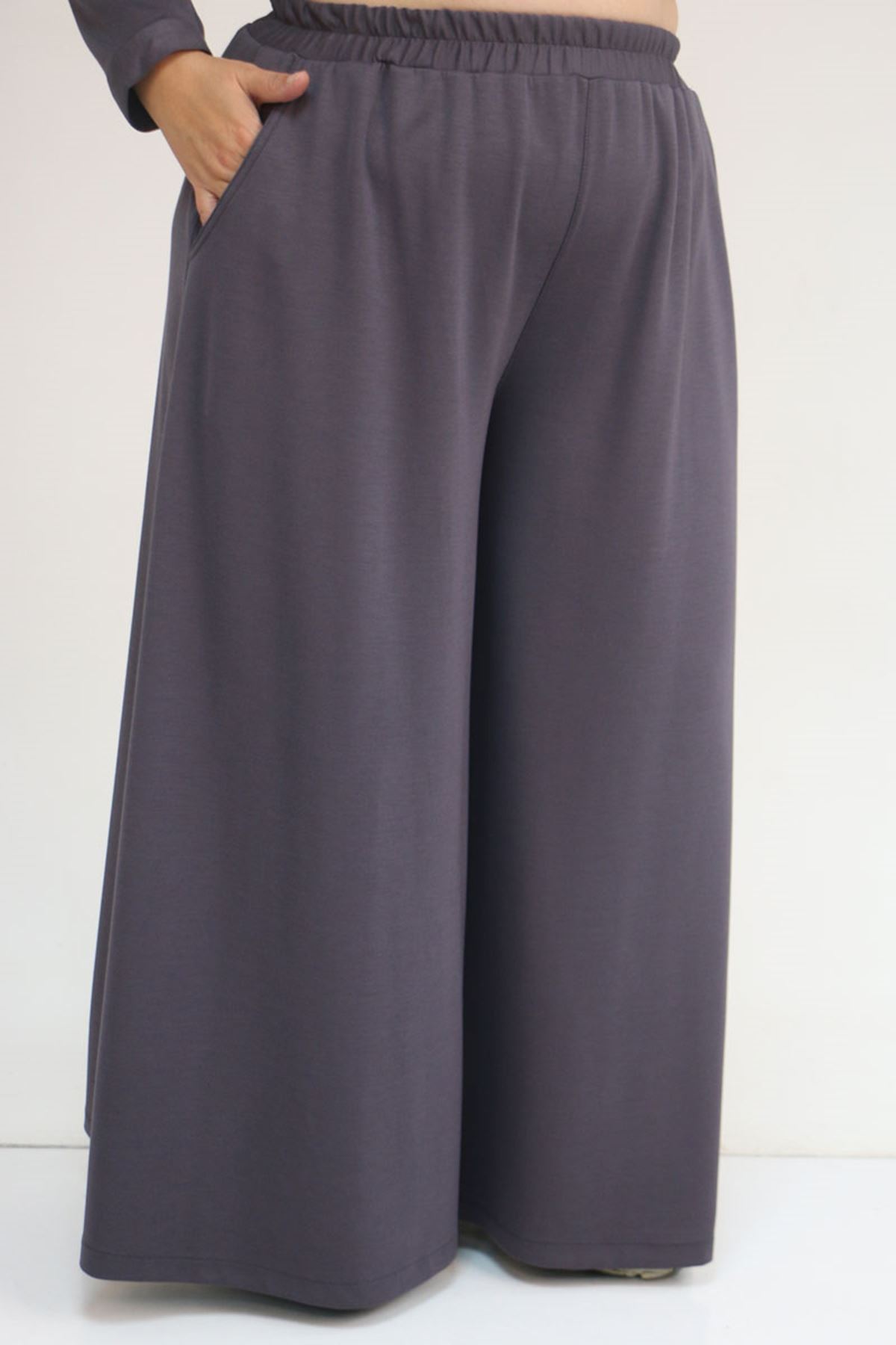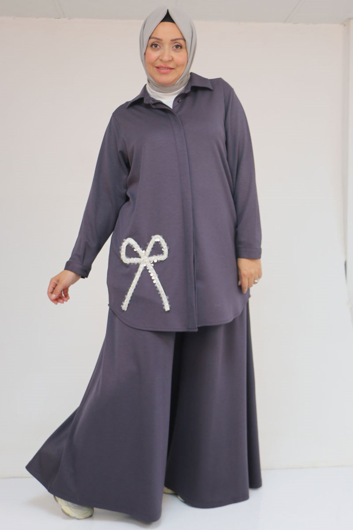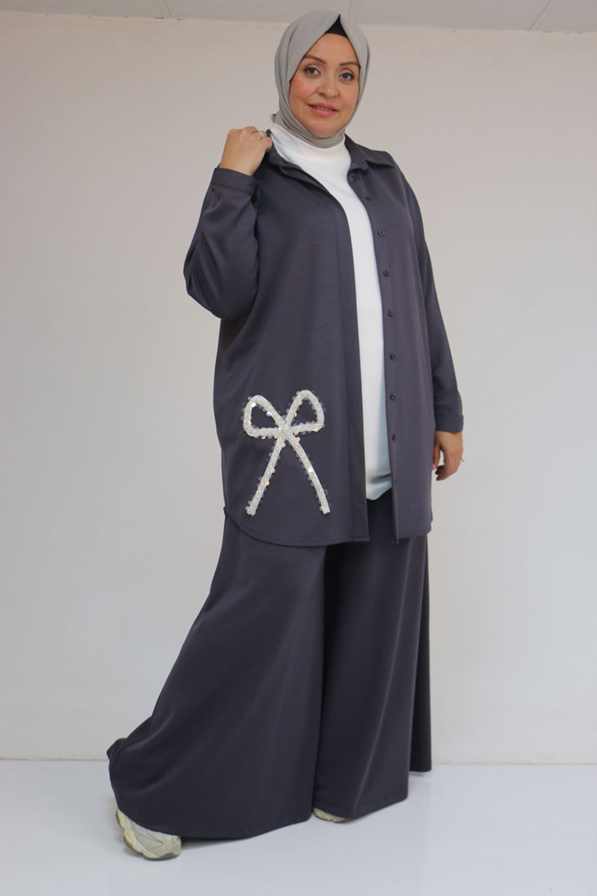 57055 Büyük Beden Gömleği Düğmeli Pantolonlu Modal Takım - Antrasit