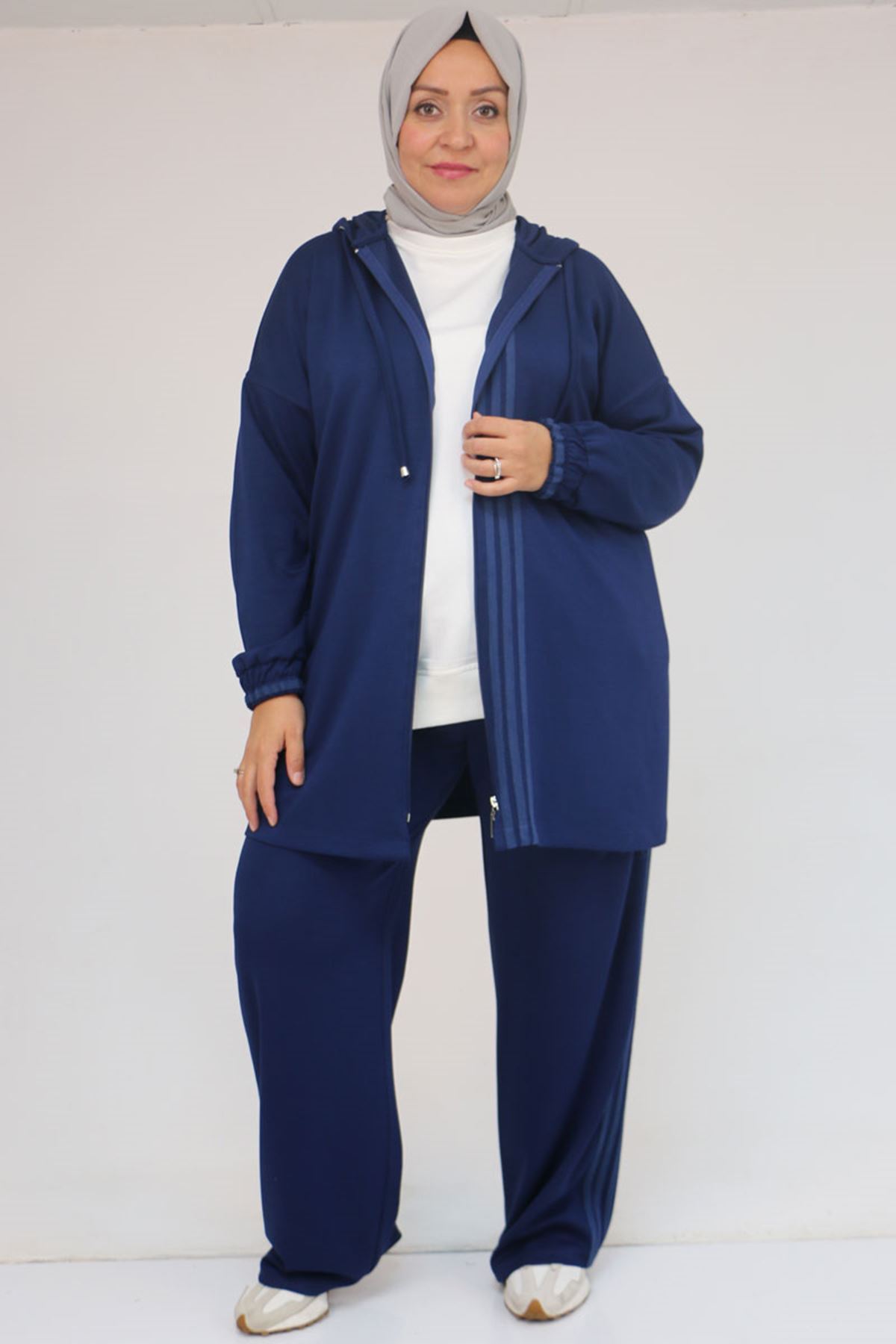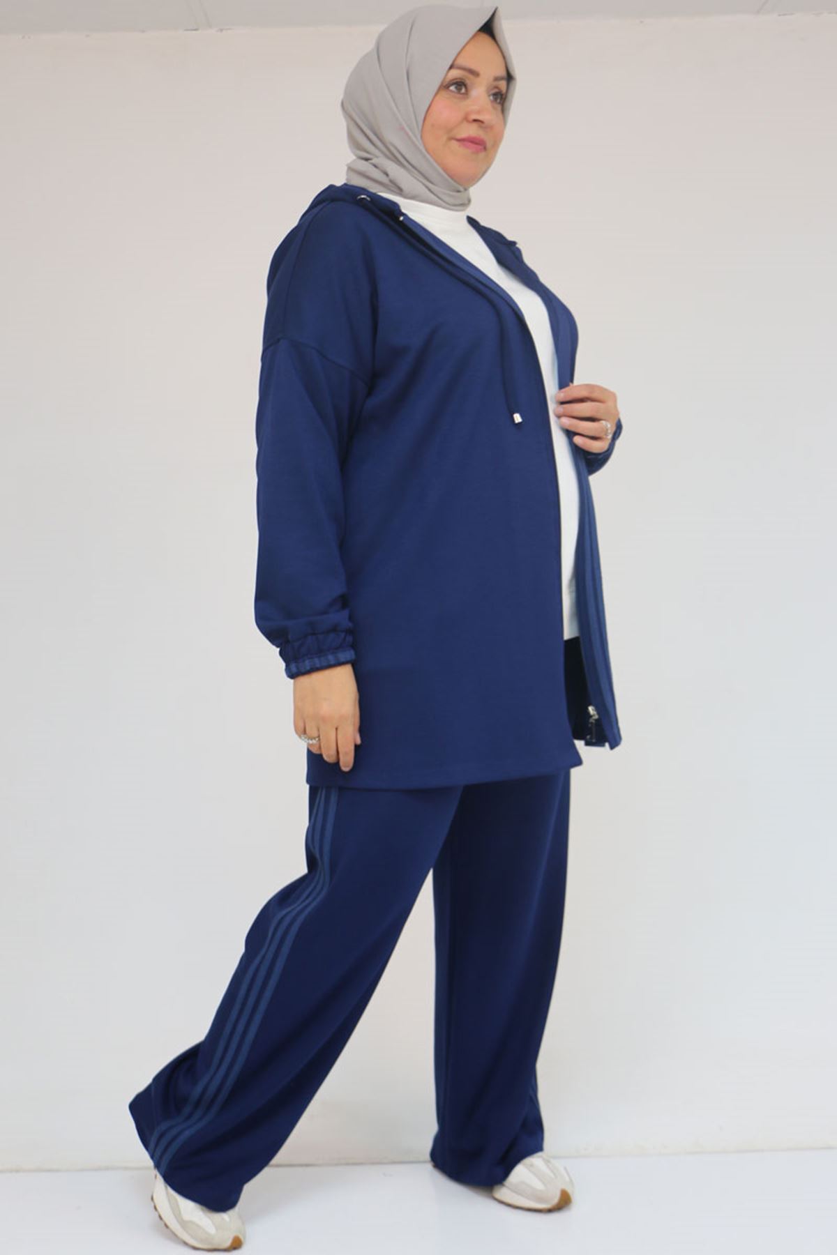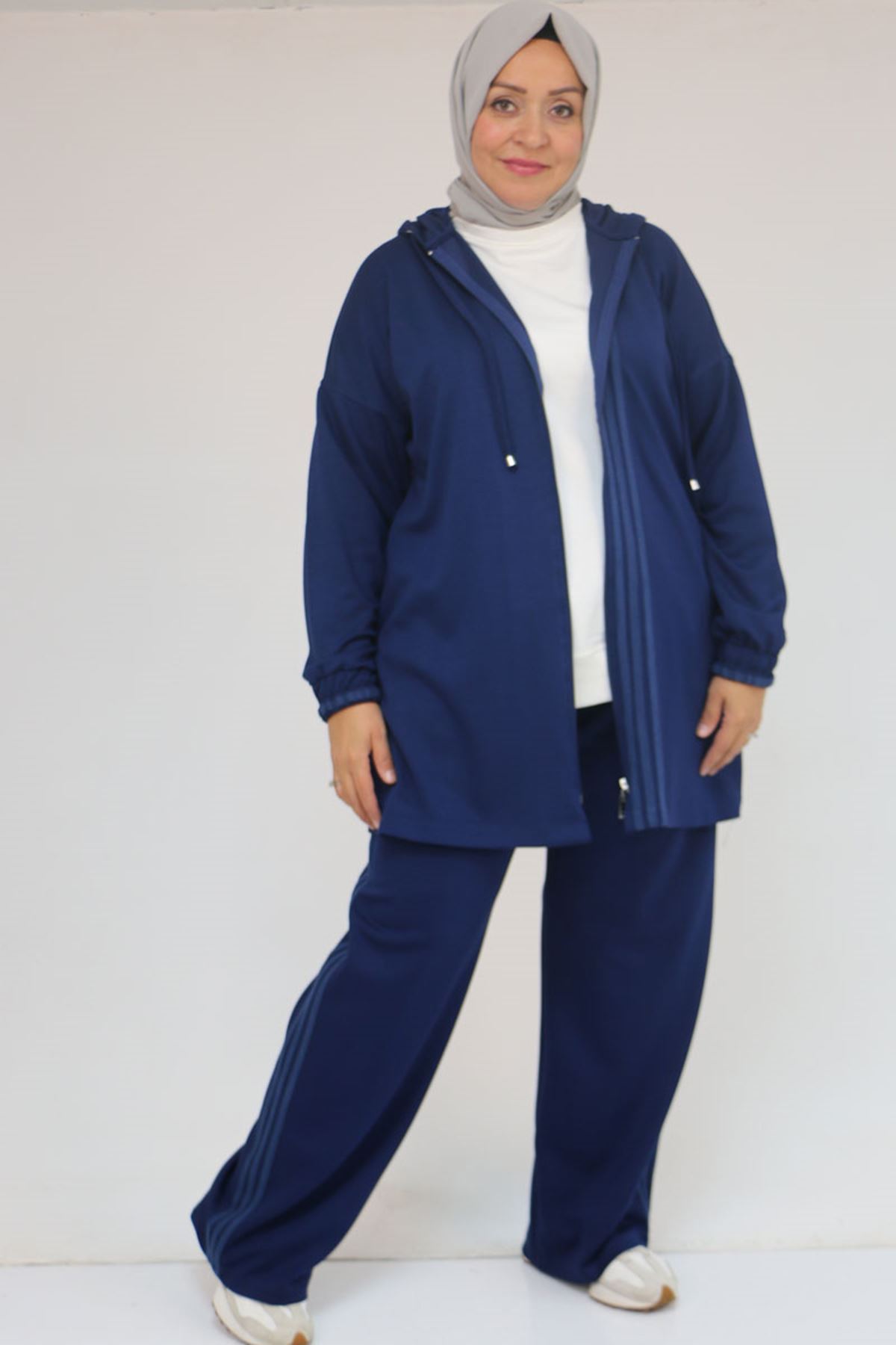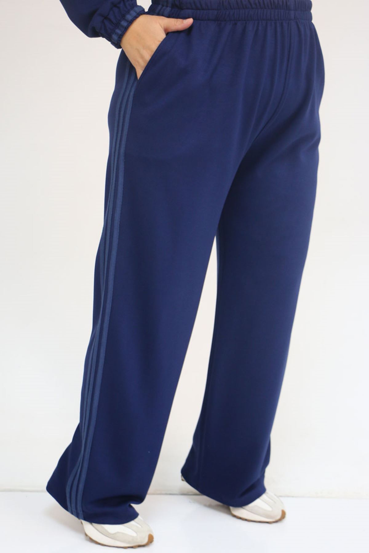 57056 Büyük Beden Renge Renk Garnili Modal Pantolonlu Takım - İndigo