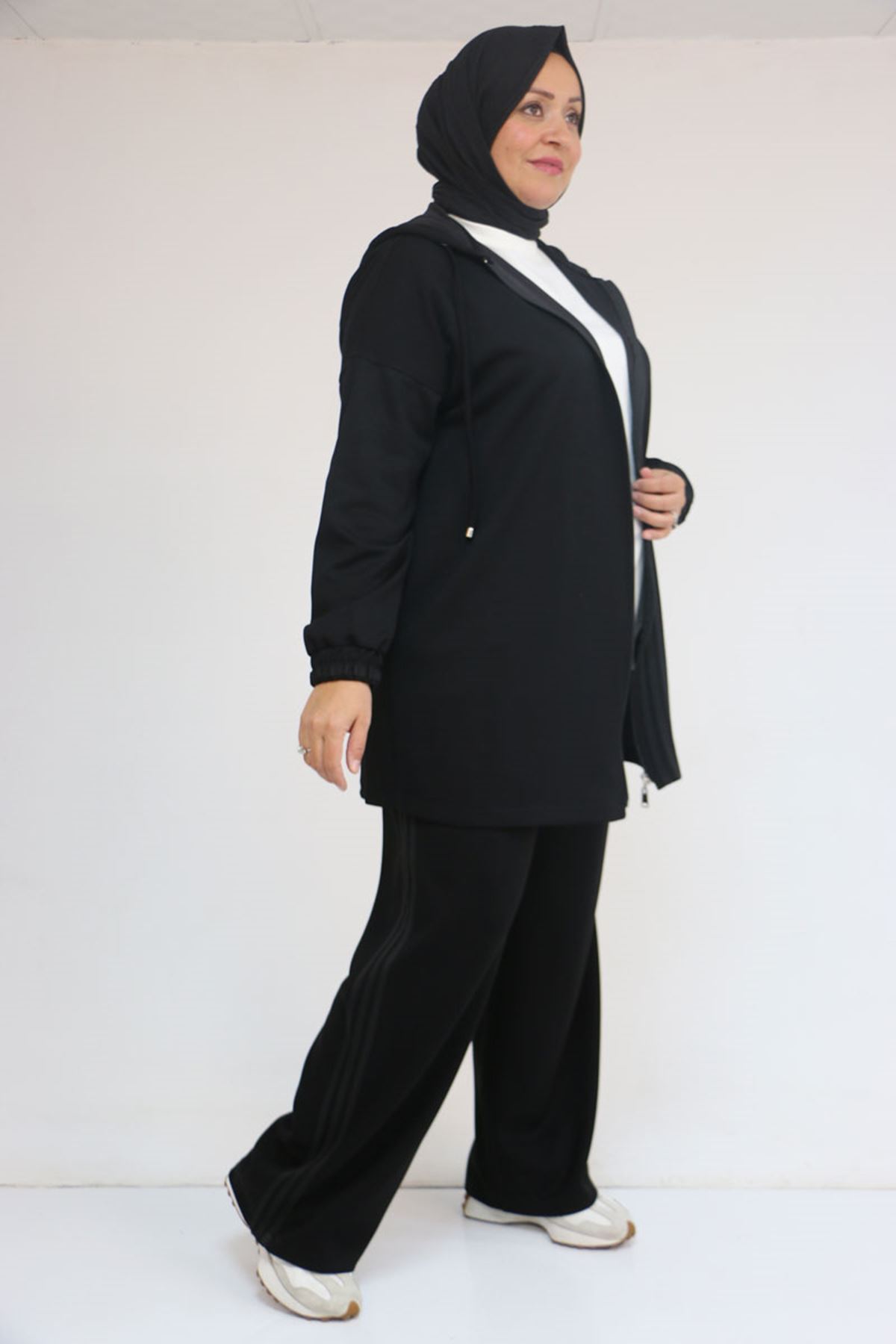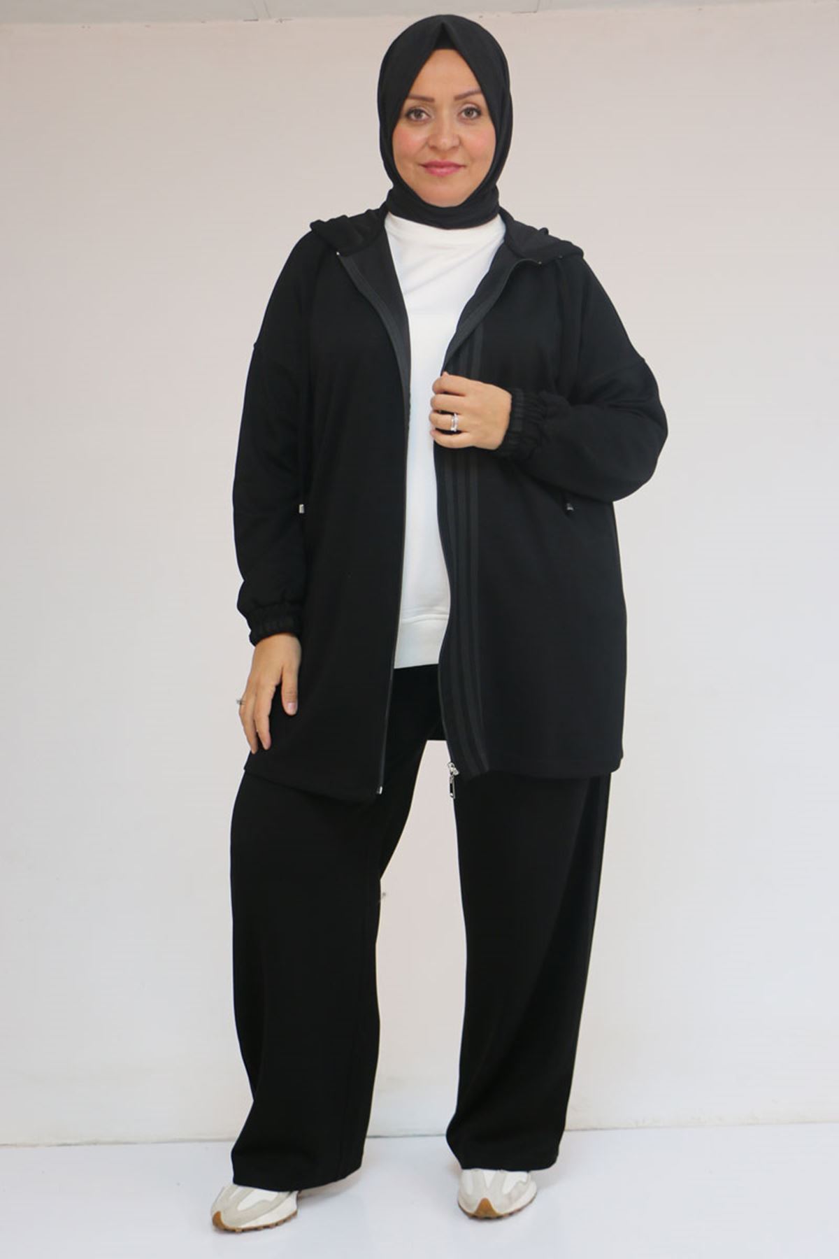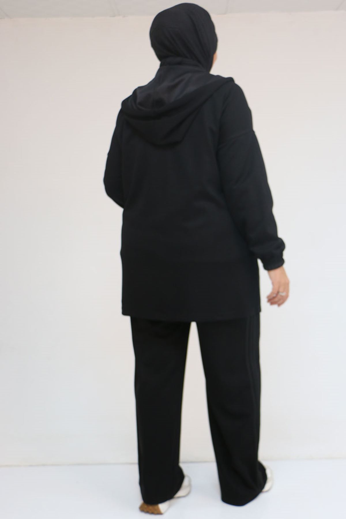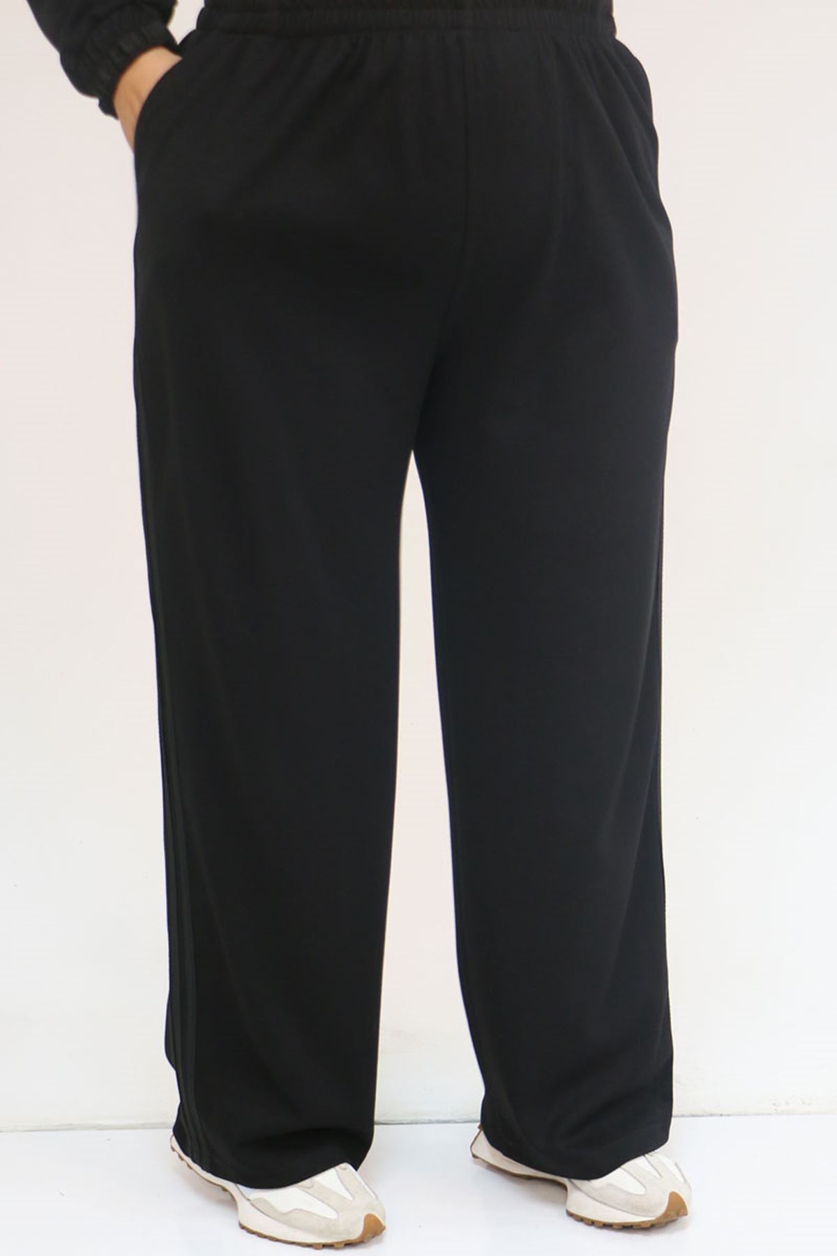 57056 Büyük Beden Renge Renk Garnili Modal Pantolonlu Takım - Siyah