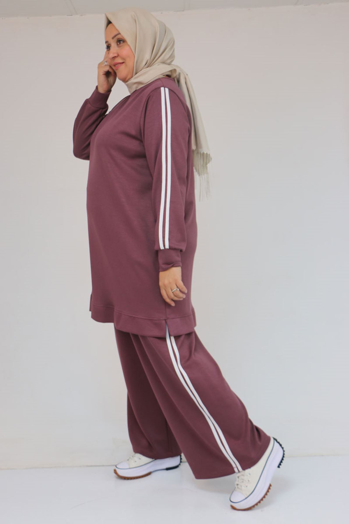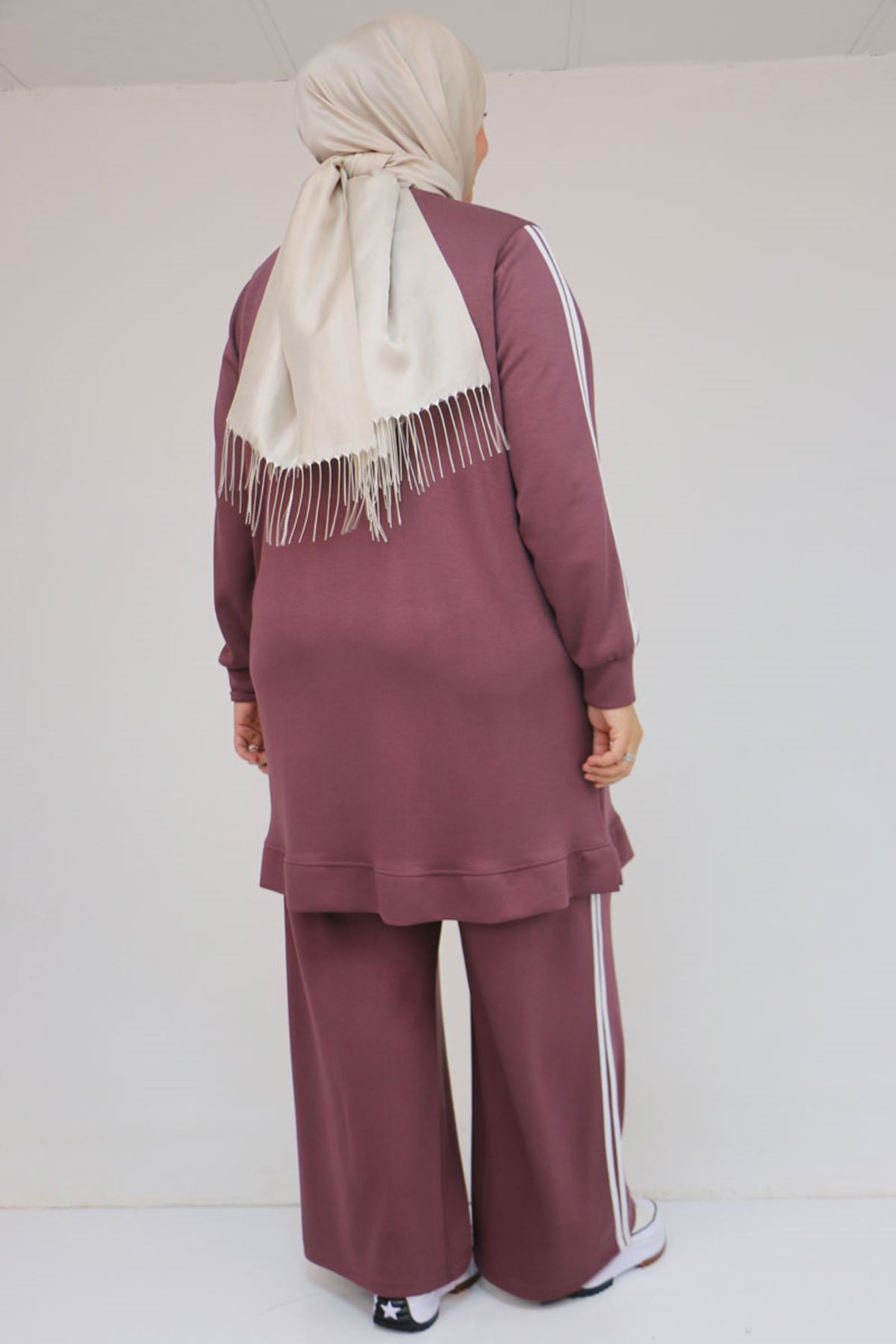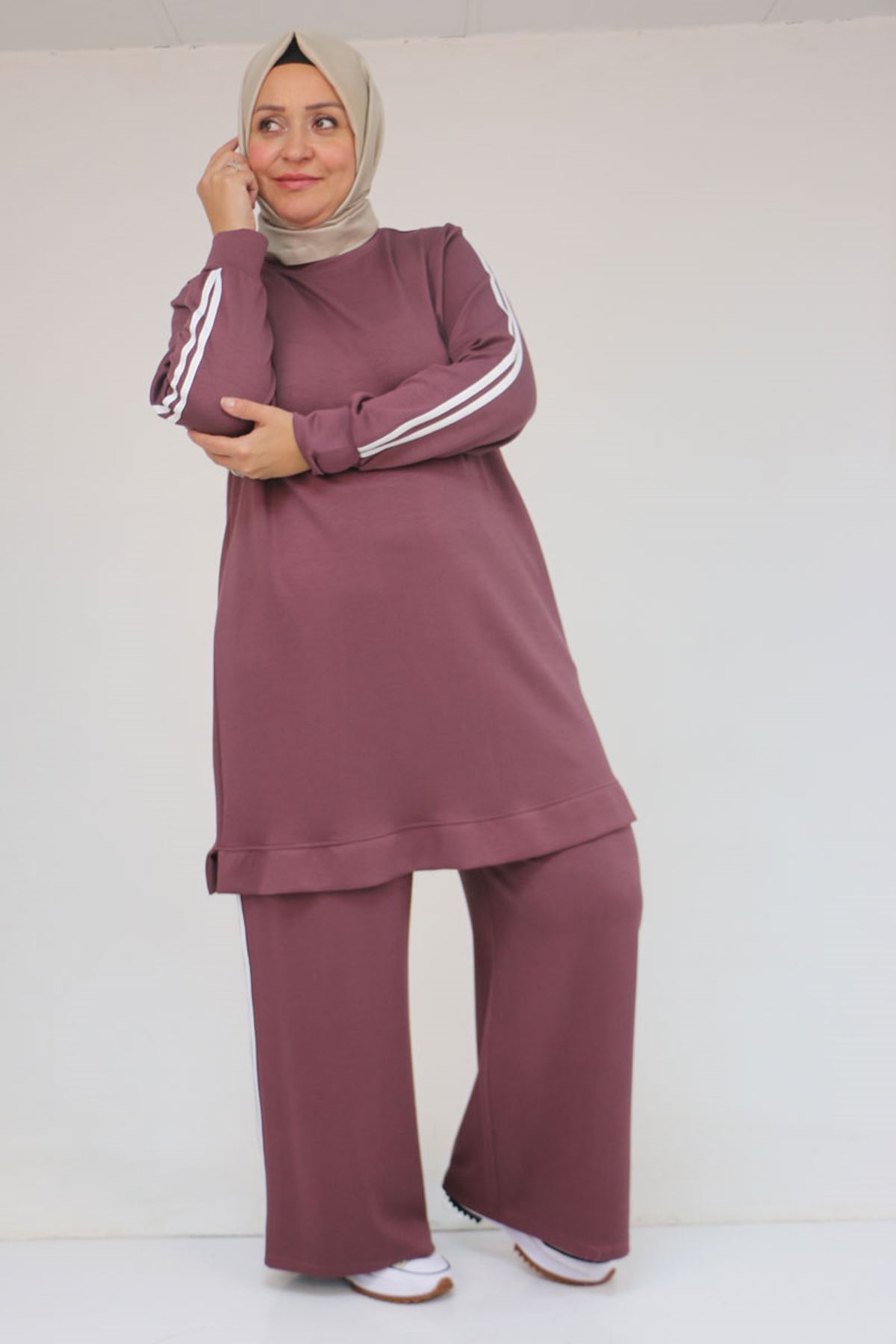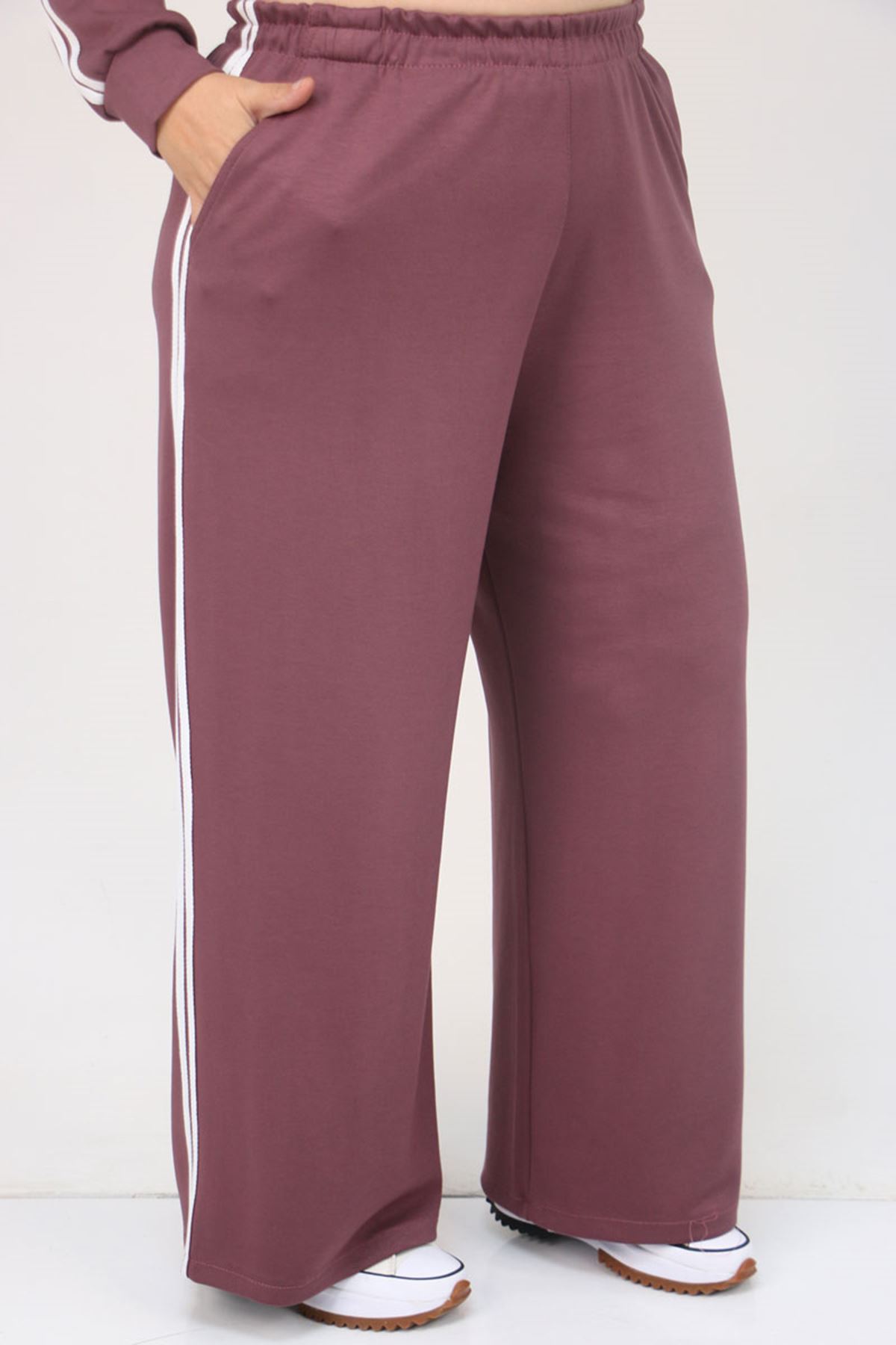 57060 Büyük Beden Omzu Şeritli Modal Pantolonlu Takım - Gül Kurusu
