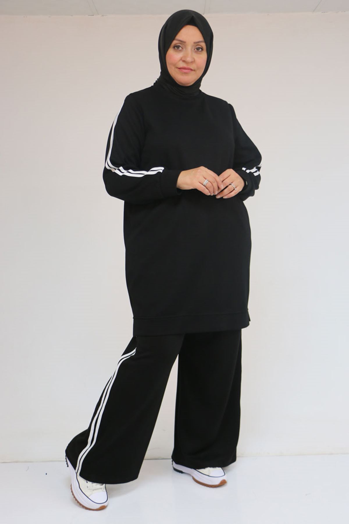 57060 Büyük Beden Omzu Şeritli Modal Pantolonlu Takım - Siyah