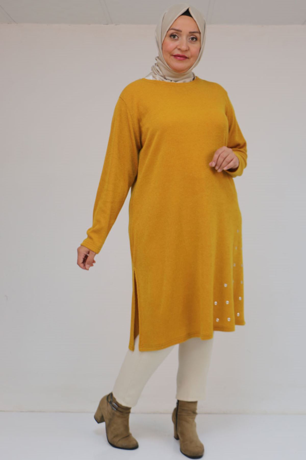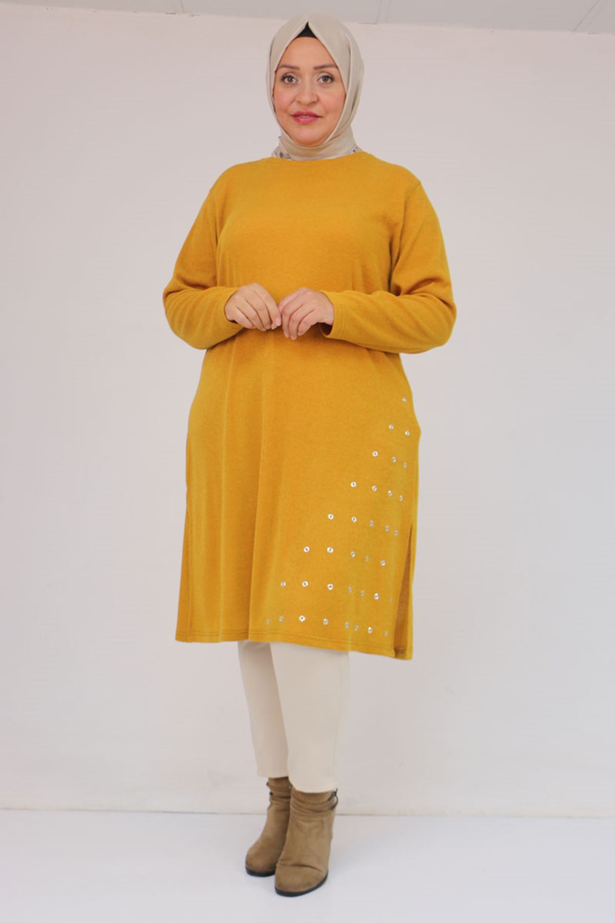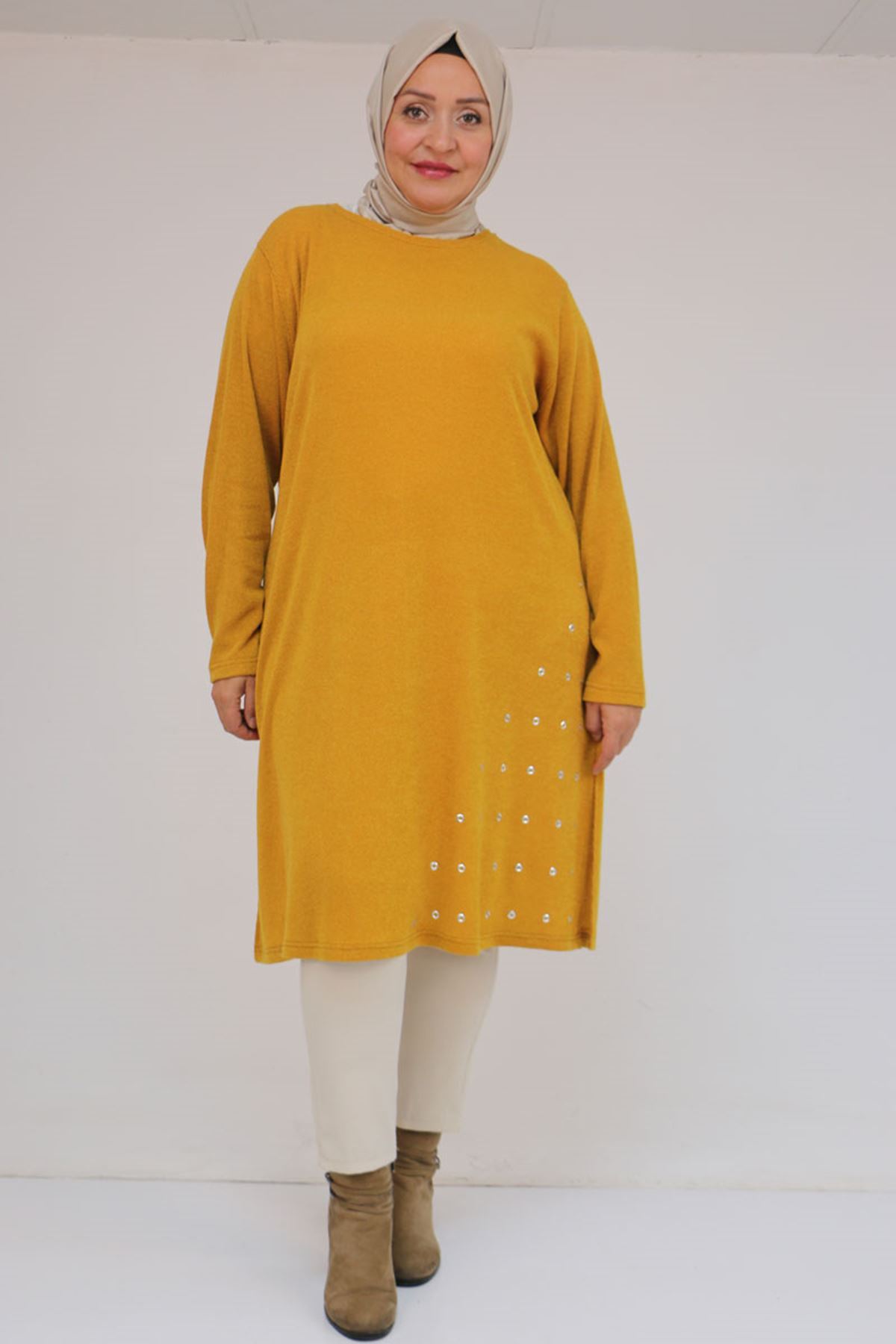 58110 Büyük Beden Yan Dikişinde Kuş Gözü Detaylı Mir Tunik - Hardal