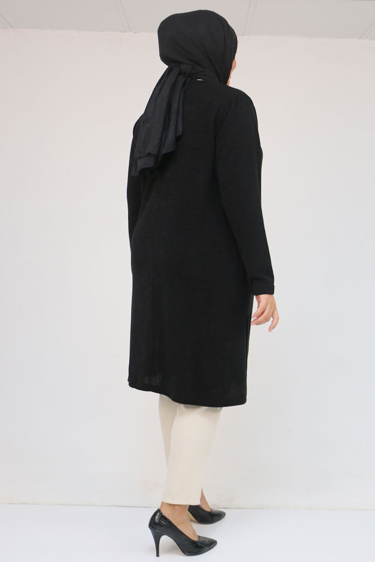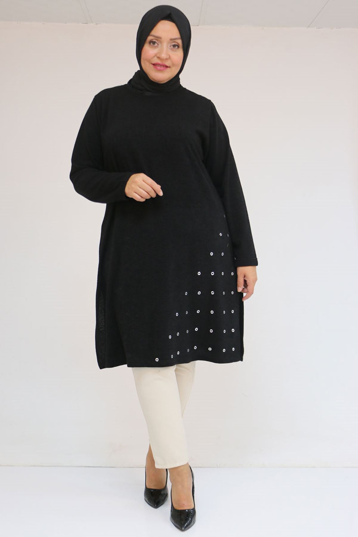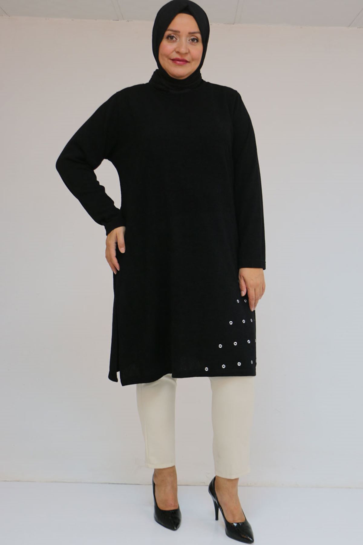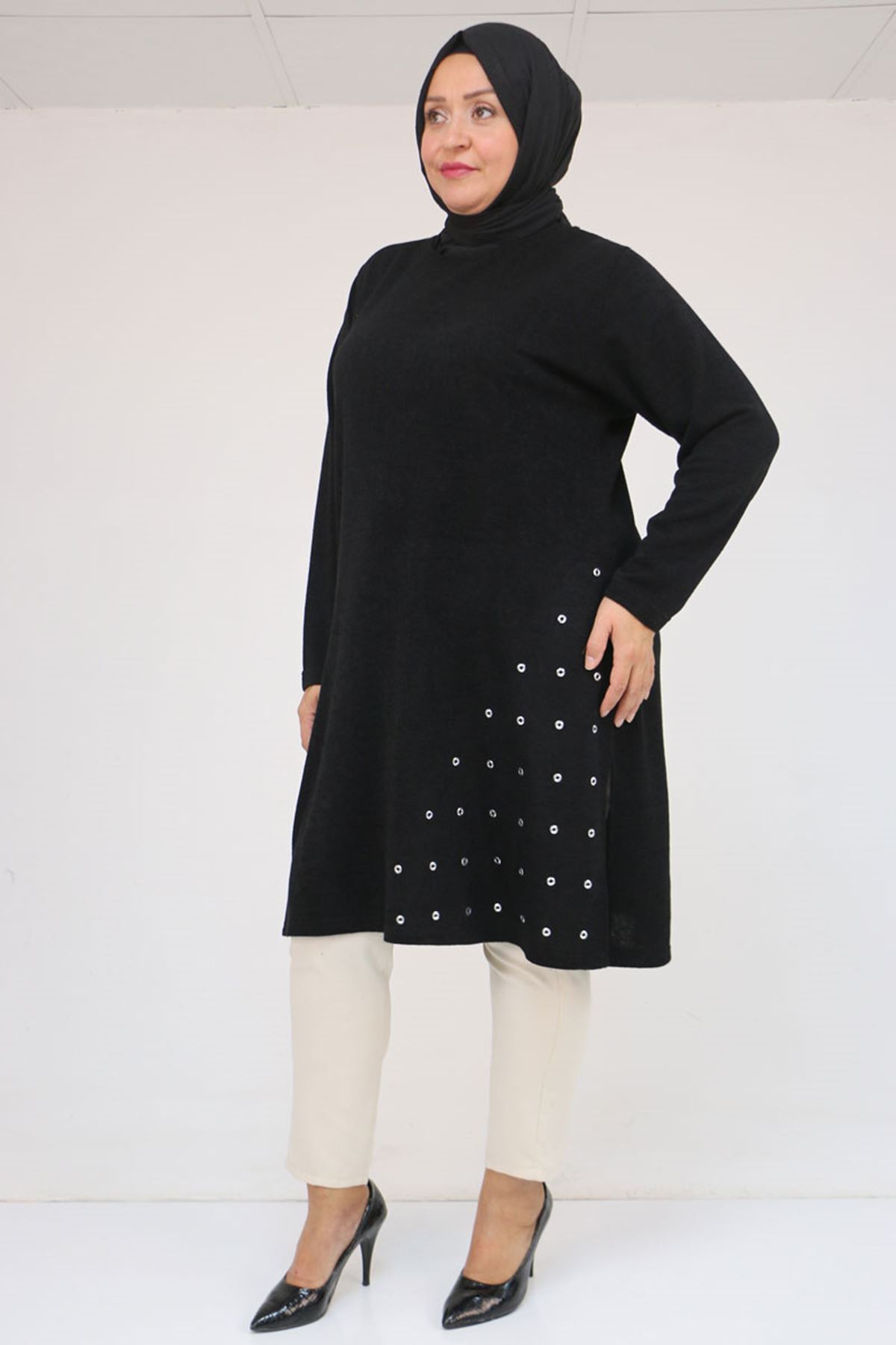 58110 Büyük Beden Yan Dikişinde Kuş Gözü Detaylı Mir Tunik - Siyah
