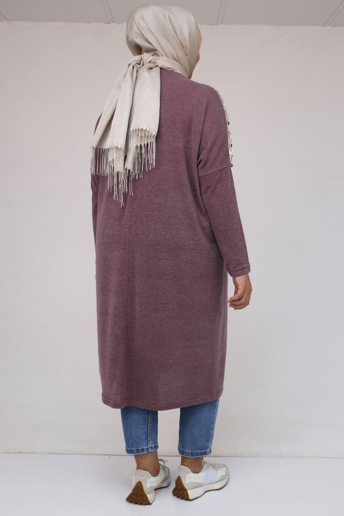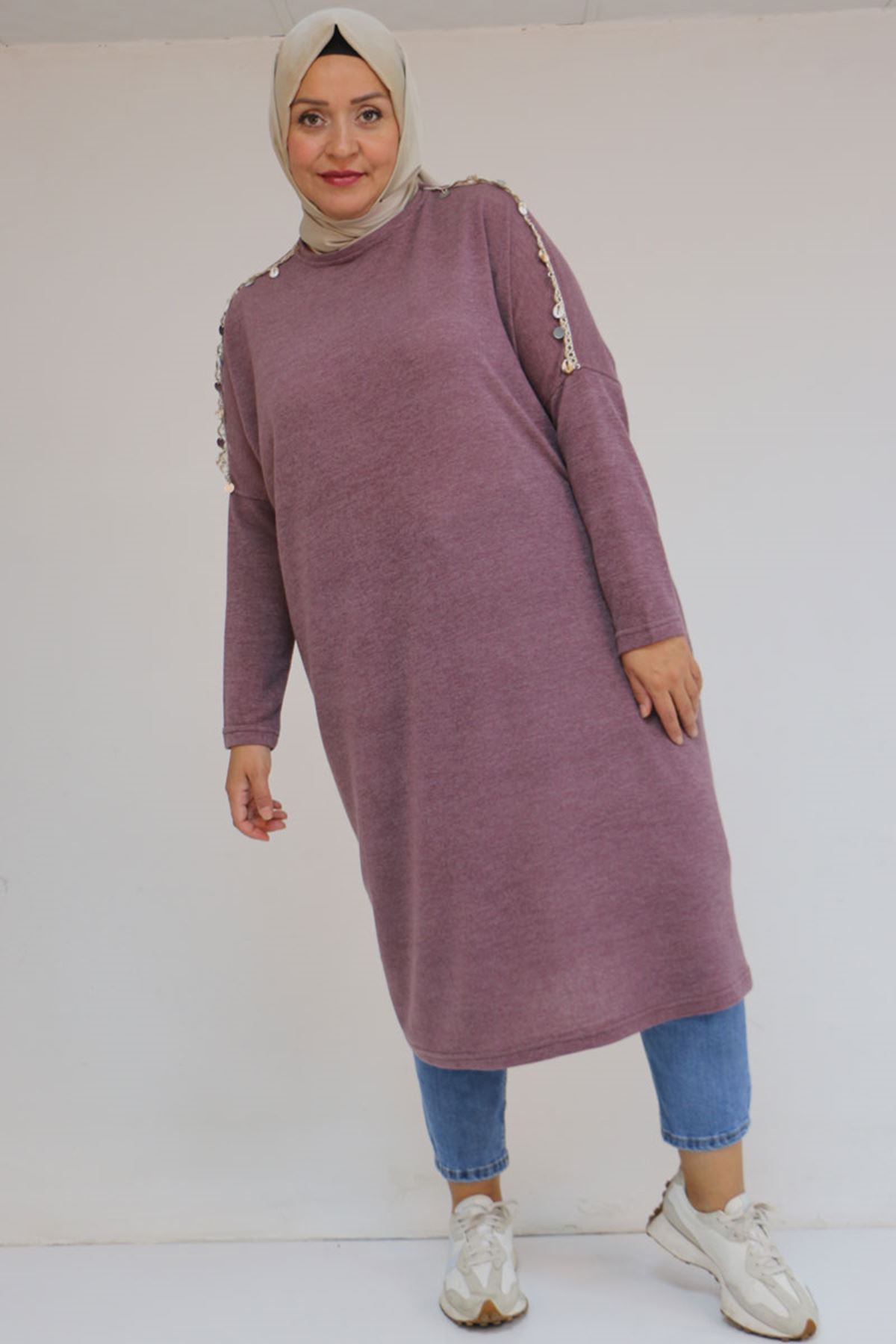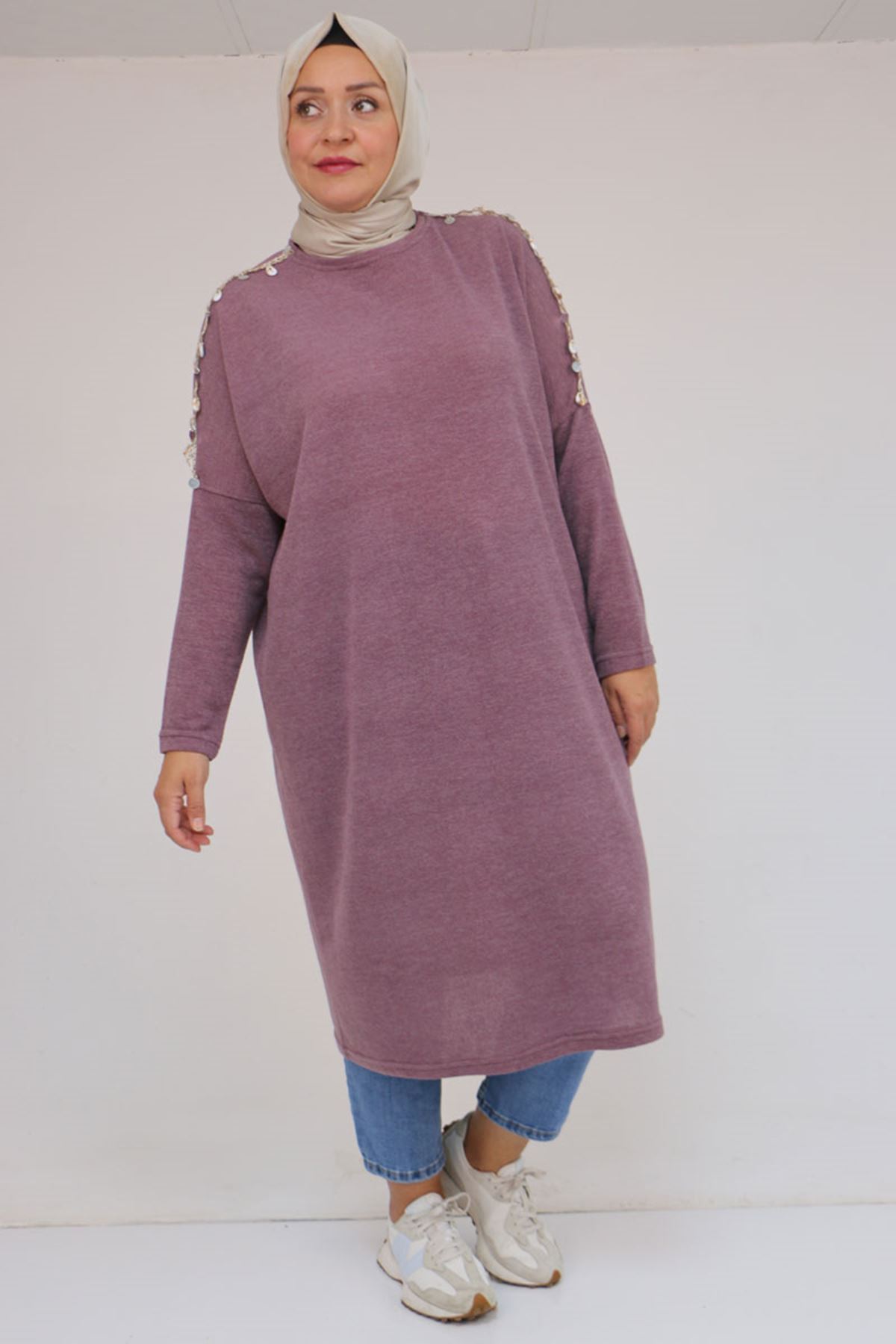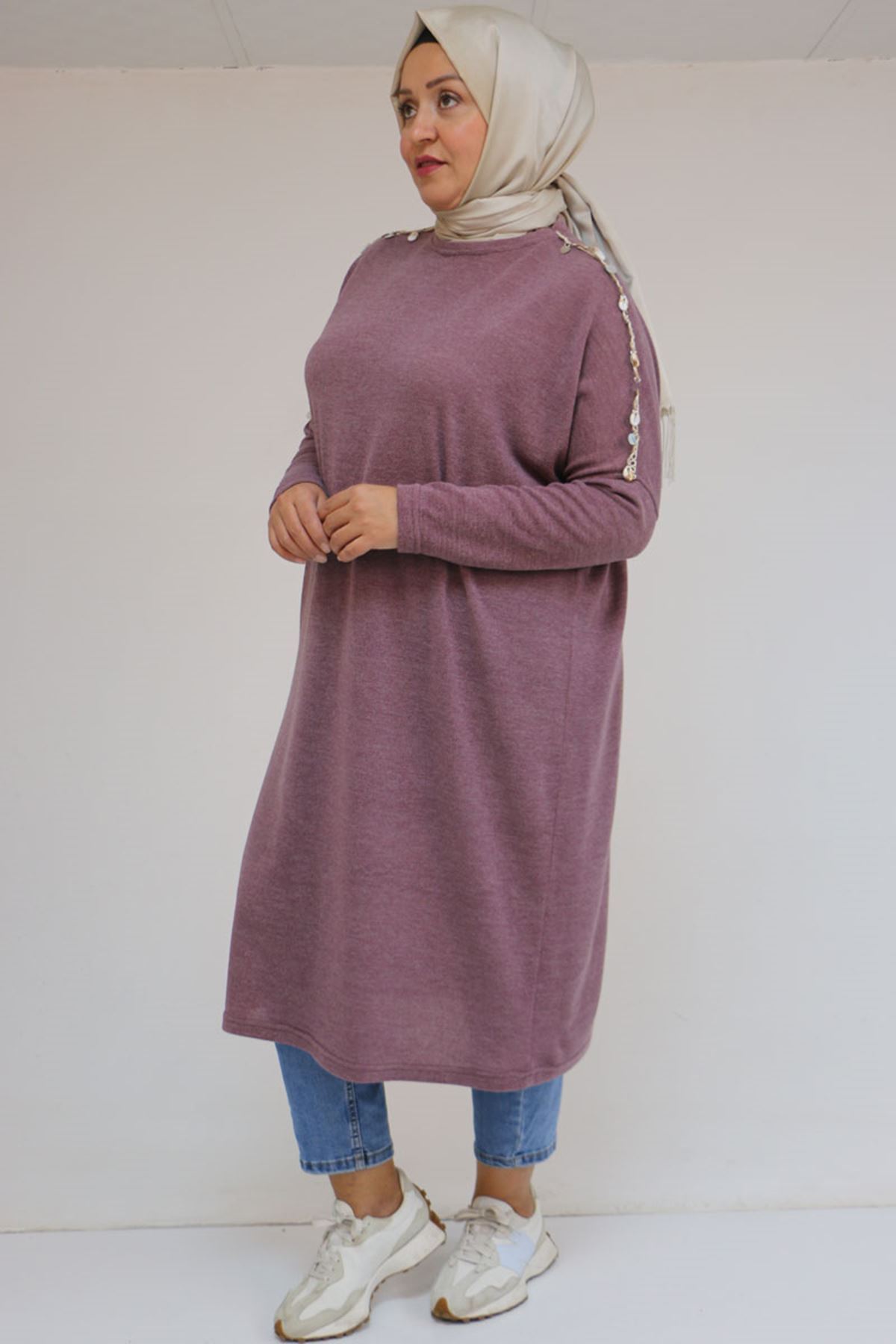 58112 Büyük Beden Omzu Aksesuar Detaylı Düşük Kol Tunik - Gül Kurusu