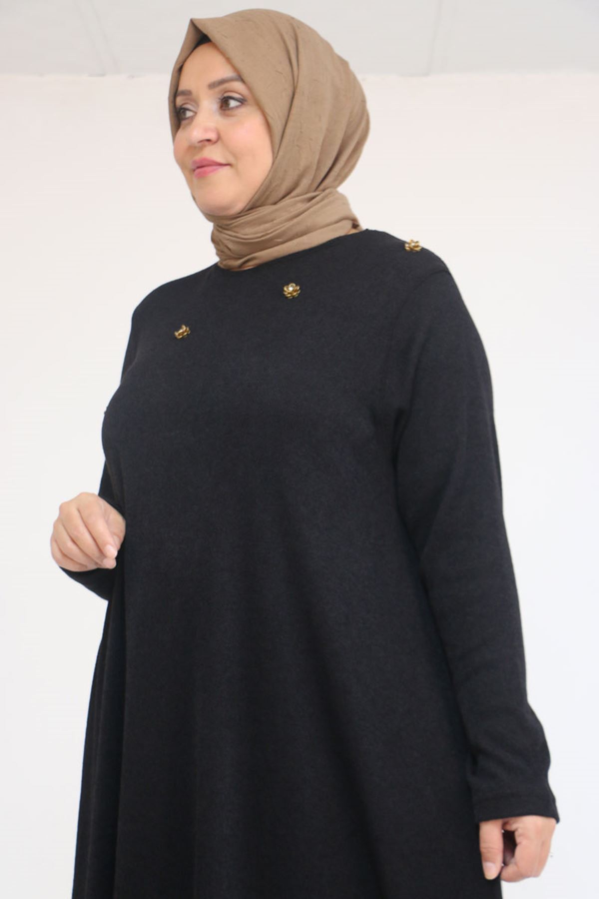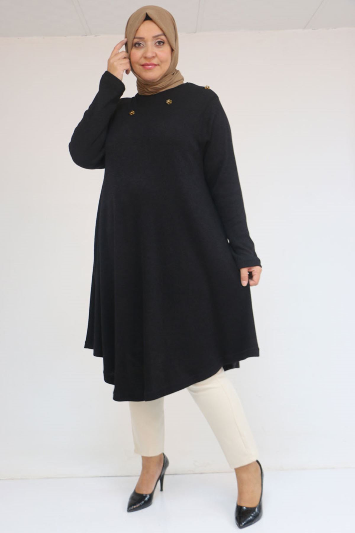 58118 Büyük Beden Çiçek Detaylı Mir Mevlana Tunik - Siyah