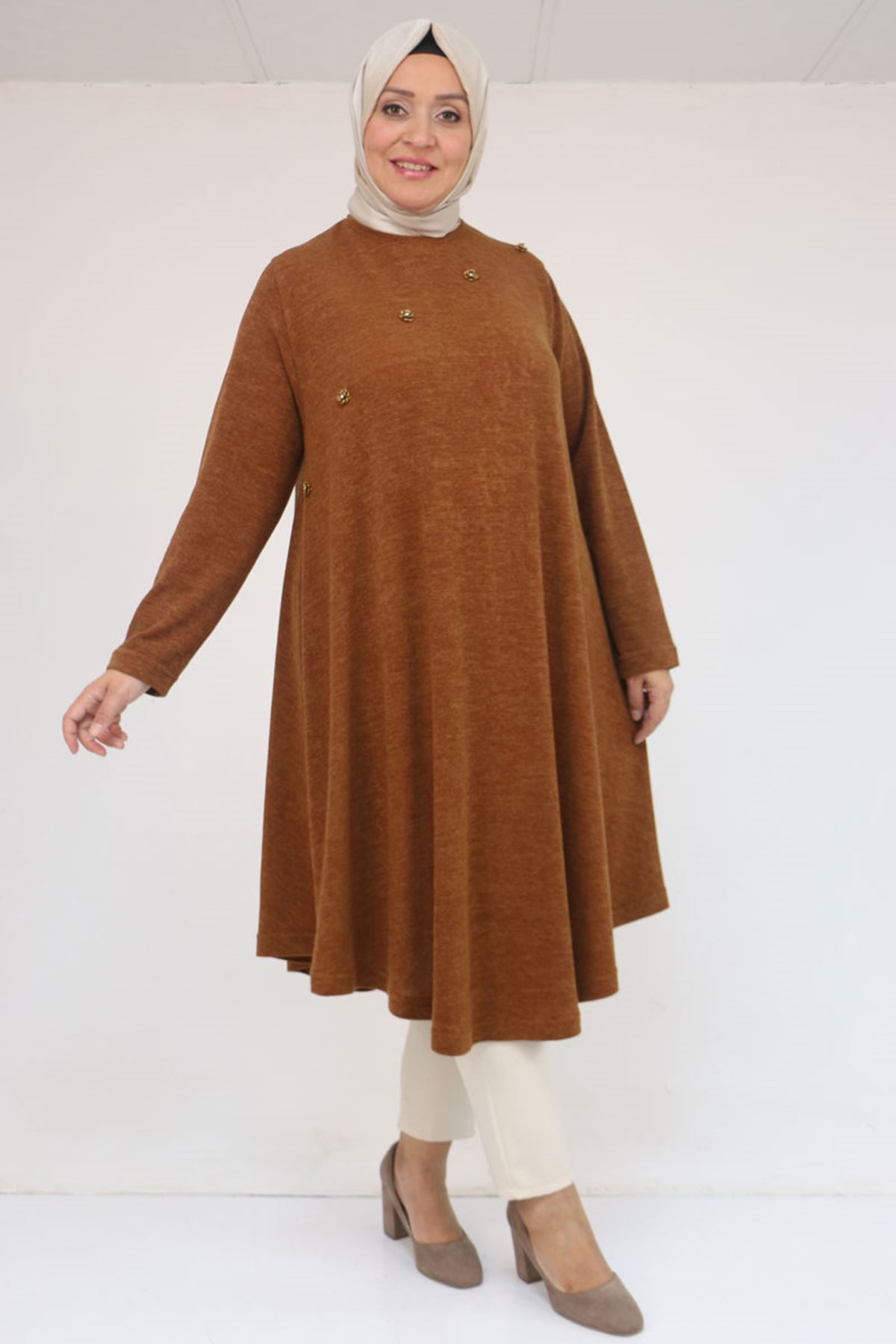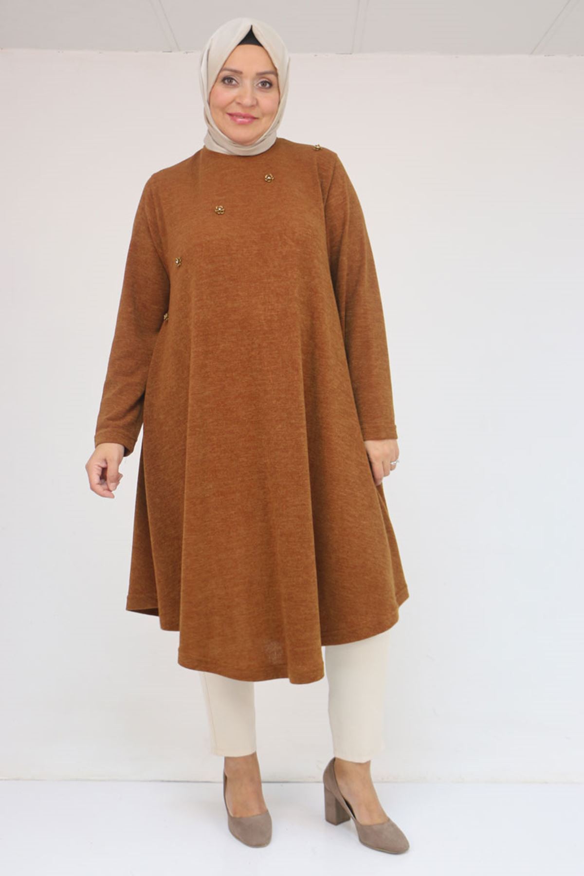 58118 Büyük Beden Çiçek Detaylı Mir Mevlana Tunik - Taba