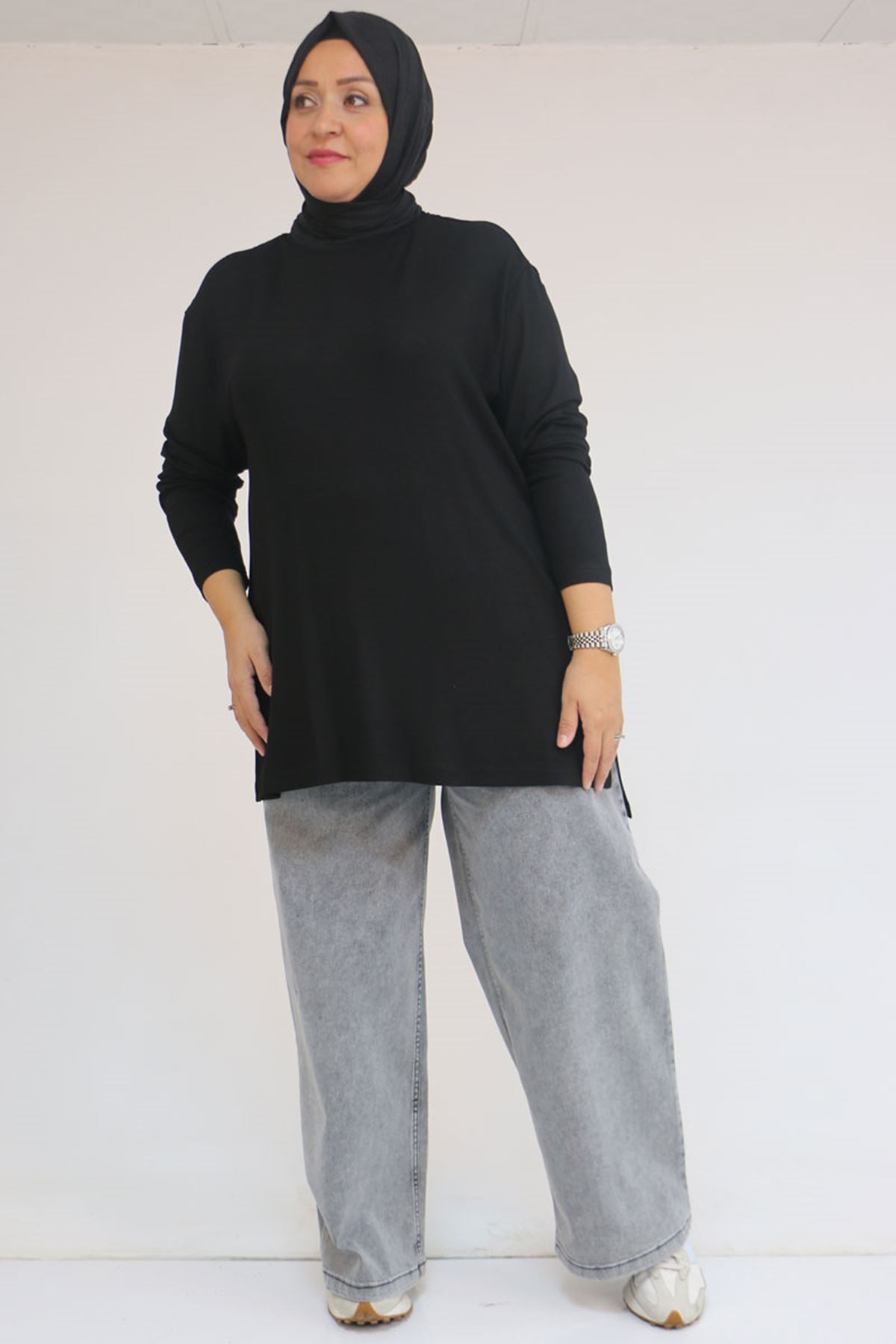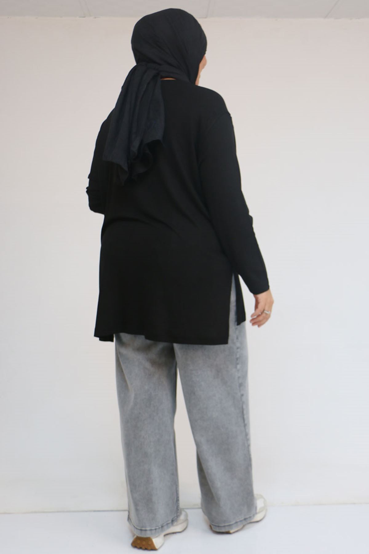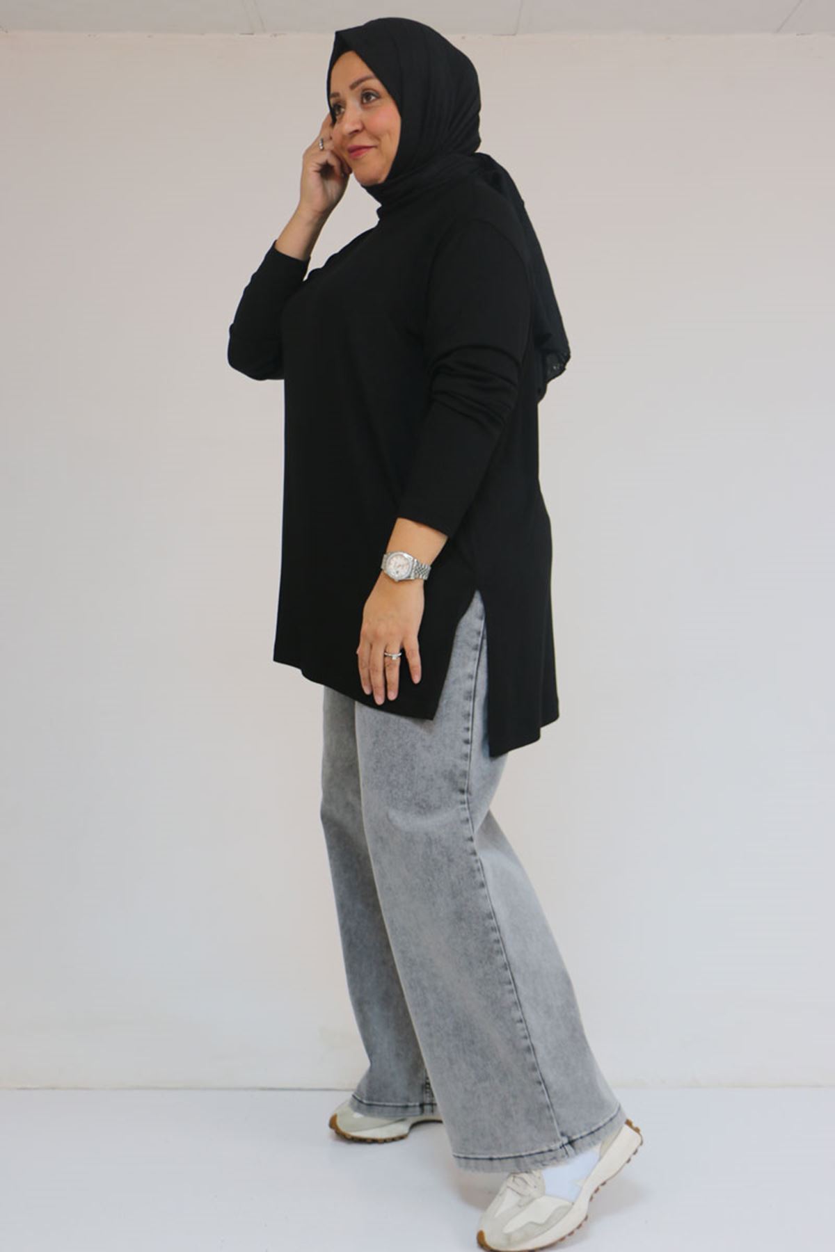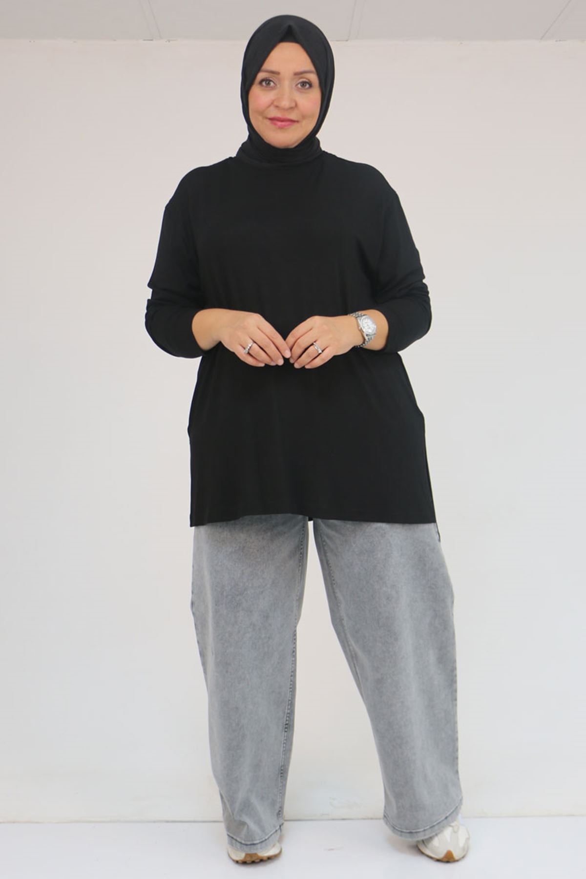 58119 Büyük Beden Yanı Yırtmaçlı Çilek Tunik - Siyah