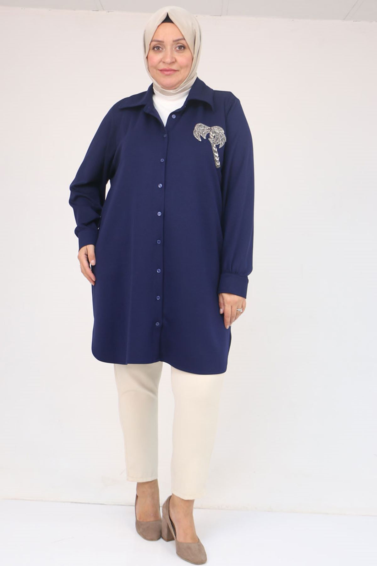 58126 Büyük Beden Düğmeli Aksesuar Detaylı Modal Tunik - İndigo