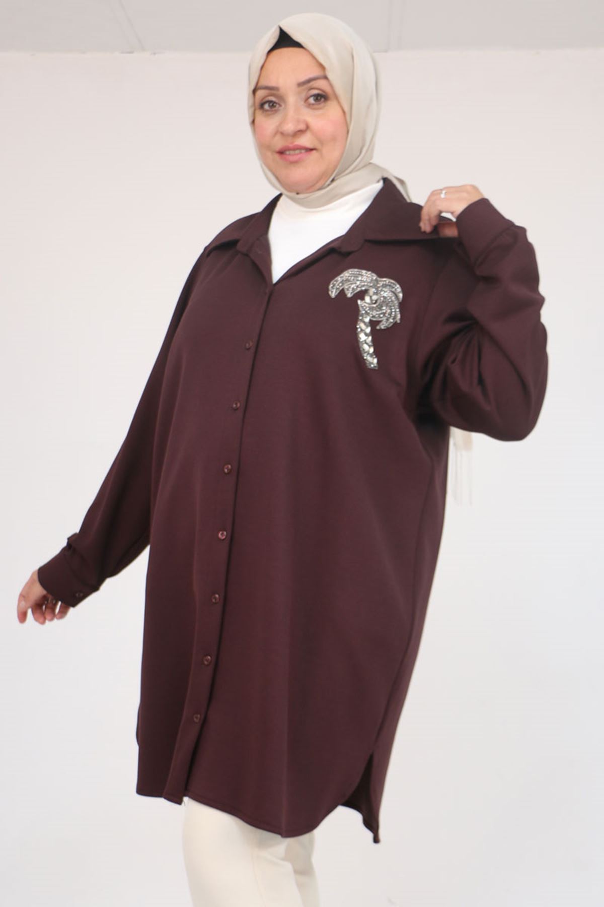 58126 Büyük Beden Düğmeli Aksesuar Detaylı Modal Tunik - Kahve
