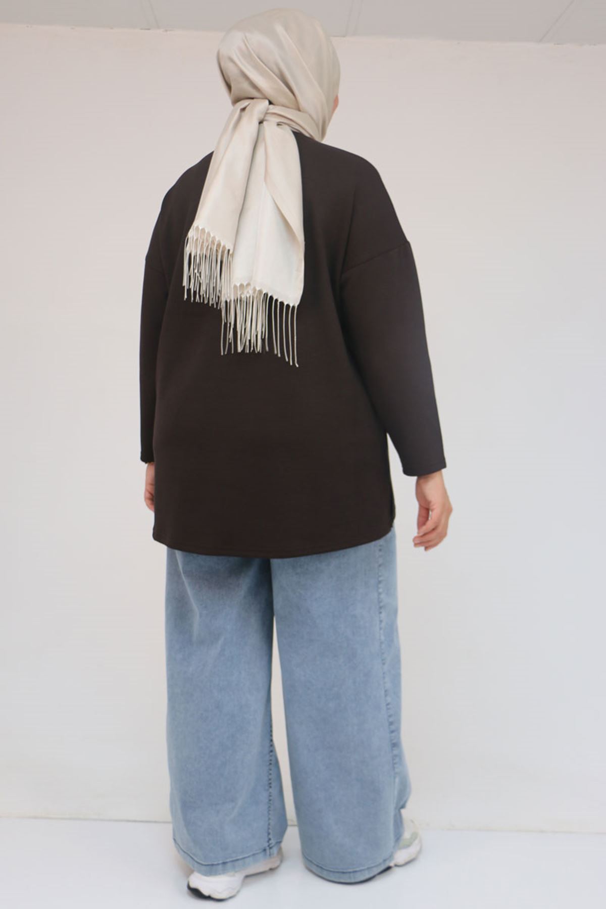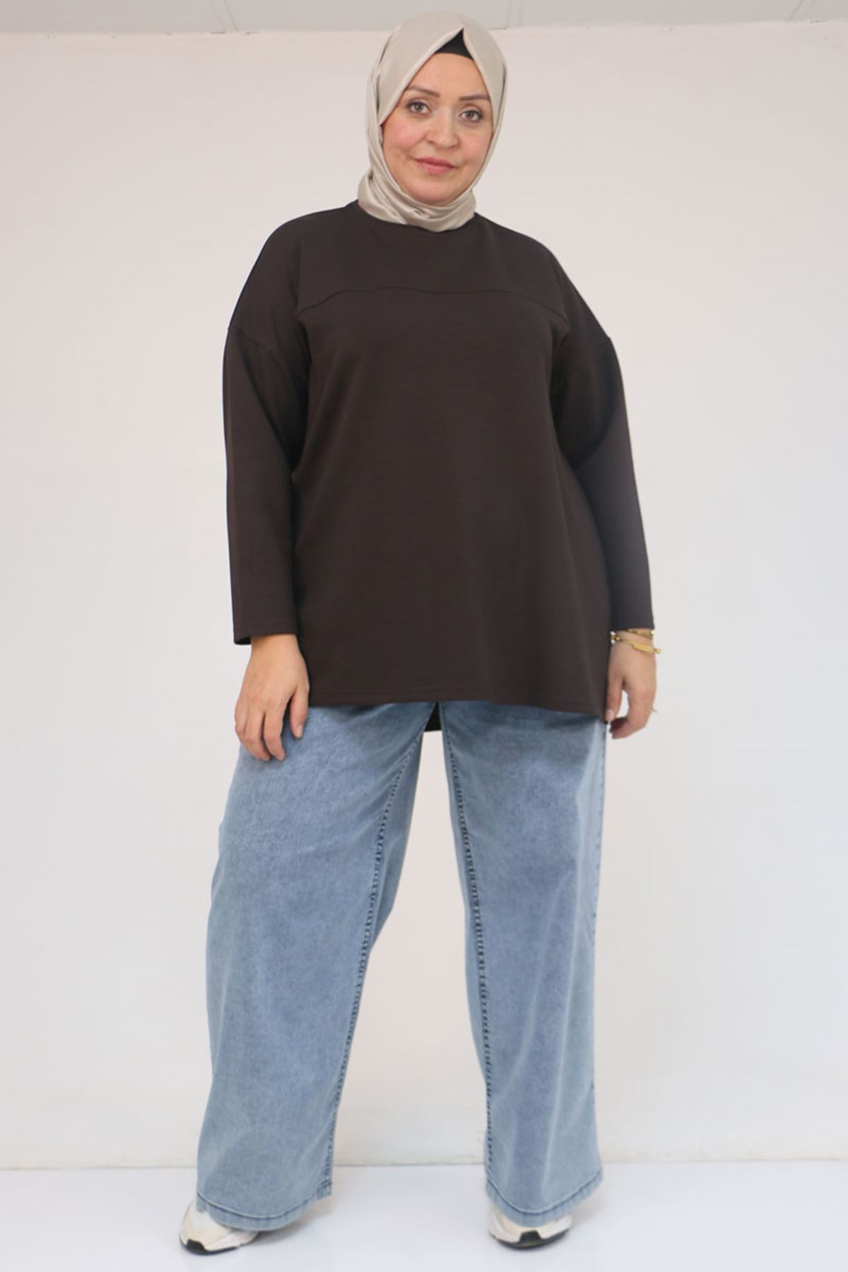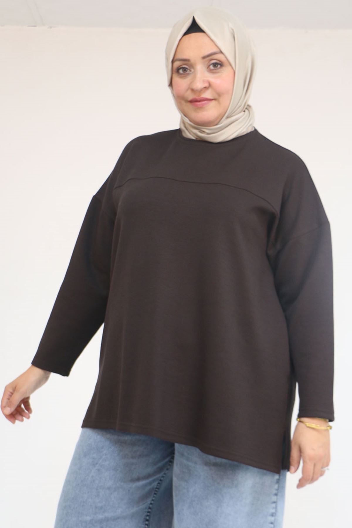 58132 Büyük Beden Önü Çıma Detaylı Yanı Yırtmaçlı Modal Tunik - Kahve