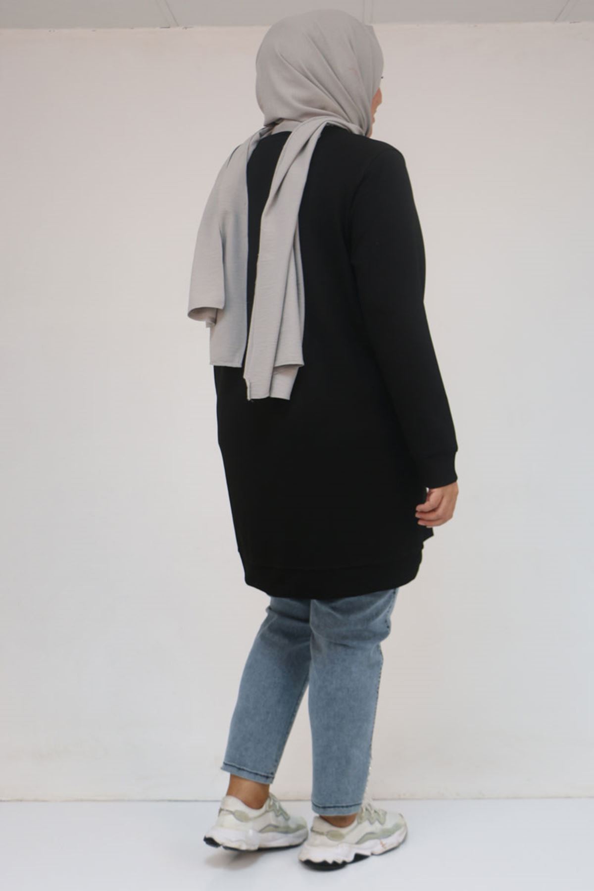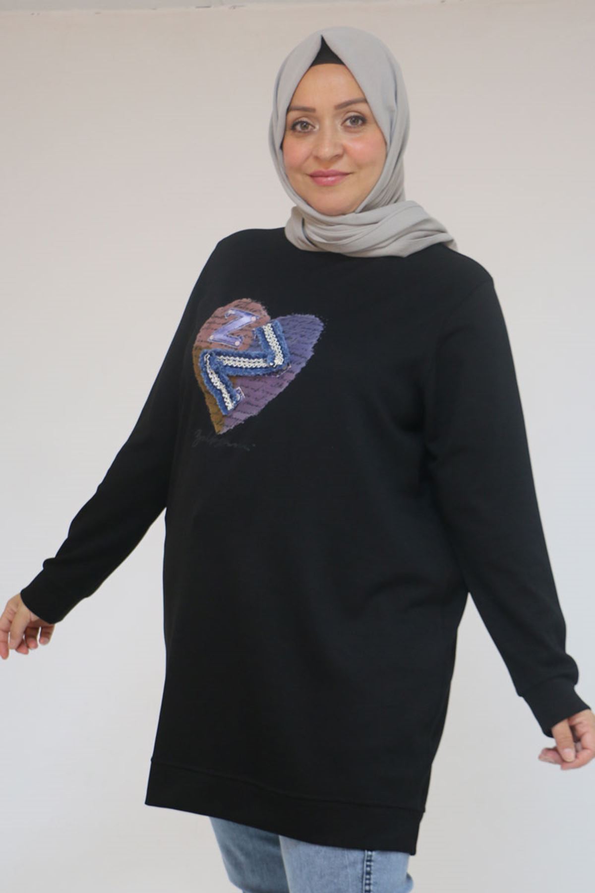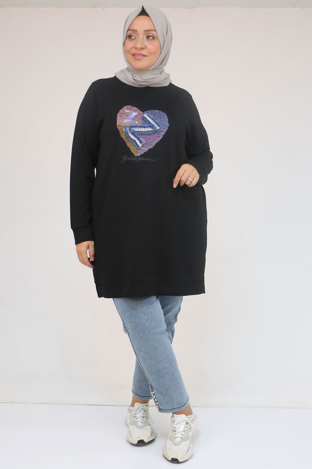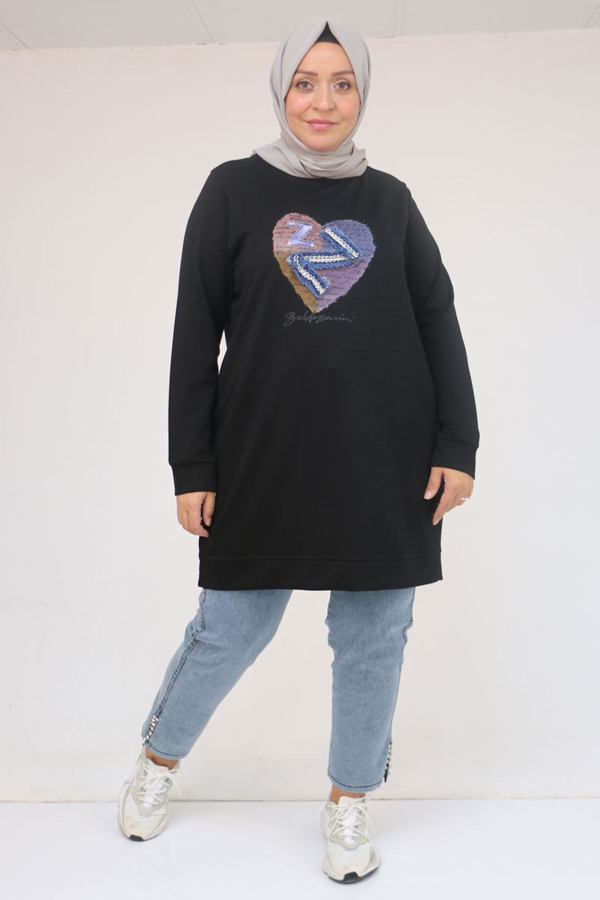 58141 Büyük Beden Önünde Kalp Baskılı Modal Tunik - Siyah