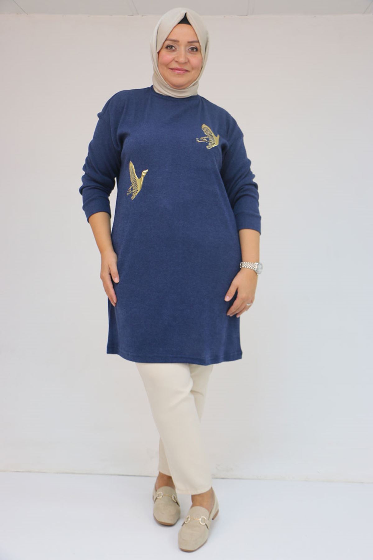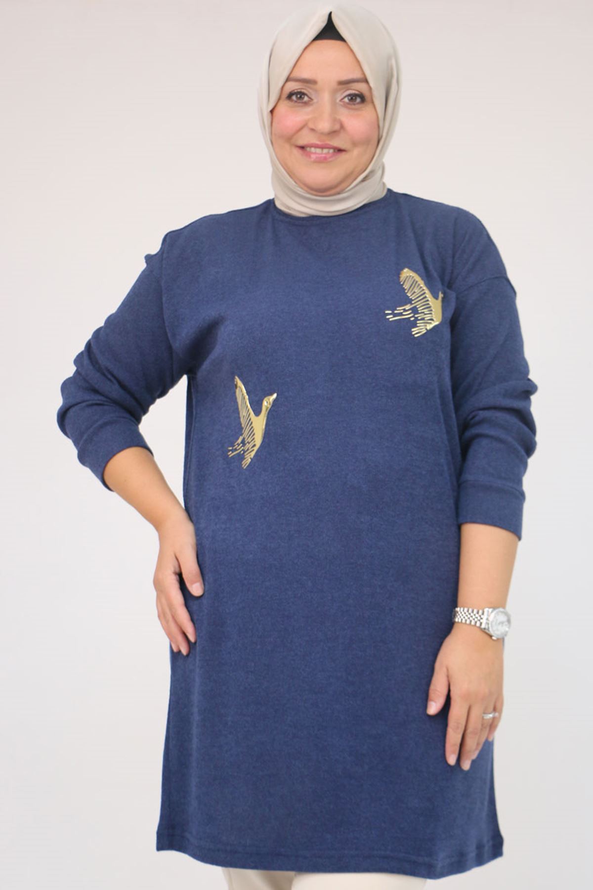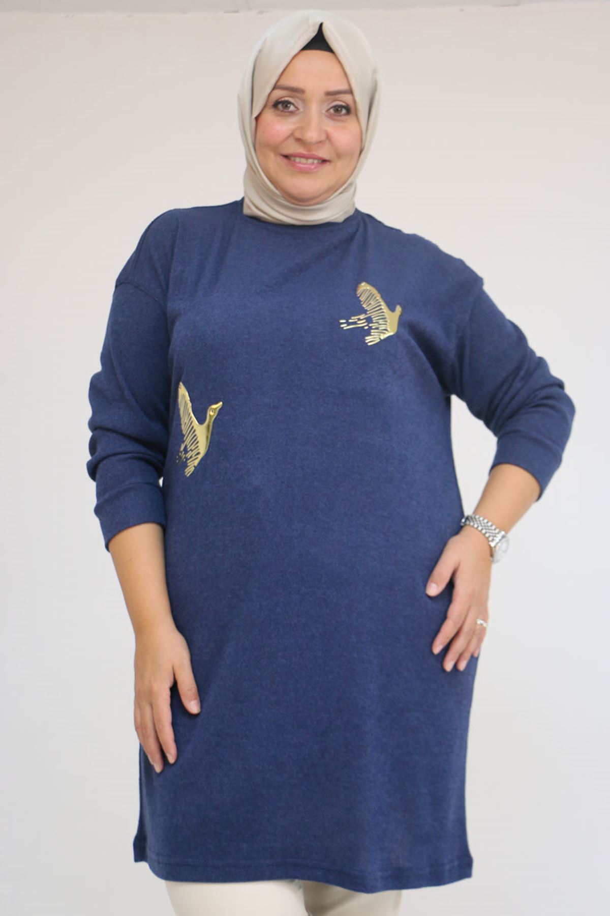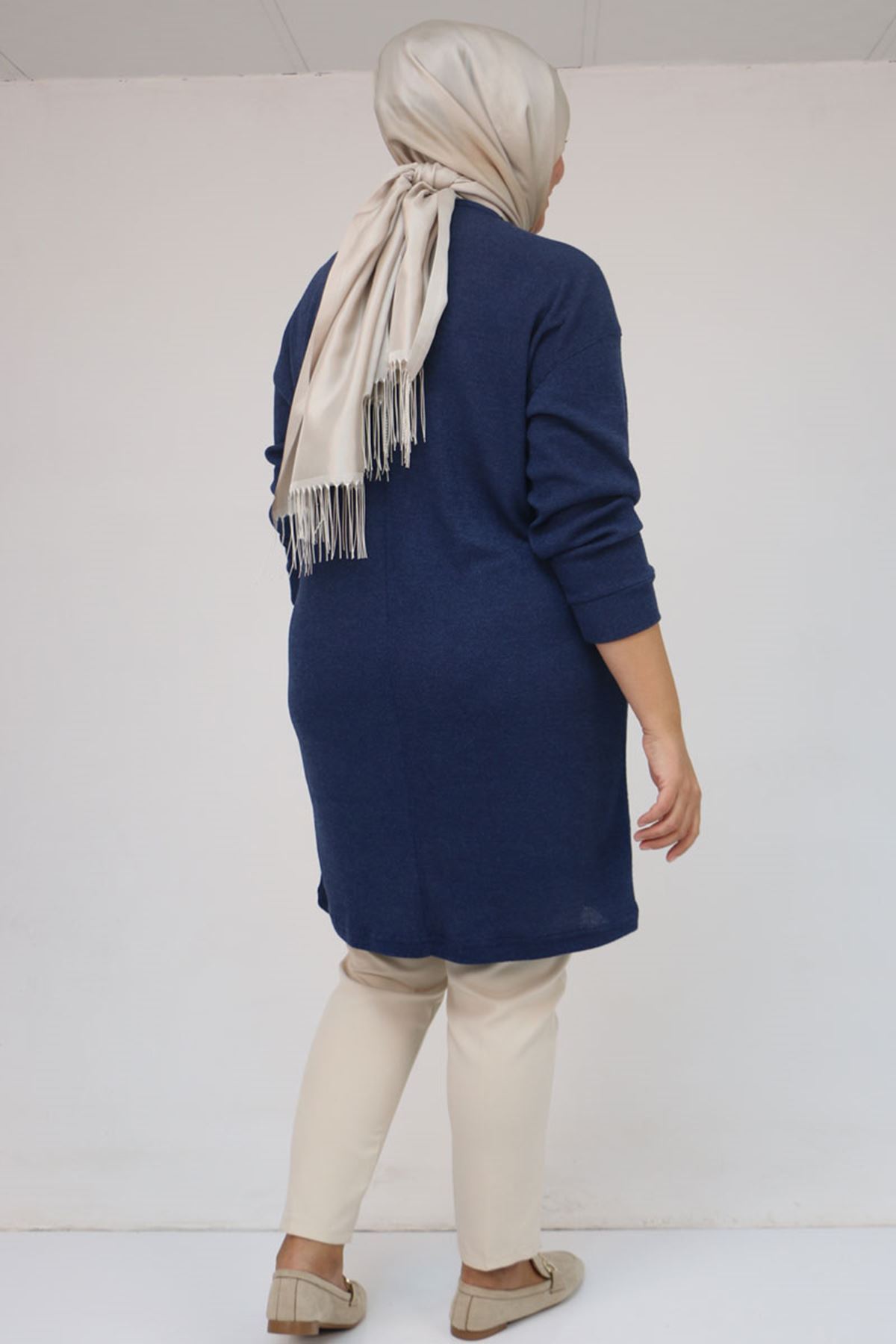 58143 Büyük Beden Düşük Kollu Aksesuar Detaylı Mir Tunik - İndigo