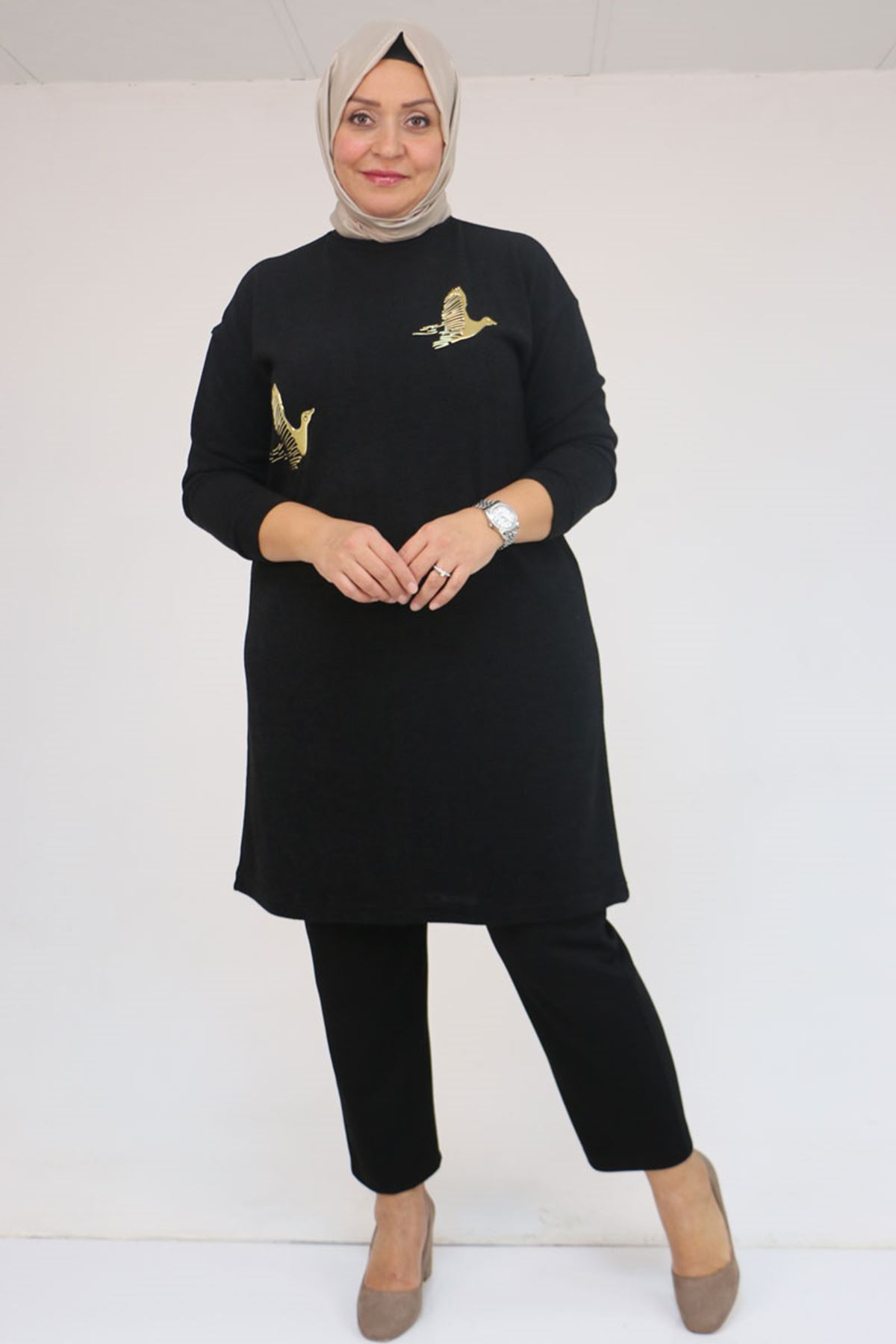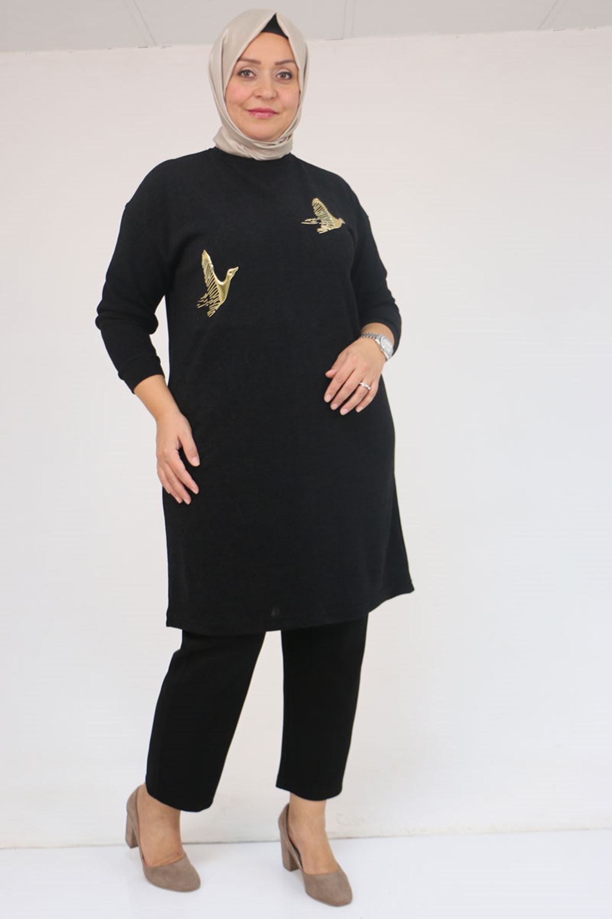 58143 Büyük Beden Düşük Kollu Aksesuar Detaylı Mir Tunik - Siyah