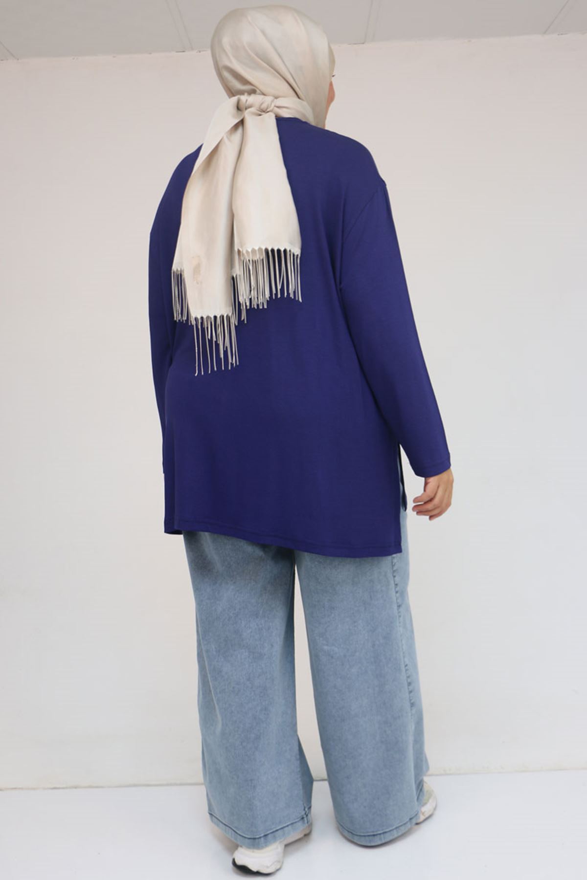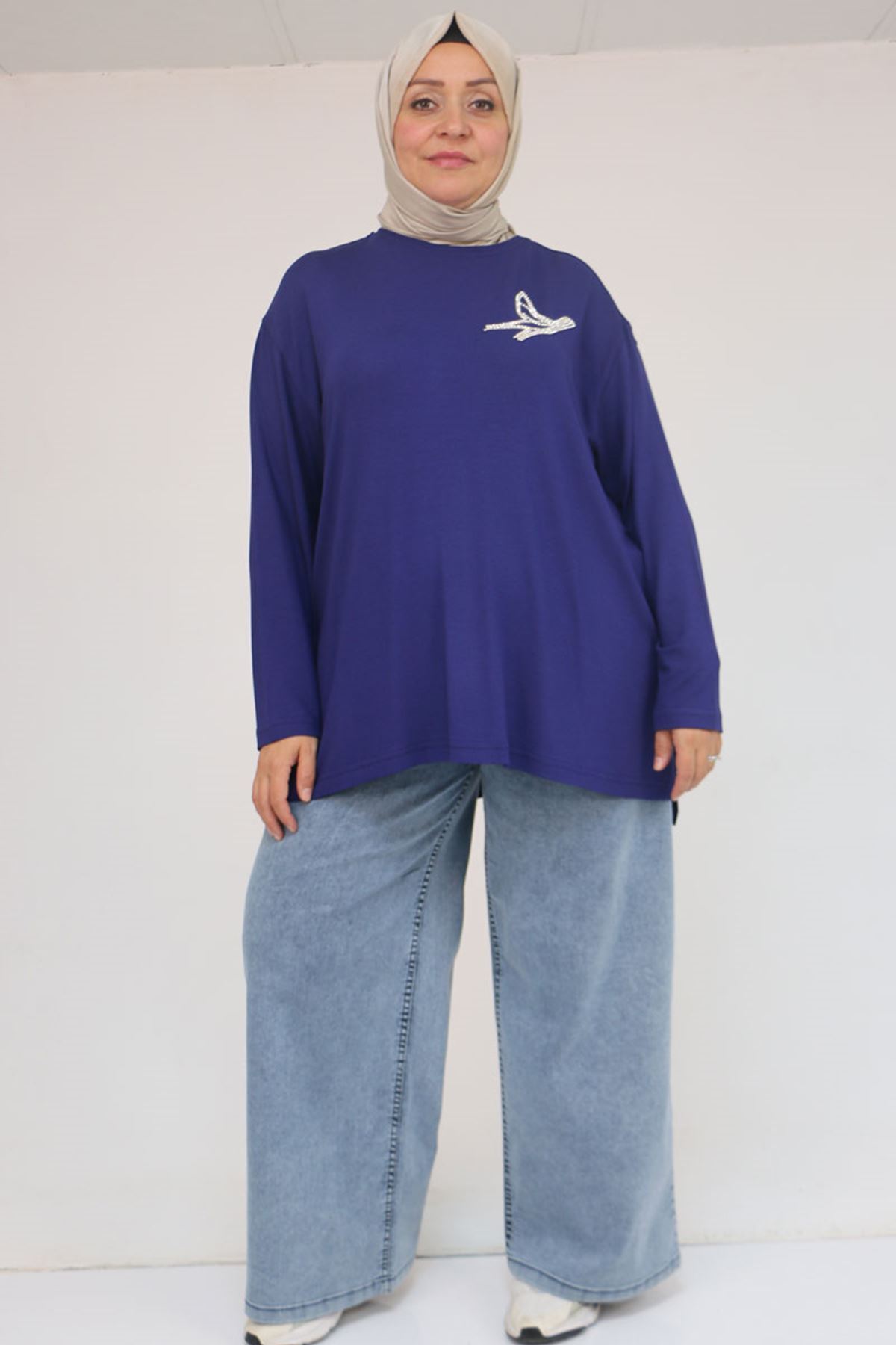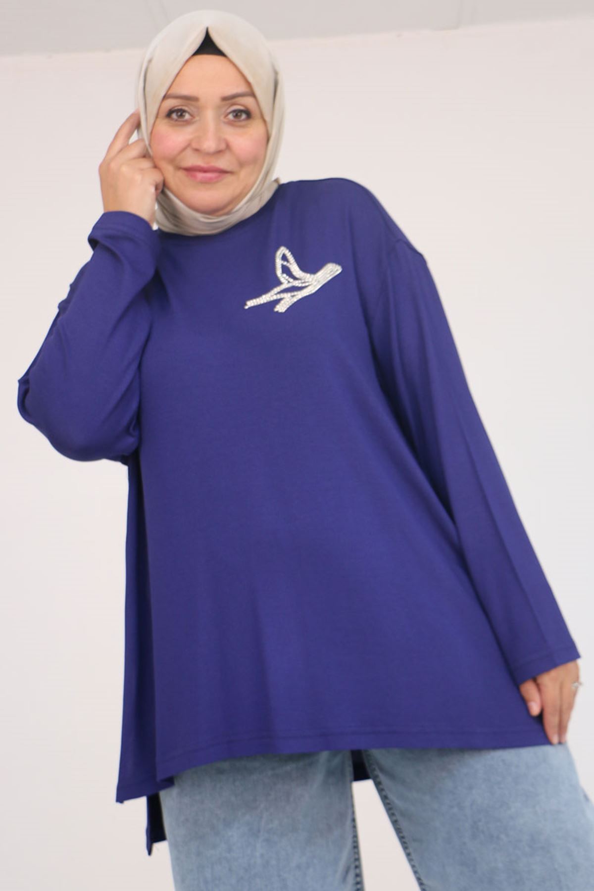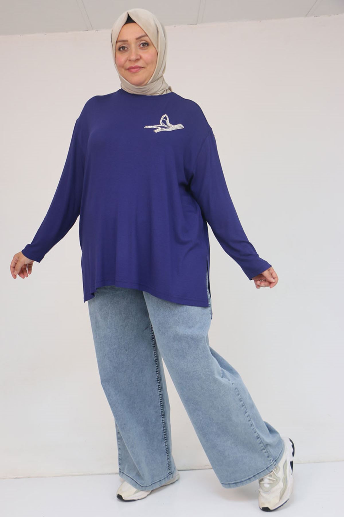 58149 Büyük Beden Taş Baskı Detaylı Çilek Tunik - İndigo