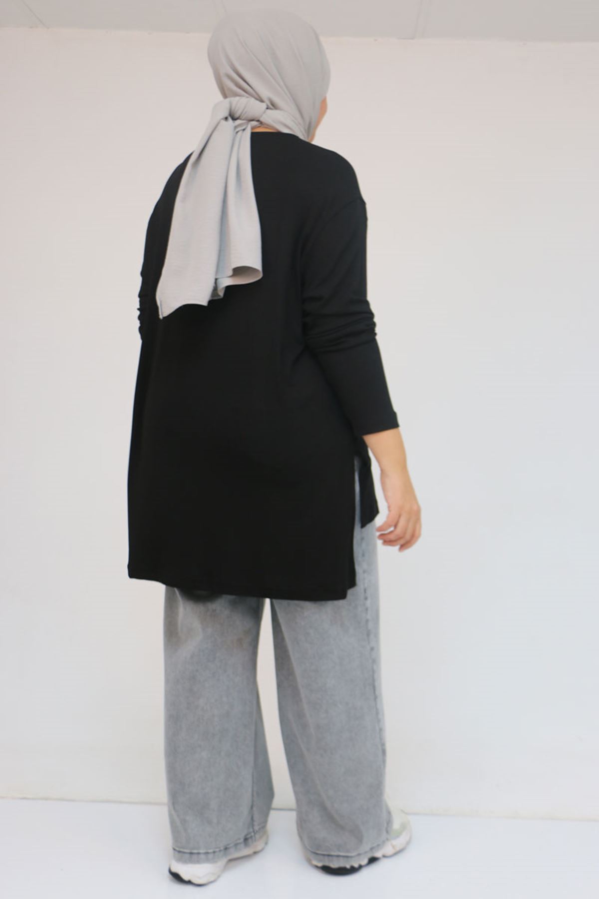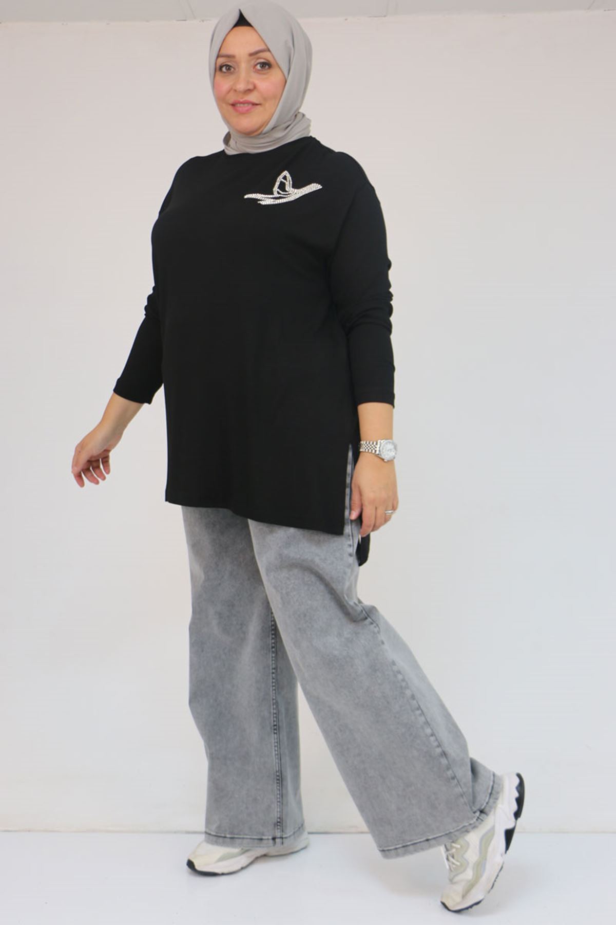 58149 Büyük Beden Taş Baskı Detaylı Çilek Tunik - Siyah