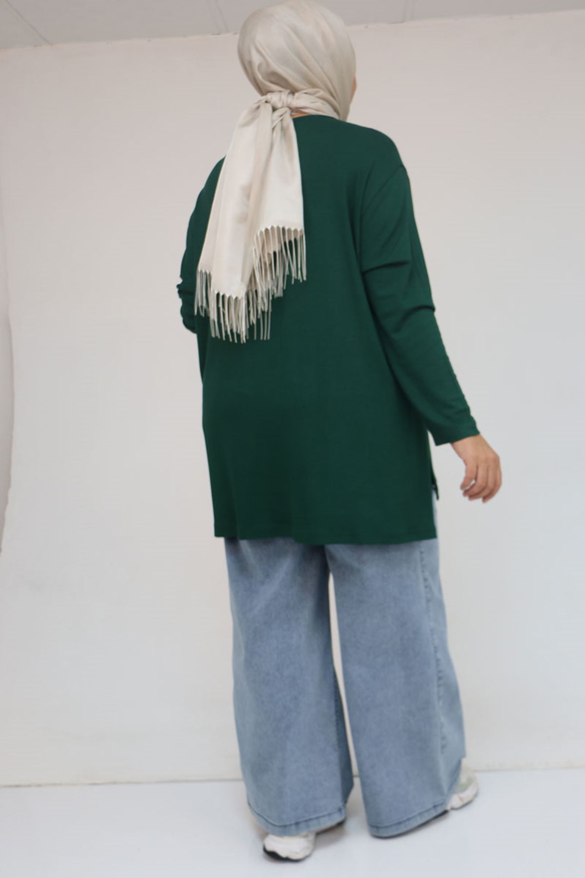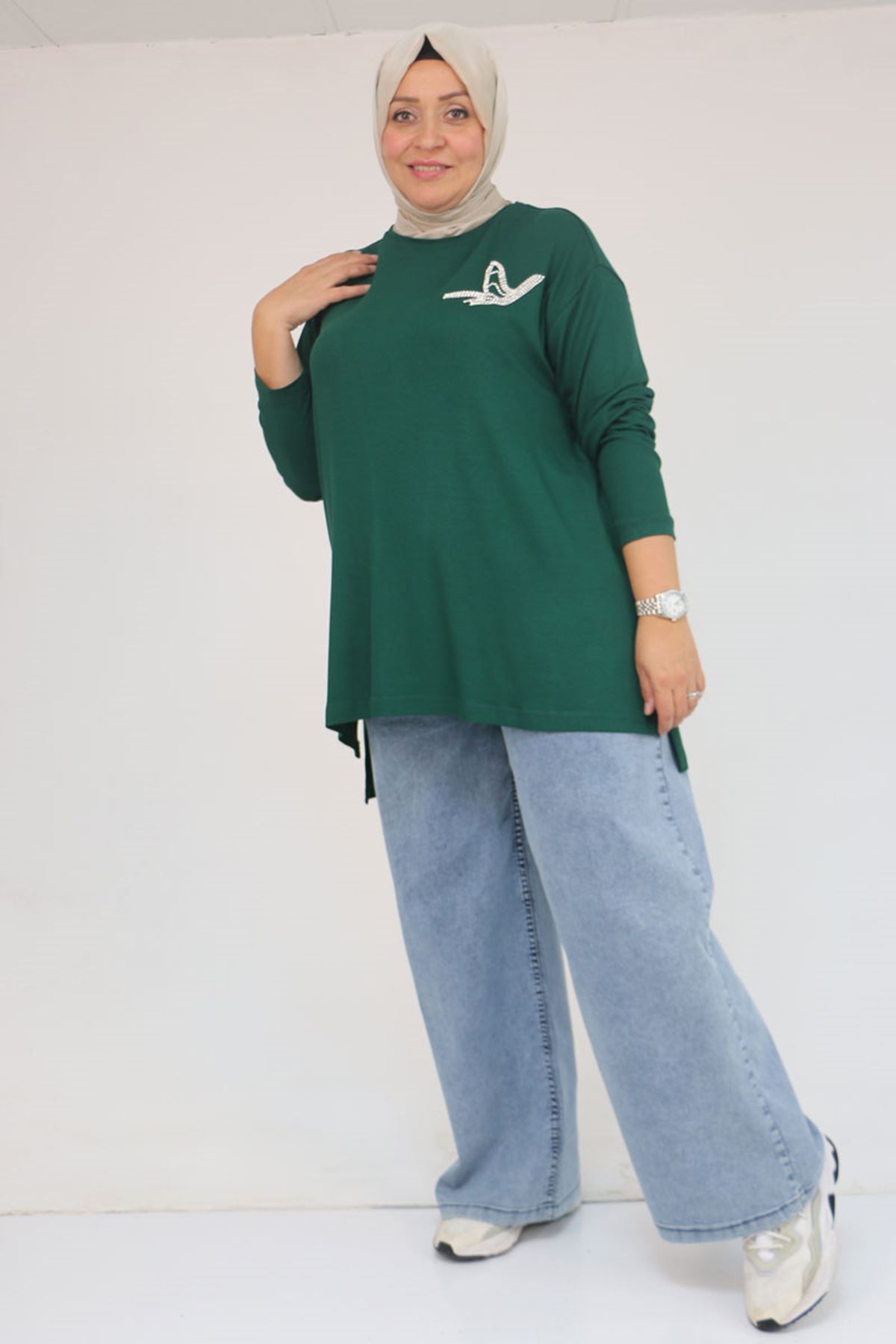 58149 Büyük Beden Taş Baskı Detaylı Çilek Tunik - Zümrüt