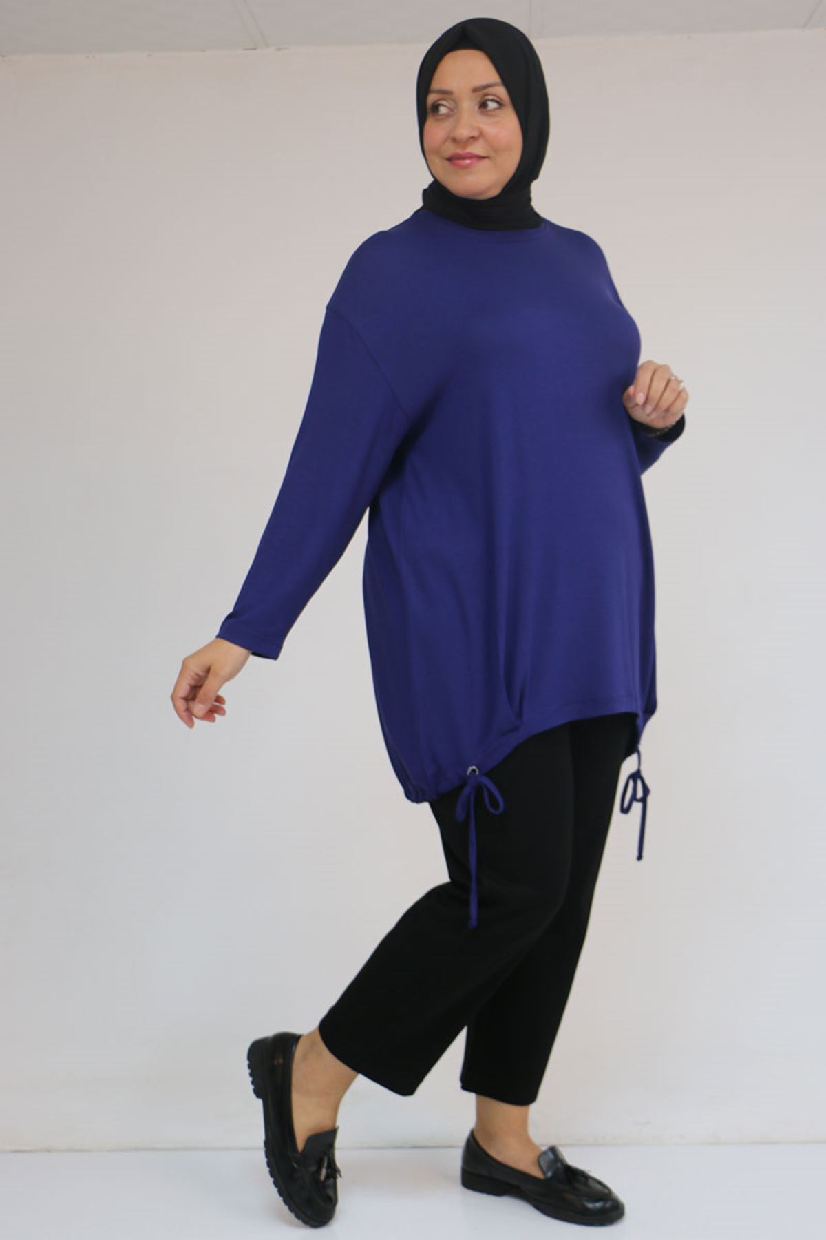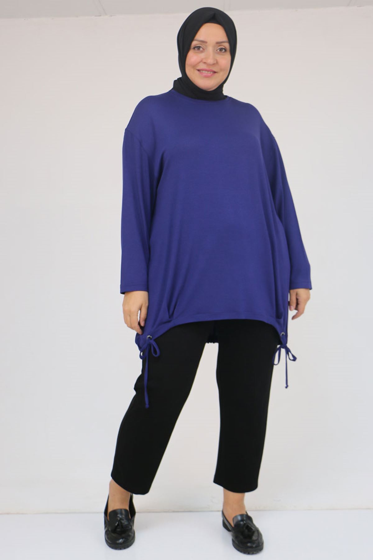 58150 Büyük Beden Kuş Gözü Bağlama Detaylı Çilek Tunik - İndigo
