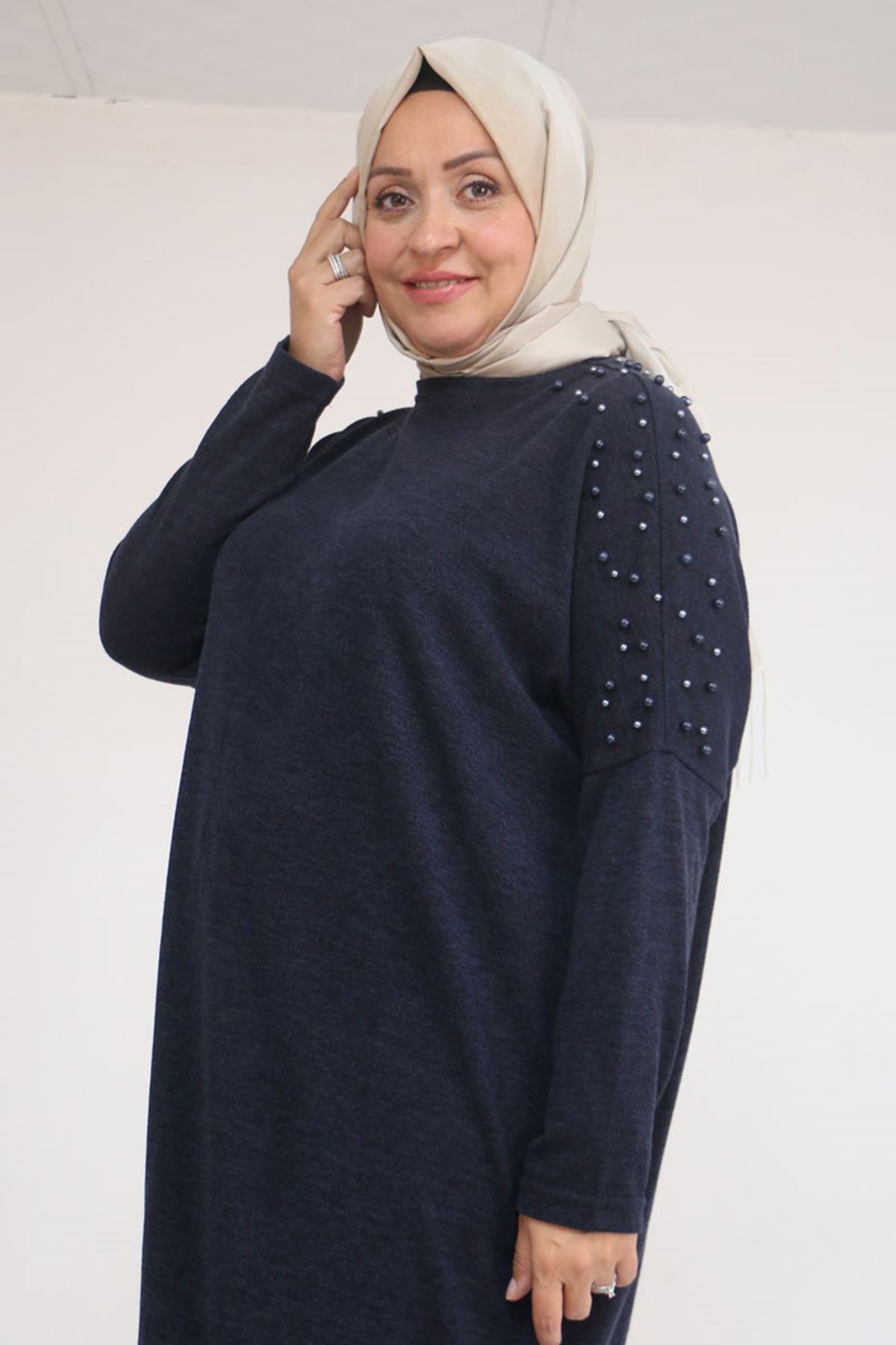 58152 Büyük Beden Düşükkol Omzu Taş Detaylı Mir Tunik - Lacivert