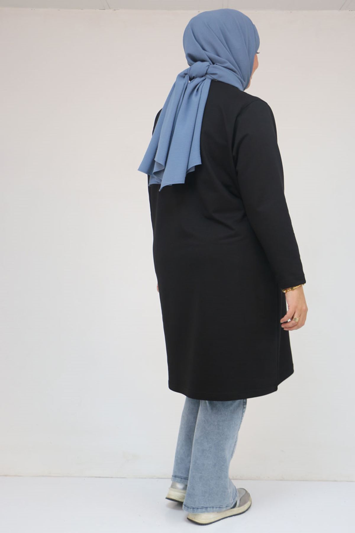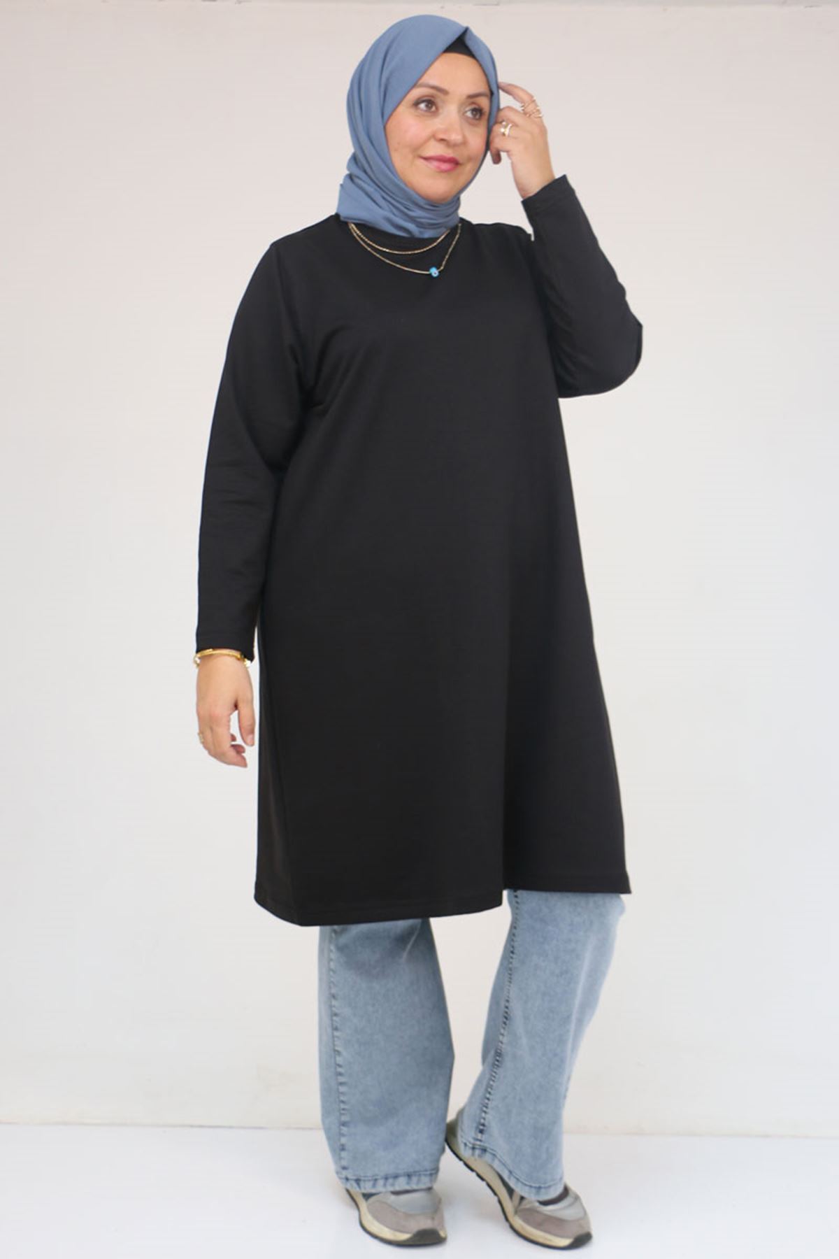 58154 Büyük Beden Yakası Biyeli İki İplik Tunik - Siyah