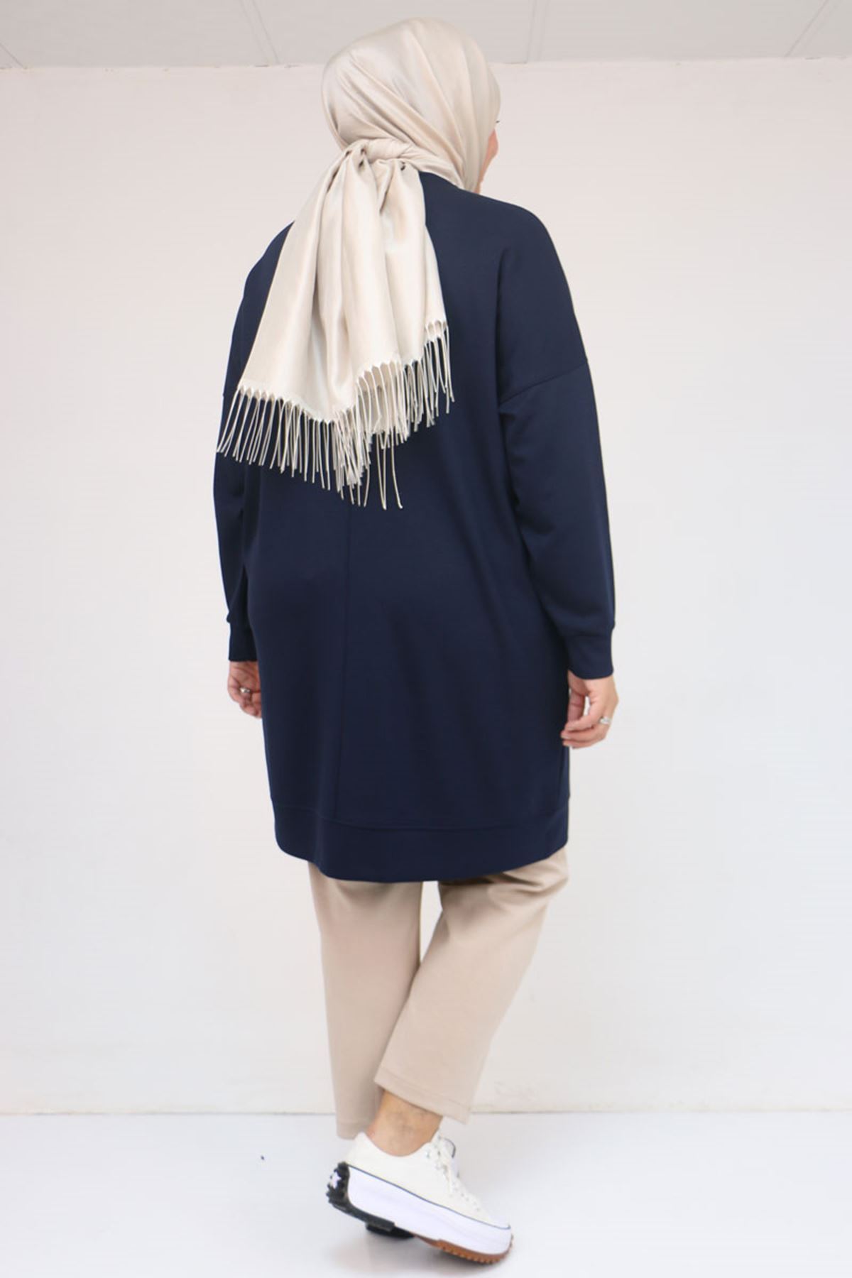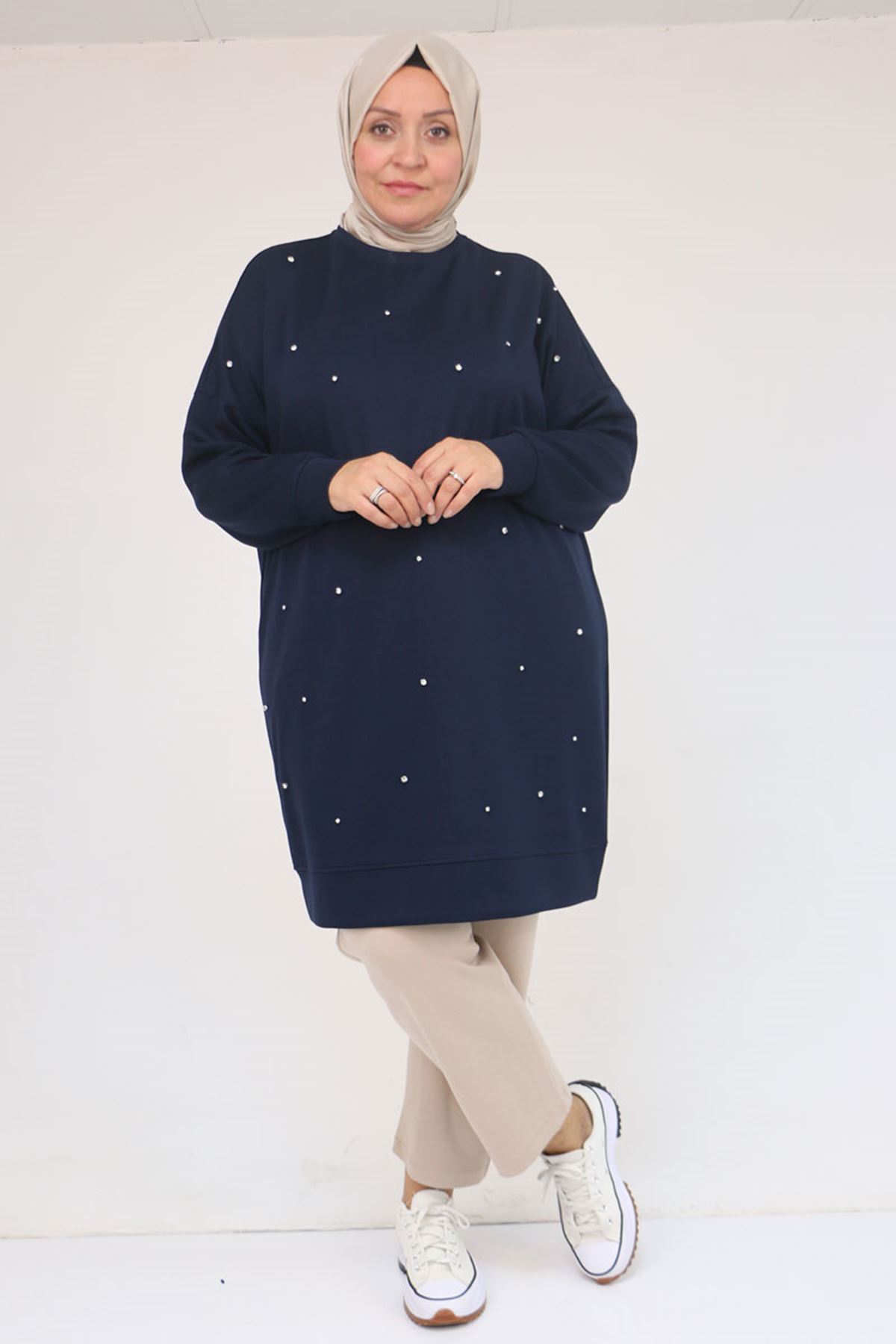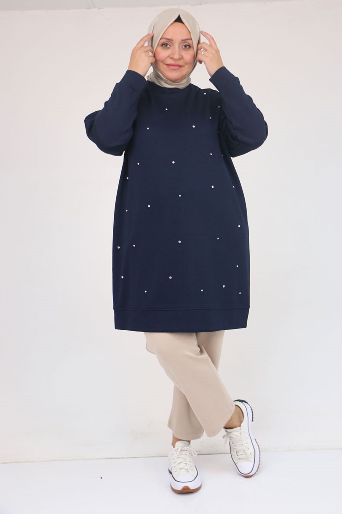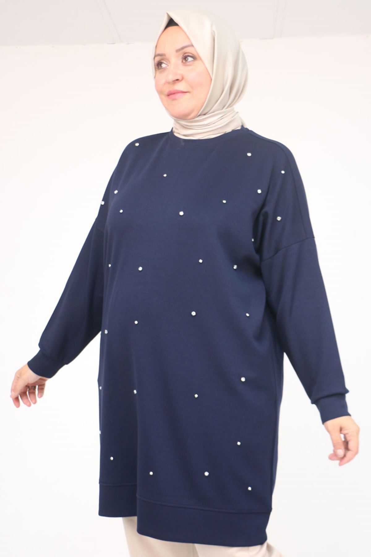 58157 Büyük Beden Beyoğlu Taş Çakmalı Modal Tunik - Lacivert