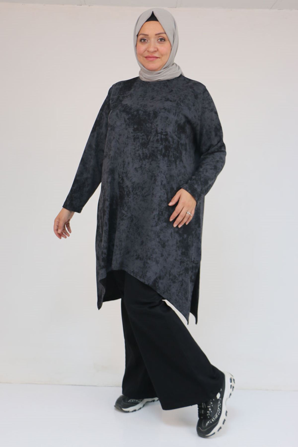 58163 Büyük Beden Eteği Simetri Kesim Batik Tunik - Siyah
