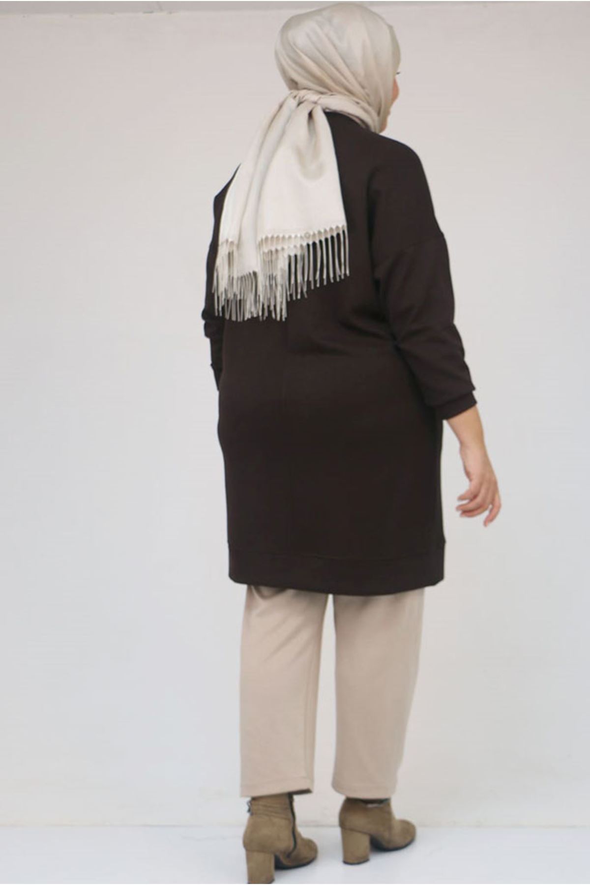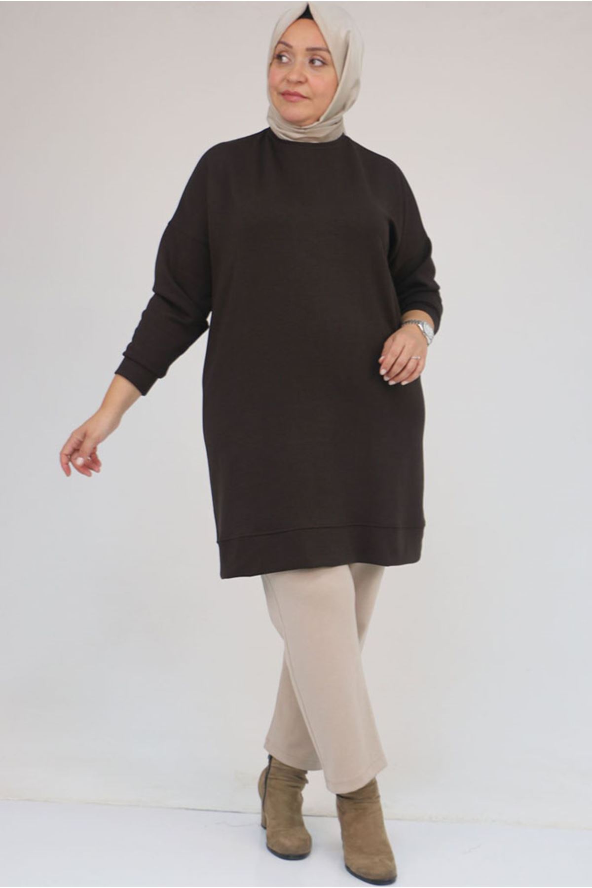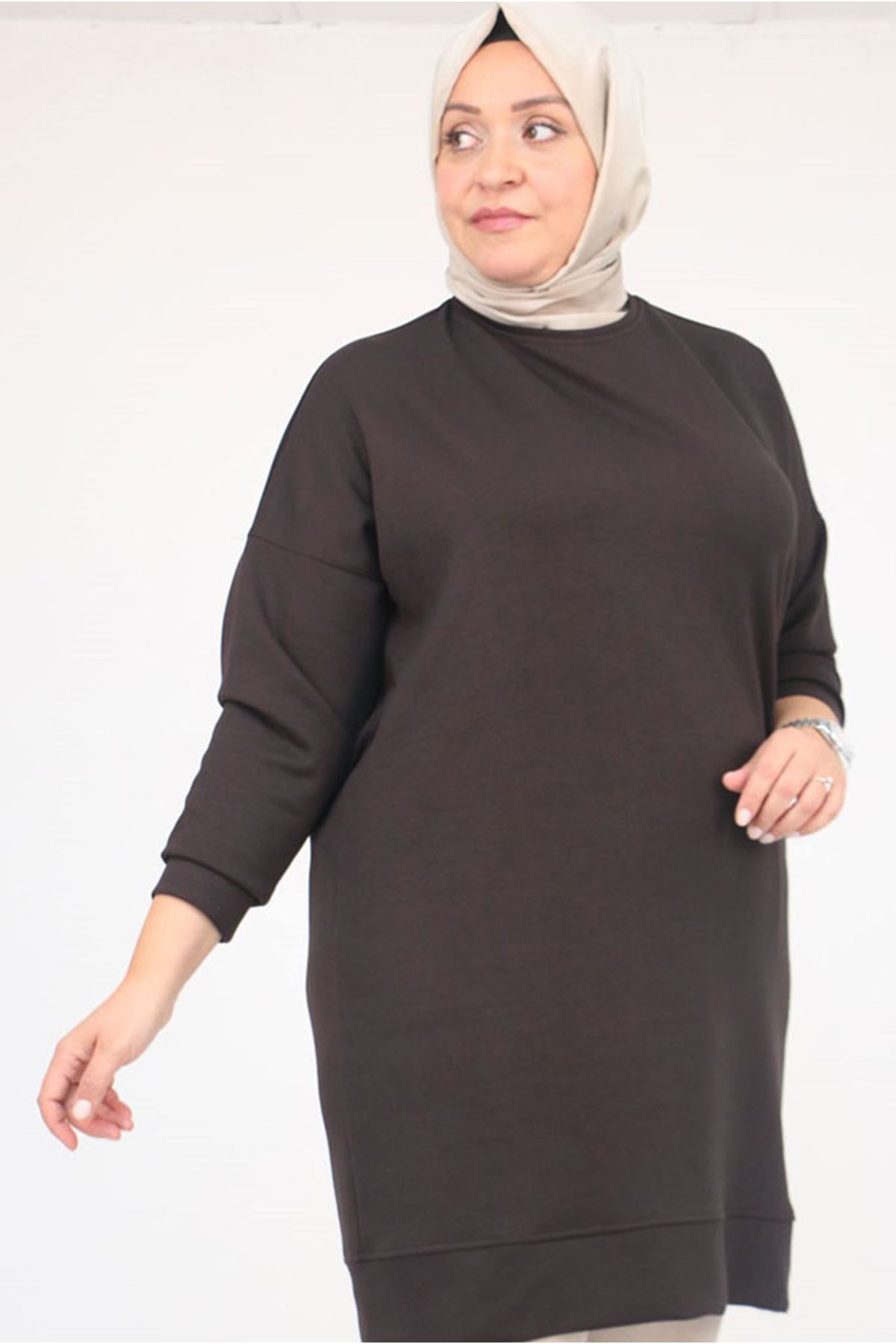 26K58151 - KAHVE - Büyük Beden Kol Ve Etek Ucu Kendinden Ribanalı Modal Tunik