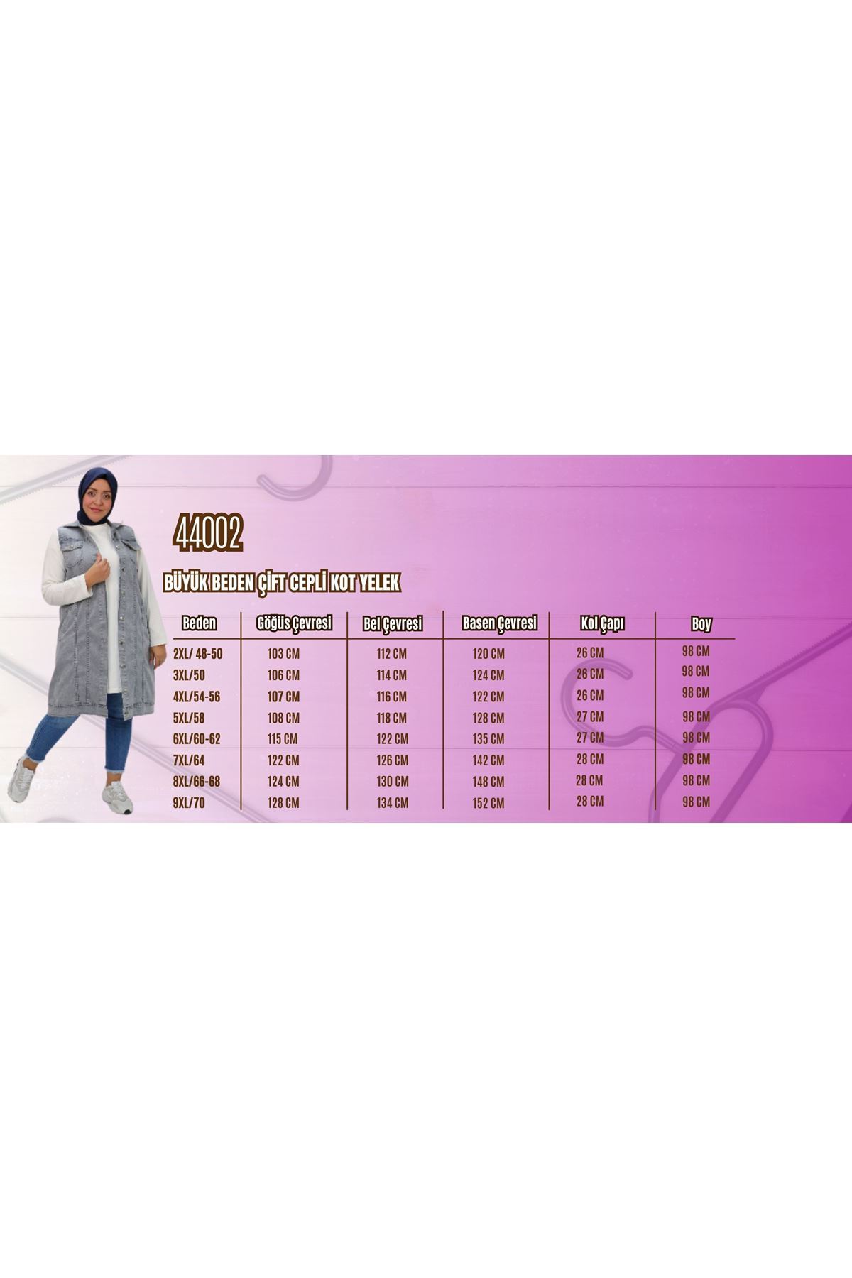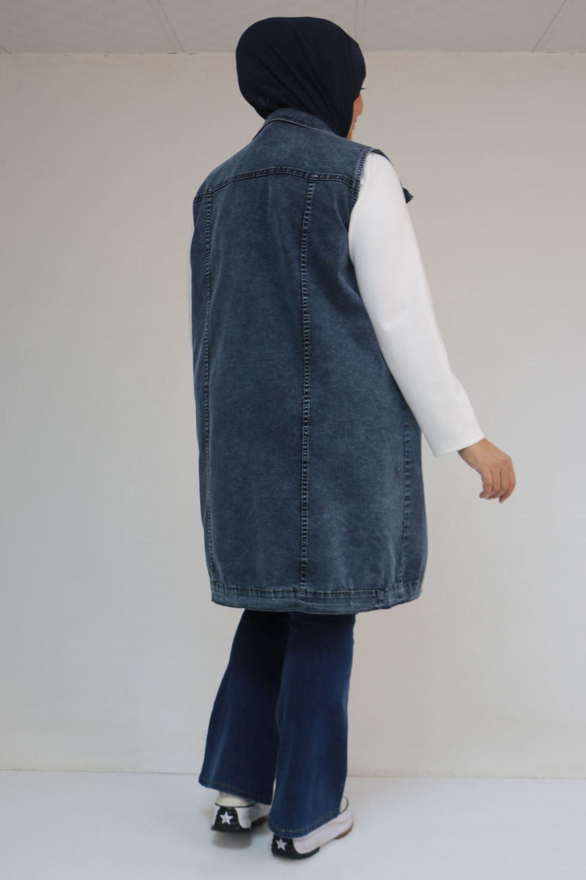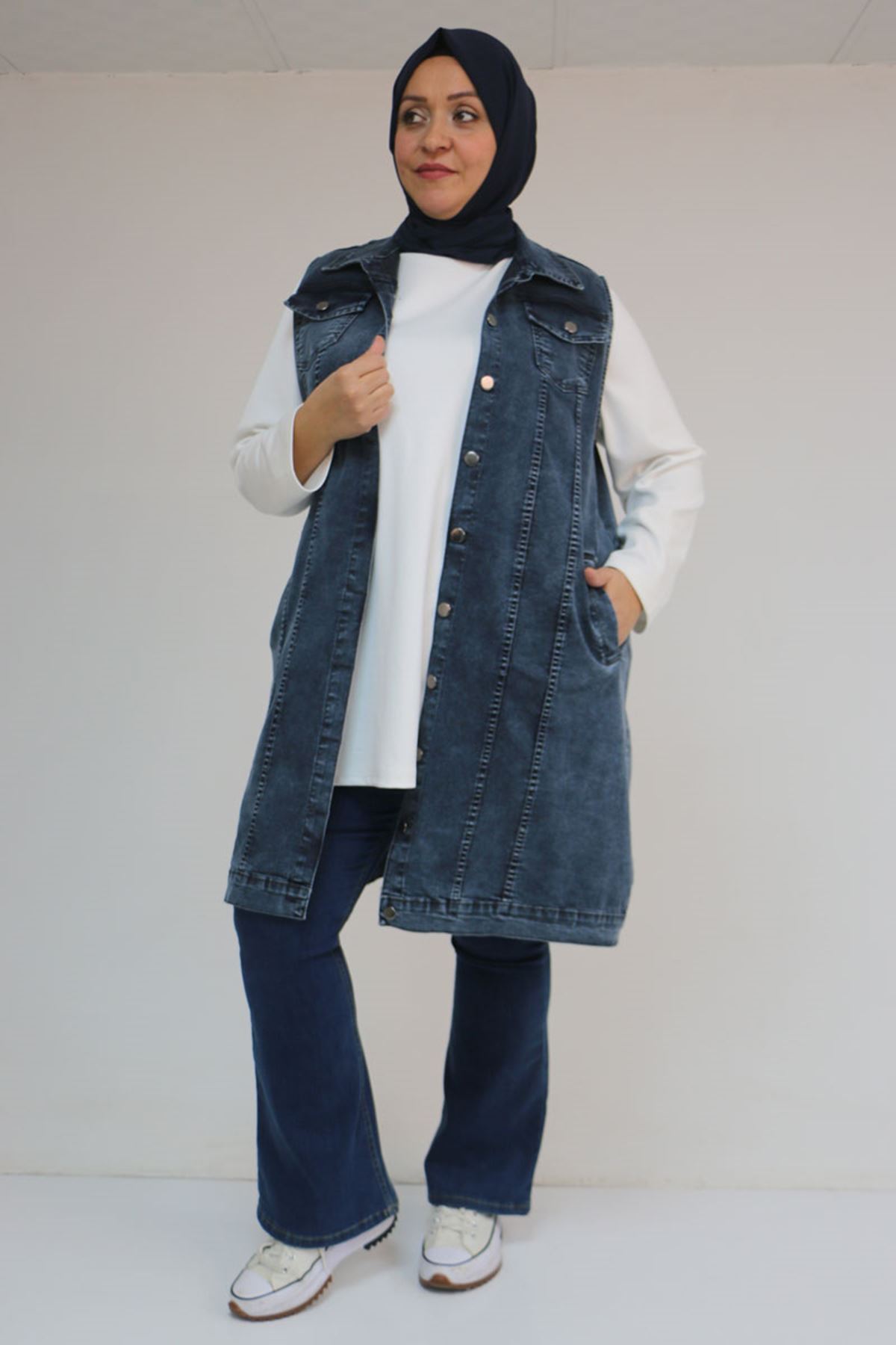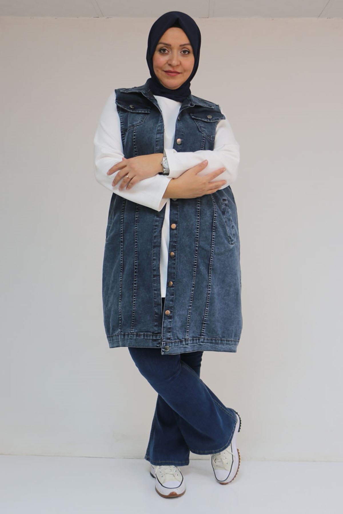 44002 Büyük Beden Çift Cepli Kot Yelek - Kar Yıkama Lacivert