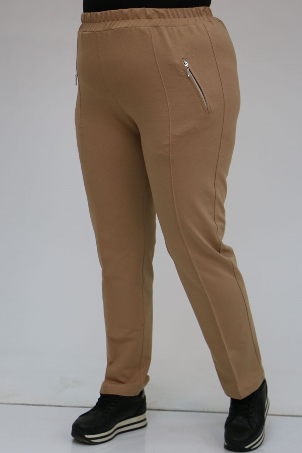 49514 Büyük Beden İki İplik Cepleri Fermuarlı Çimalı Eşofman Altı - Bej